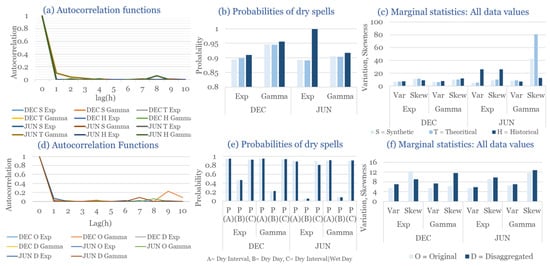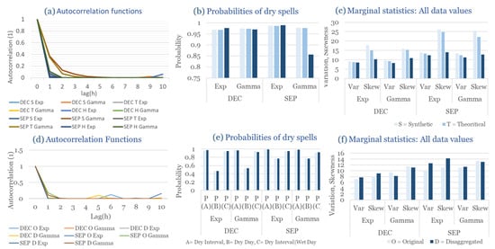 Statistical Characteristics of Corfu, with the intensity of the pulses following both distributions (December and July combined): (a) autocorrelation functions, (b) probabilities of dry spells, (c) variance and skewness. Panels (a–c) include: H = historical (observed data), T = theoretical (analytical RBLRPM expectation from fitted parameters), and S = synthetic (simulated hourly series) and panels (d–f) include: O = Original and D = Disaggregated. Separate curves correspond to Gamma and Exponential pulse-intensity formulations.