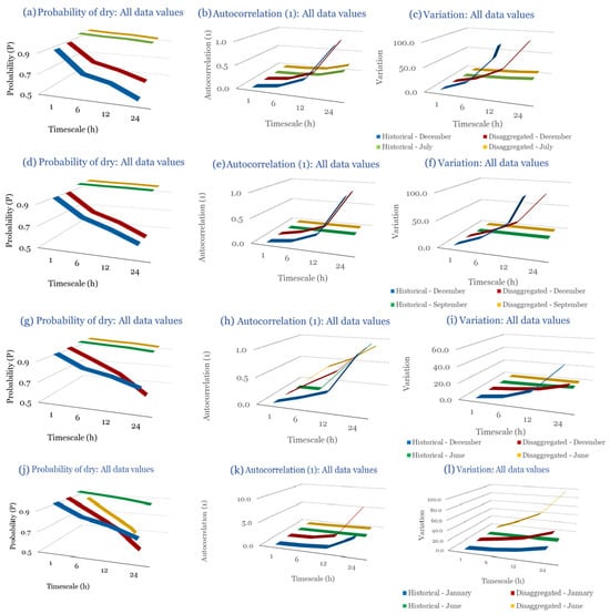 During the wettest month (December), as shown in Figure 5, both pulse–intensity formulations reproduce the observed rainfall characteristics effectively. The exponential formulation performs better in capturing short-term persistence and reproduces the rapid fluctuations observed in hourly rainfall. This outcome reflects the tendency of the exponential model to generate more intense, short rainfall pulses, consistent with the convective dynamics typical of Corfu’s winter storms. The gamma formulation, by contrast, produces a smoother autocorrelation decay, offering a slightly more conservative representation of persistence. Nevertheless, both distributions maintain realistic rainfall structure and clustering.