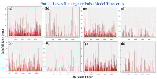 Widespread uses of the Bartlett–Lewis Rectangular Pulse Model (BLRPM) and its extensions have demonstrated the model’s robustness and adaptability across diverse hydrological conditions. For instance, Onof and Wheater employed a Random Parameter BLRPM to model British rainfall, showcasing the model’s ability to capture variability across multiple time scales []. Similarly, Cowpertwait et al. implemented a stochastic point process version of the BLRPM to simulate UK rainfall and validated its performance under single-site configurations []. Smithers et al. applied the BLRPM for design rainfall estimation in South Africa, highlighting its practical utility in engineering contexts []. Ritschel et al. extended the BLRPM to evaluate precipitation extremes and derive intensity–duration–frequency curves in Germany []. Further developments have been proposed by Park et al., who introduced a simplified scheme to enhance the model’s sub-hourly simulation performance, broadening its applicability to finer temporal resolutions []. Collectively, these studies affirm the BLRPM’s effectiveness for stochastic rainfall modeling, particularly in data-scarce environments and design-focused applications.