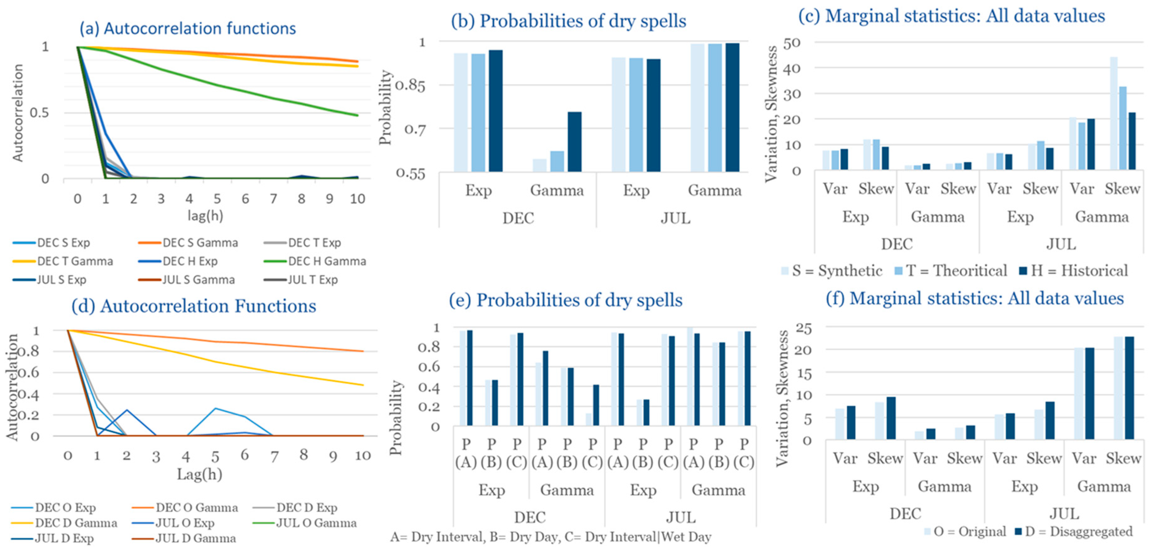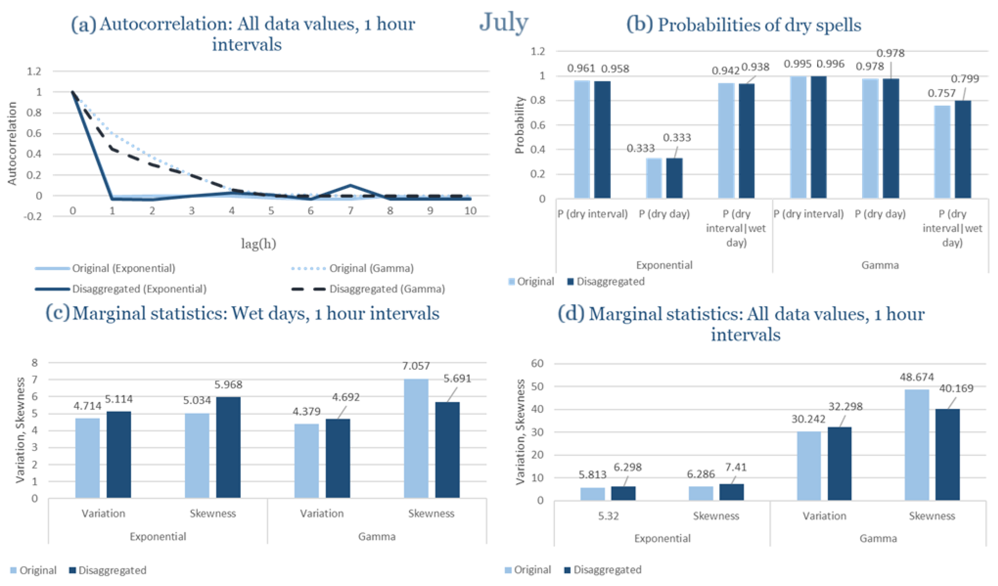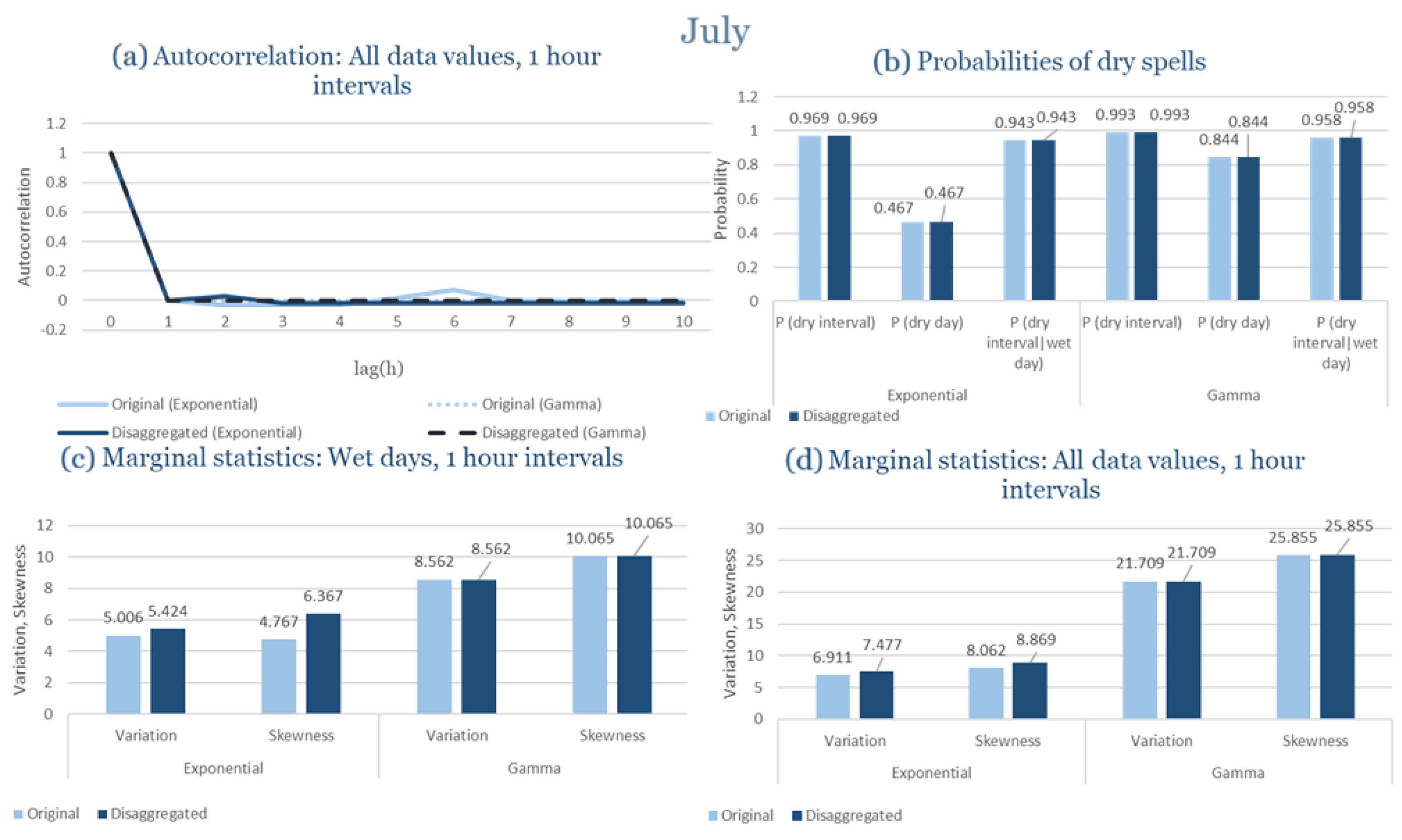 Statistical Characteristics of Alexandroupolis for July, with the intensity of the pulses following both distributions, where: (a) the diagram of the autocorrelation coefficient, (b) the diagrams of the probability of dry during a dry hour, a dry day and a dry hour||rainy day respectively, (c) the plots for the coefficient of variation and the coefficient of skewness of rainy days and (d) the plots for the coefficient of variation and the coefficient skewness for all data of the respective disagreggated time series.