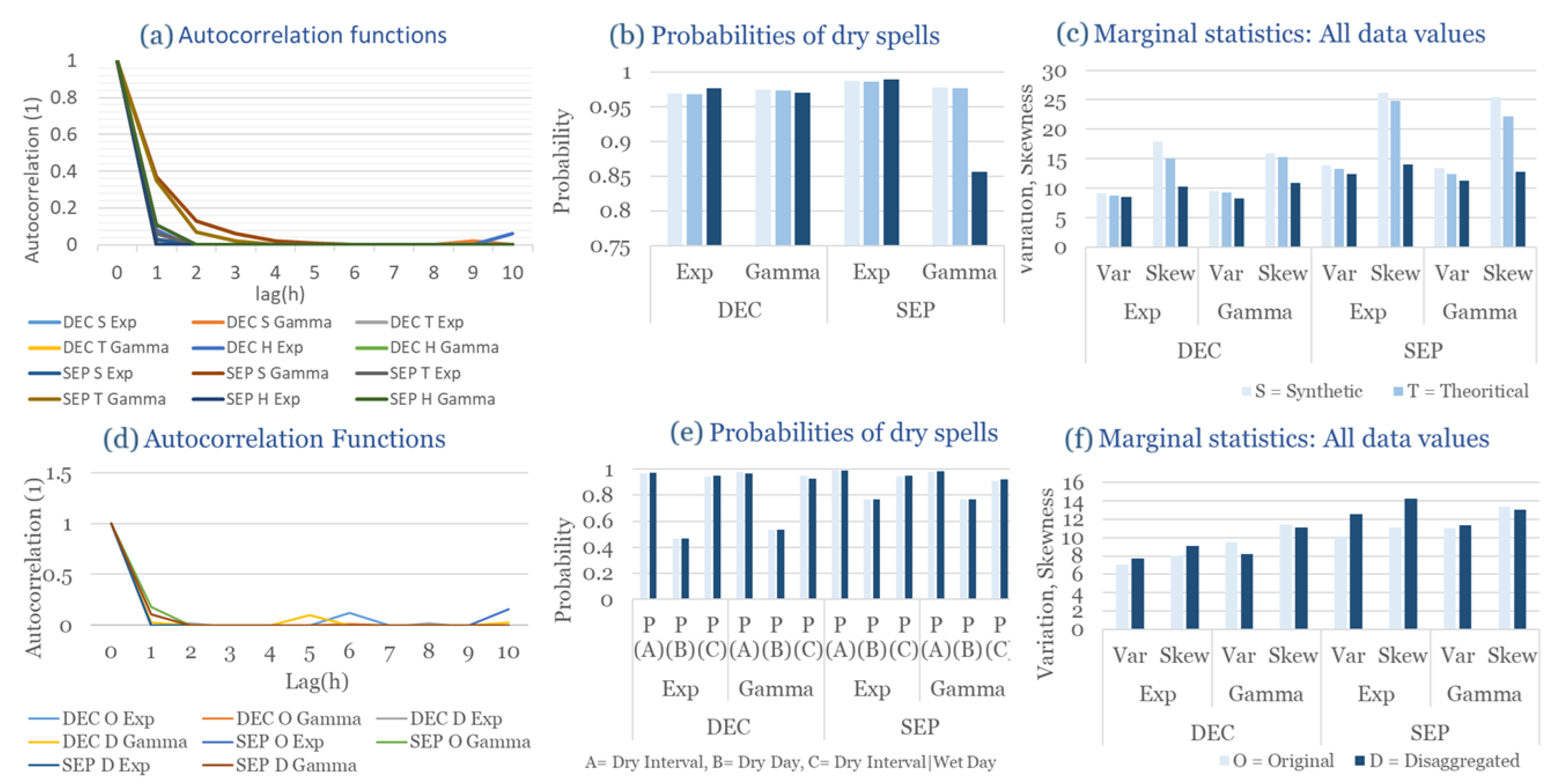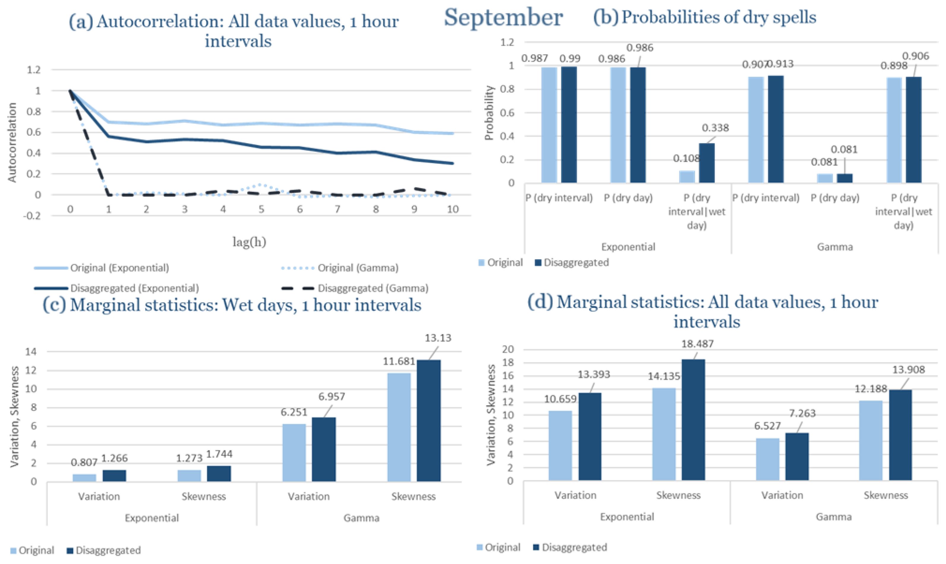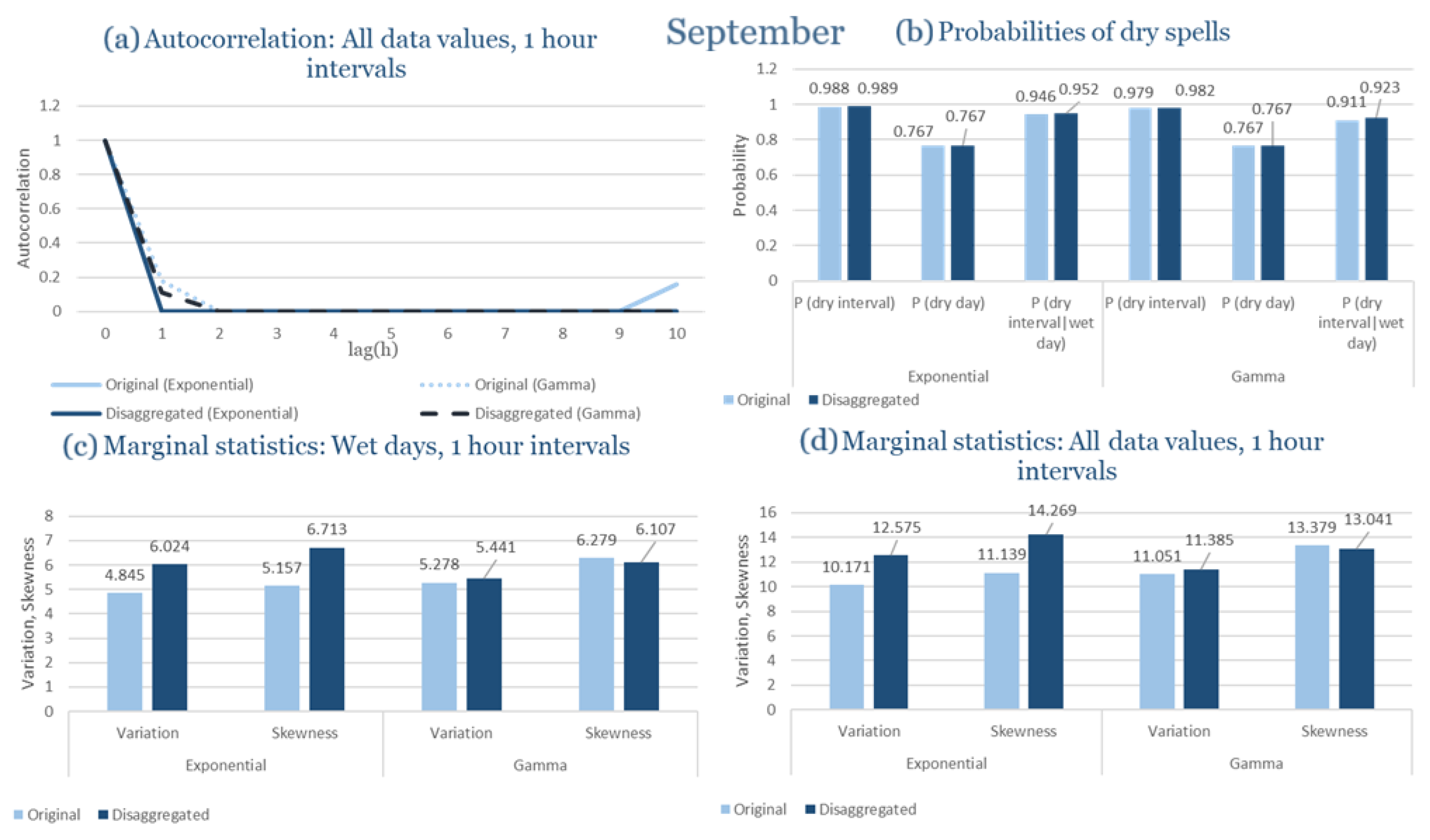 Statistical Characteristics of Alexandroupolis for September, with the intensity of the pulses following both distributions, where: (a) the diagram of the autocorrelation coefficient, (b) the diagrams of the probability of dry during a dry hour, a dry day and a dry hour||rainy day respectively, (c) the plots for the coefficient of variation and the coefficient of skewness of rainy days and (d) the plots for the coefficient of variation and the coefficient skewness for all data of the respective disagreggated time series.