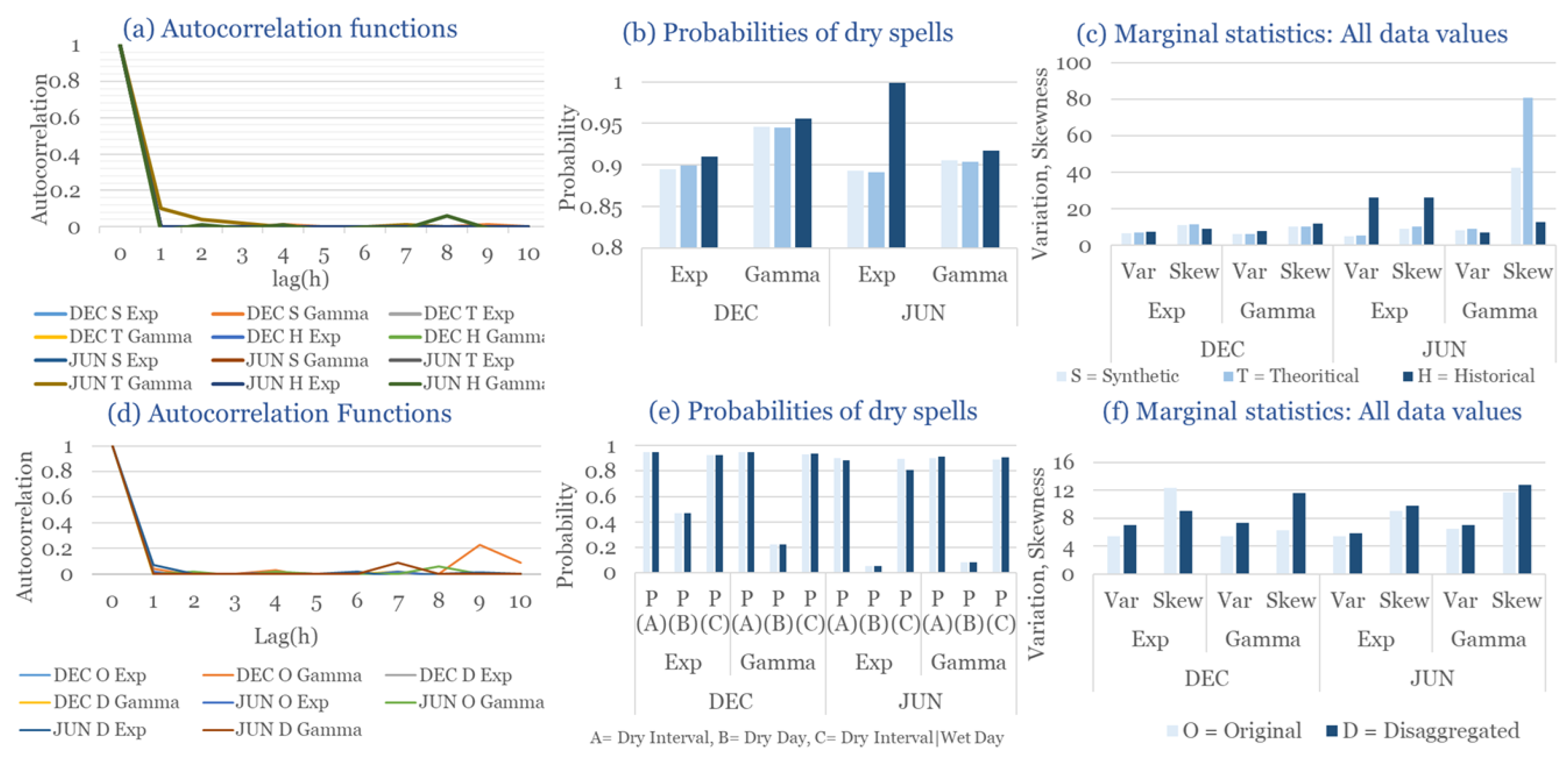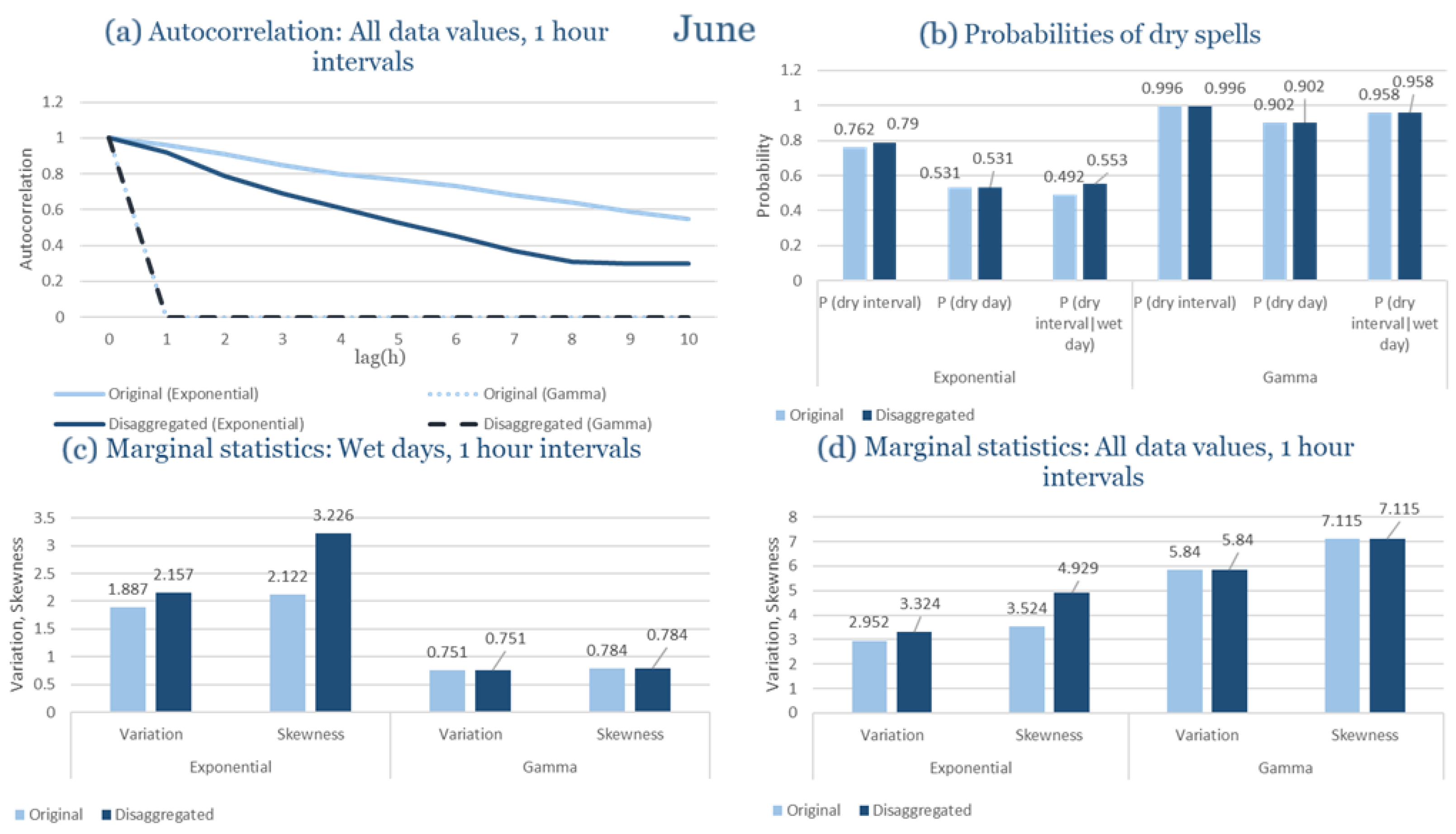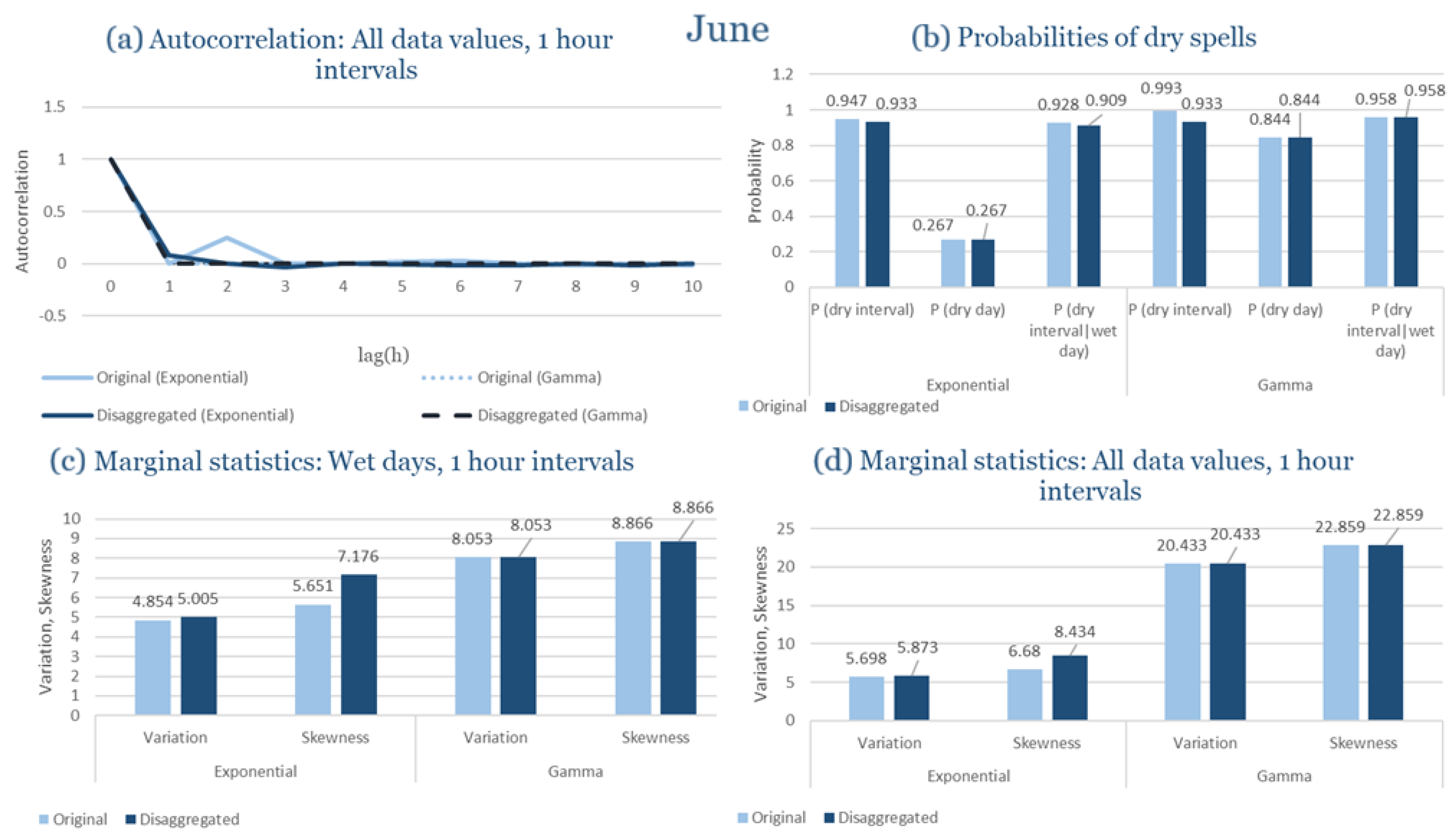 Statistical Characteristics of Alexandroupolis for June, with the intensity of the pulses following both distributions, where: (a) the diagram of the autocorrelation coefficient, (b) the diagrams of the probability of dry during a dry hour, a dry day and a dry hour||rainy day respectively, (c) the plots for the coefficient of variation and the coefficient of skewness of rainy days and (d) the plots for the coefficient of variation and the coefficient skewness for all data of the respective disagreggated time series.