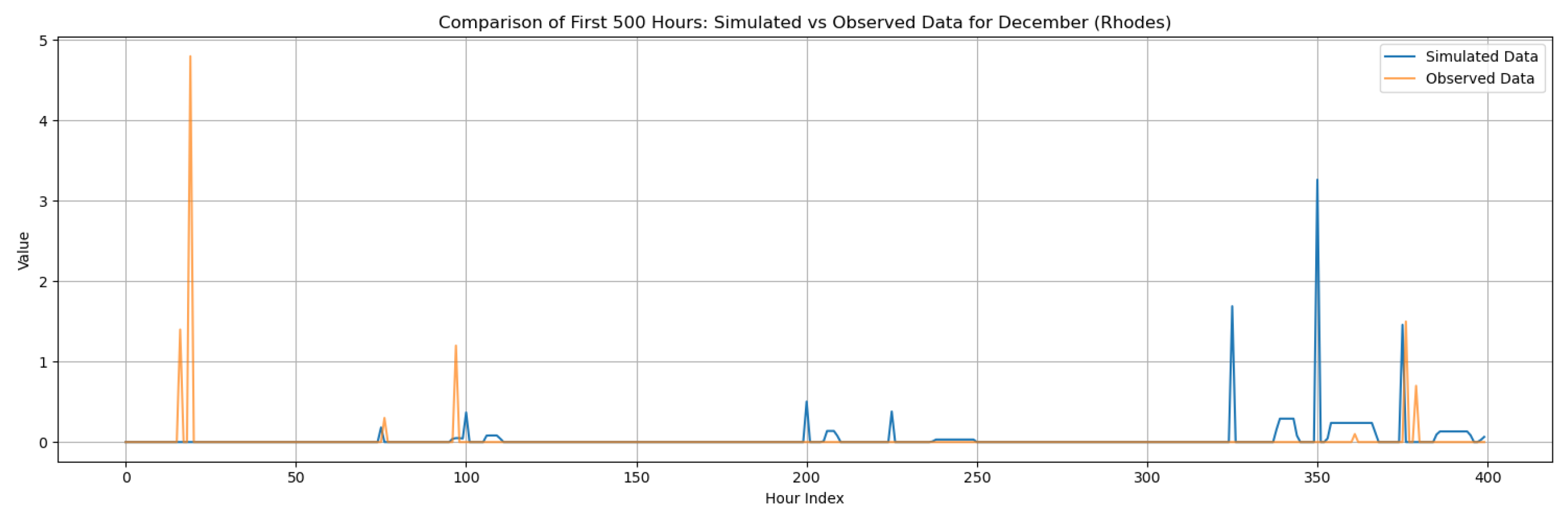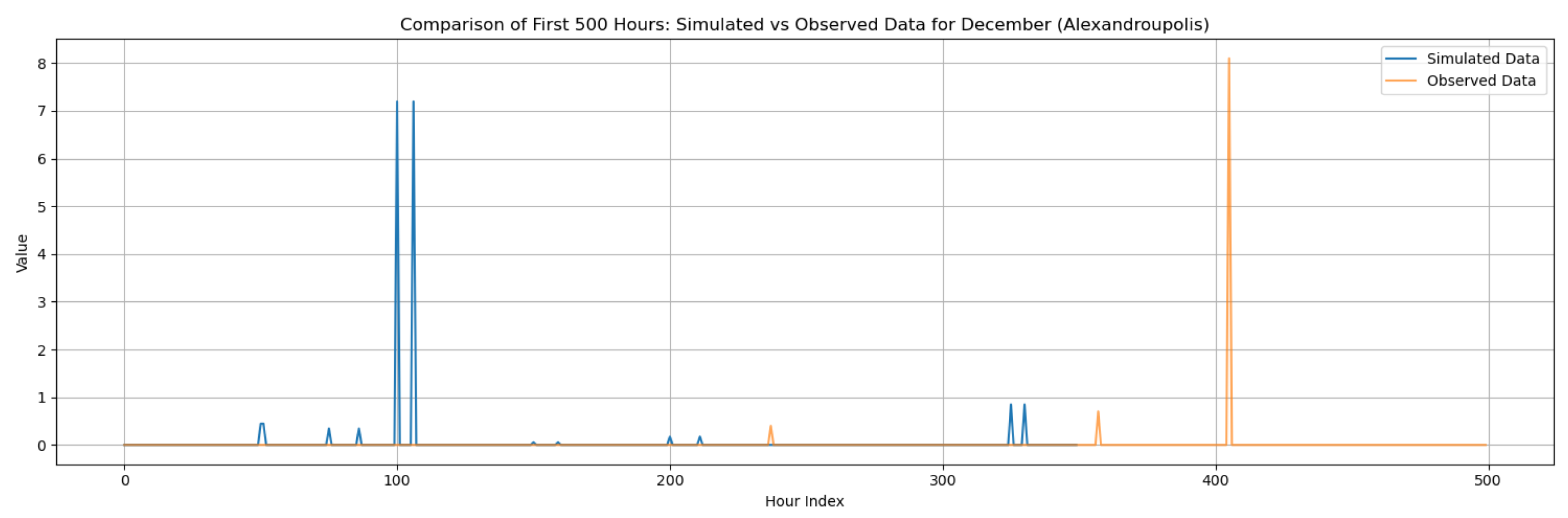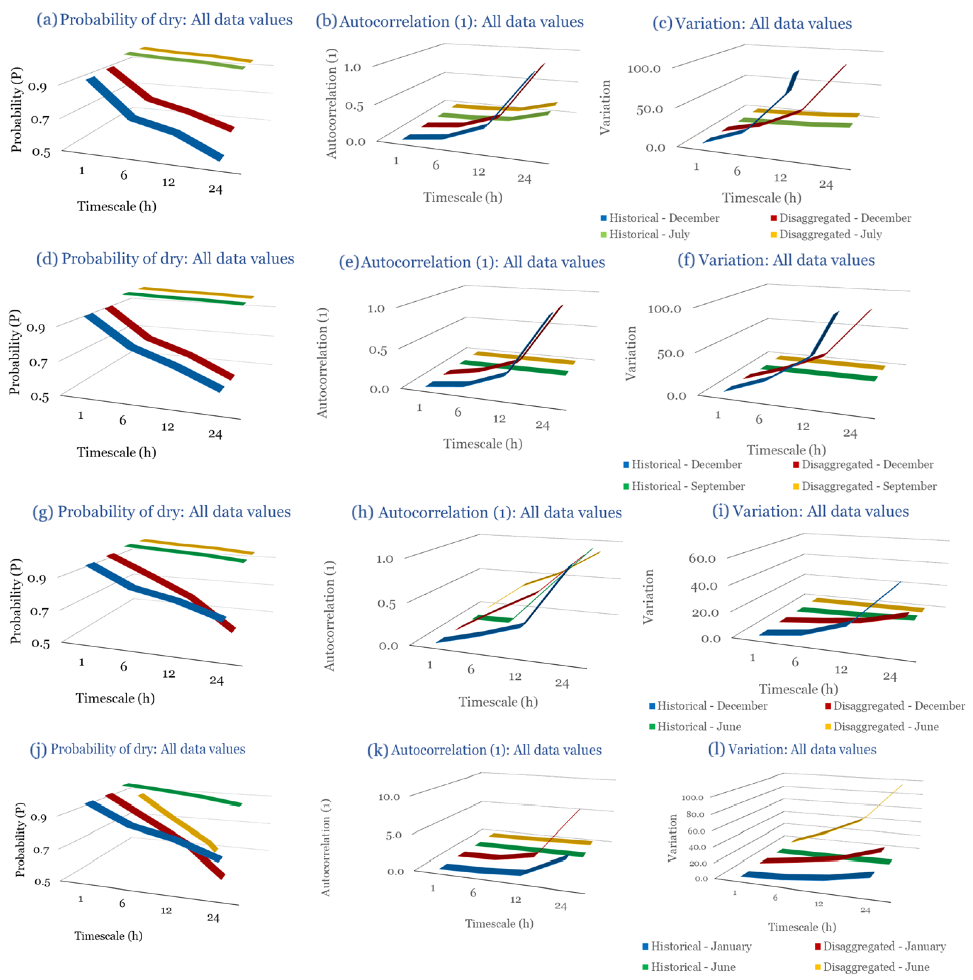 This section contains the complete set of monthly disaggregation results for all four study regions—Corfu, Rhodes, Alexandroupolis, and Herakleion—using both exponential and gamma pulse intensity distributions. While the main manuscript presents results only for the wettest and driest months of each region to emphasize key contrasts, the full twelve-month comparisons are provided here to ensure transparency and reproducibility. The figures include statistical comparisons between observed and synthetic rainfall series, supporting the evaluation of the RBLRPM’s performance across different climatic conditions and seasonal regimes.