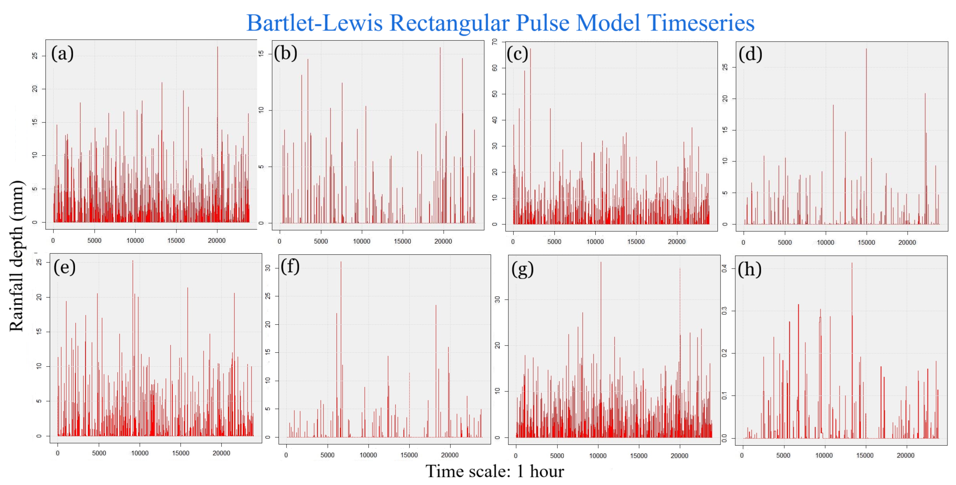Statistical Characteristics of Rhodes for September, with the intensity of the pulses following both distributions, where: (a) the diagram of the autocorrelation coefficient, (b) the diagrams of the probability of dry during a dry hour, a dry day and a dry hour||rainy day respectively, (c) the plots for the coefficient of variation and the coefficient of skewness of rainy days and (d) the plots for the coefficient of variation and the coefficient skewness for all data of the respective disagreggated time series.