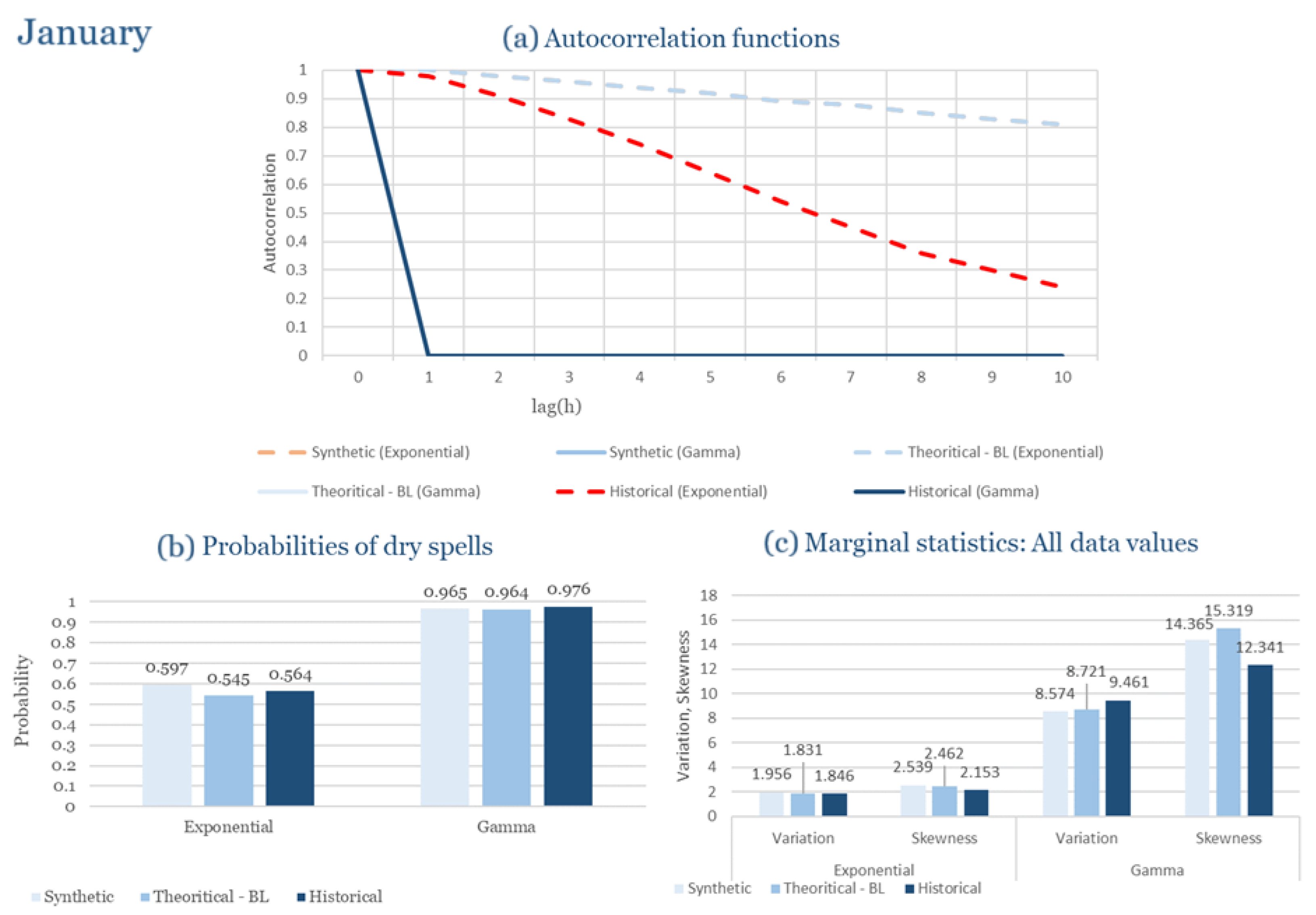 Statistical Characteristics of Alexandroupolis for January, with the intensity of the pulses following both distributions, where: (a) the diagram of the autocorrelation coefficient, (b) the diagram of the probability of dry and (c) the diagrams for the coefficient of variation and skewness of the historical and synthetic timeseries.