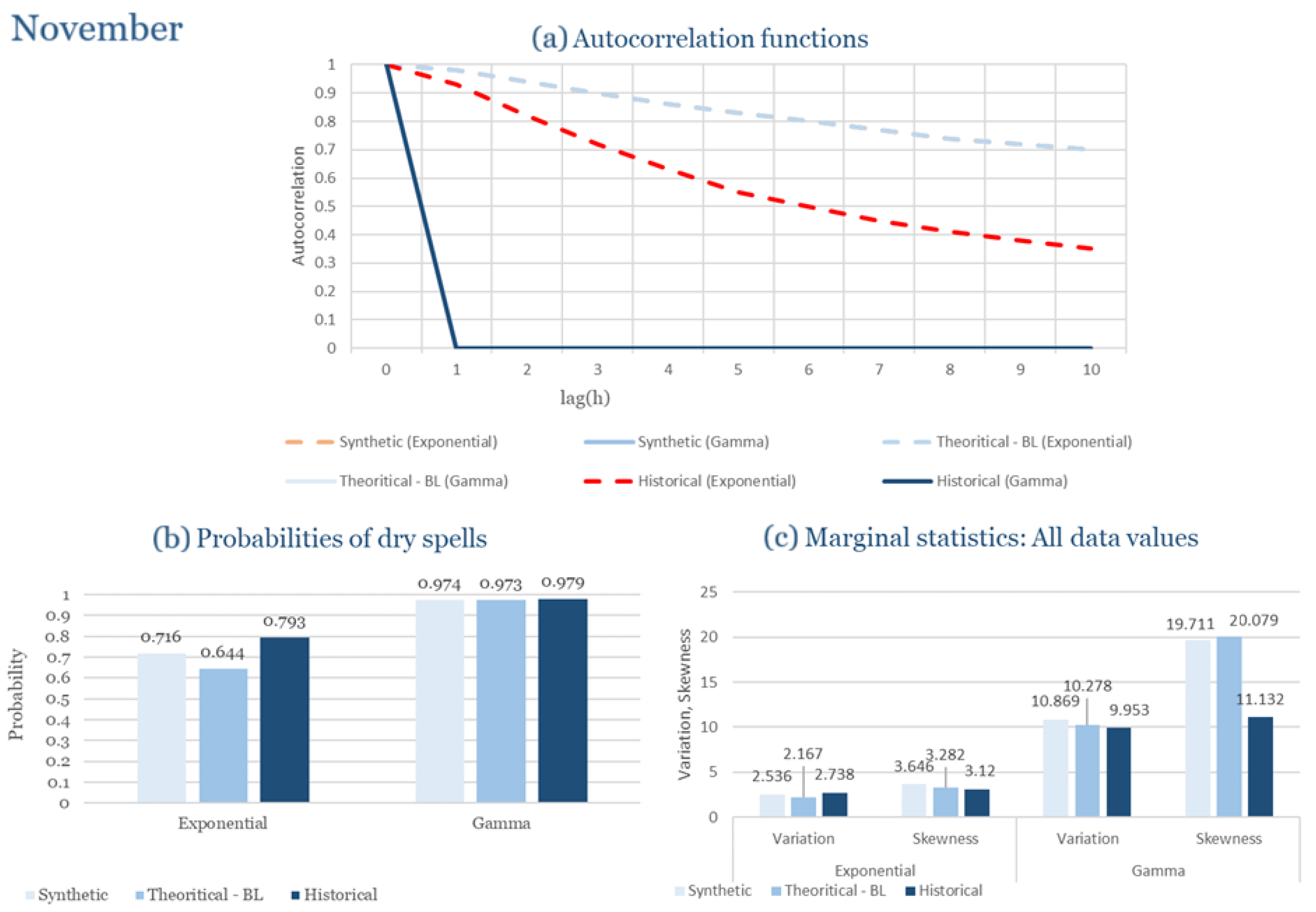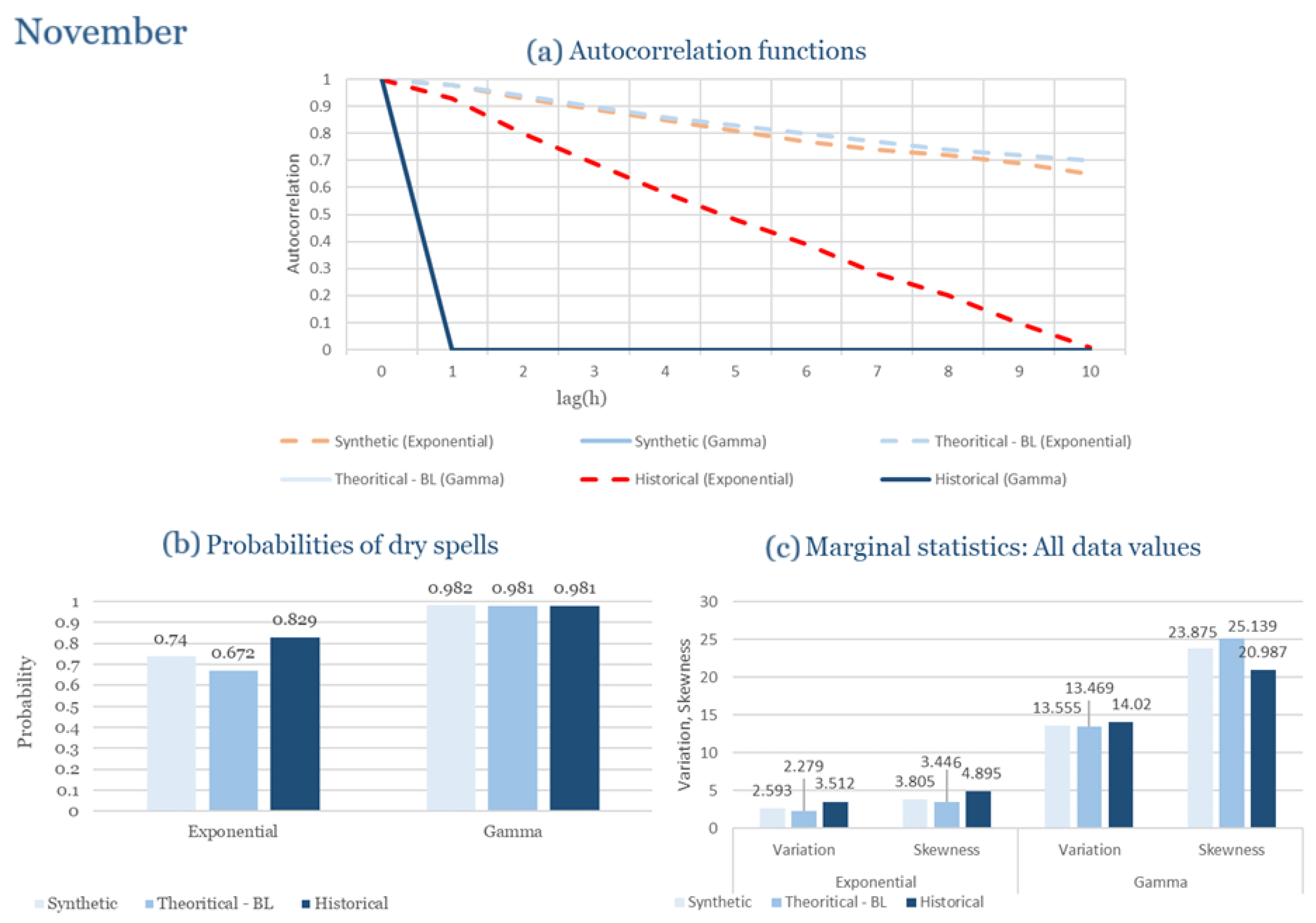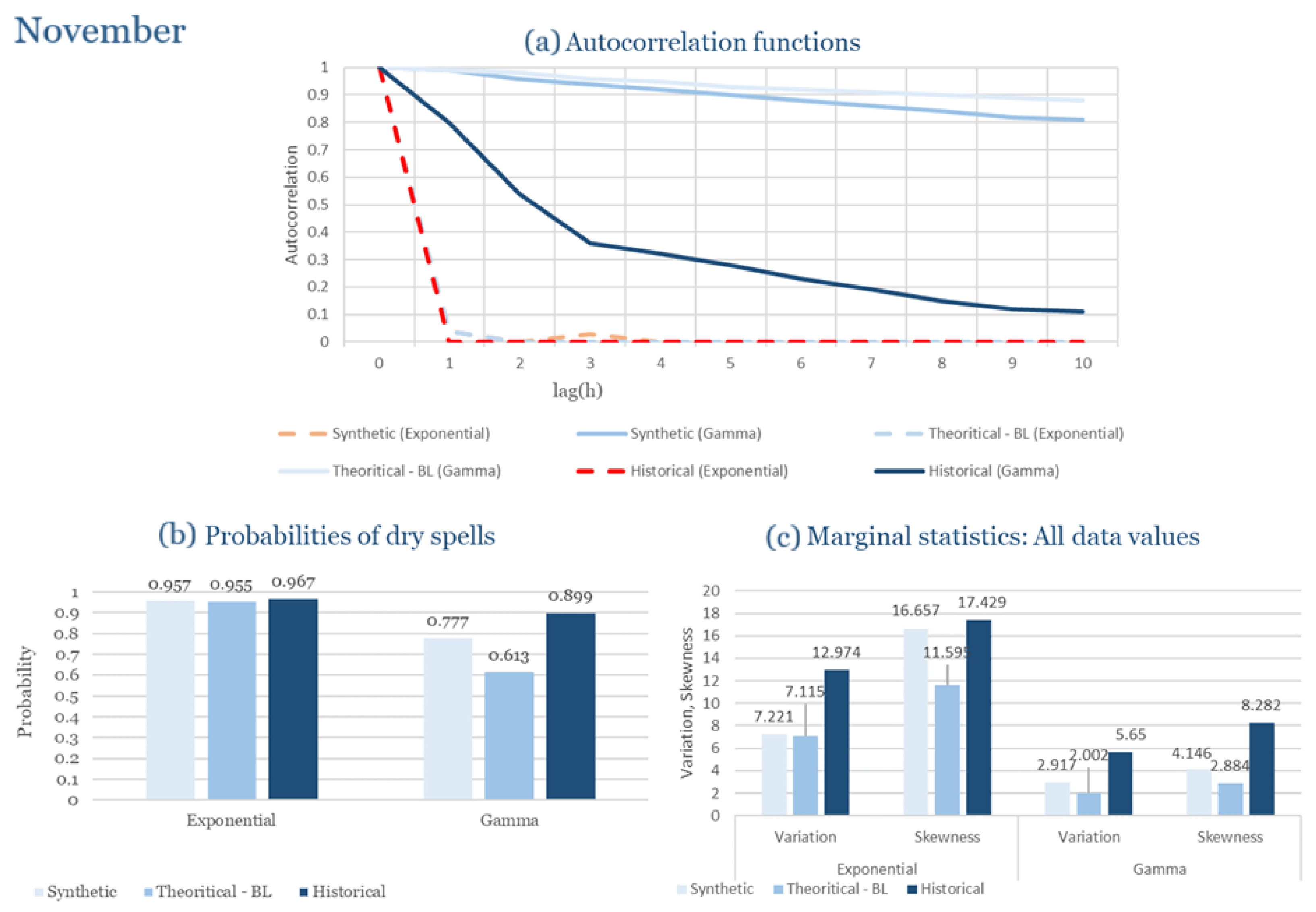 Statistical Characteristics of Alexandroupolis for November, with the intensity of the pulses following both distributions, where: (a) the diagram of the autocorrelation coefficient, (b) the diagram of the probability of dry and (c) the diagrams for the coefficient of variation and skewness of the historical and synthetic timeseries.