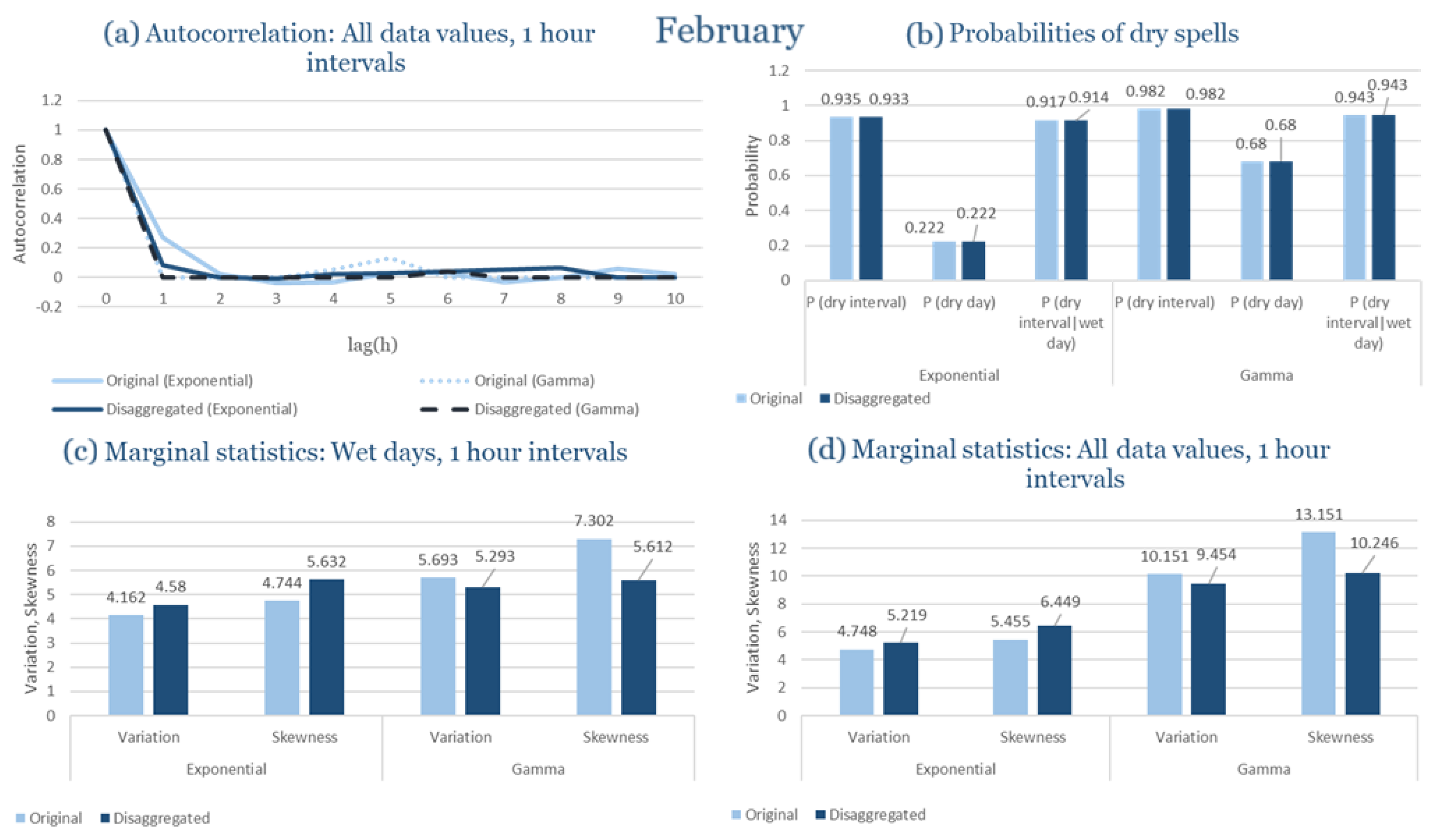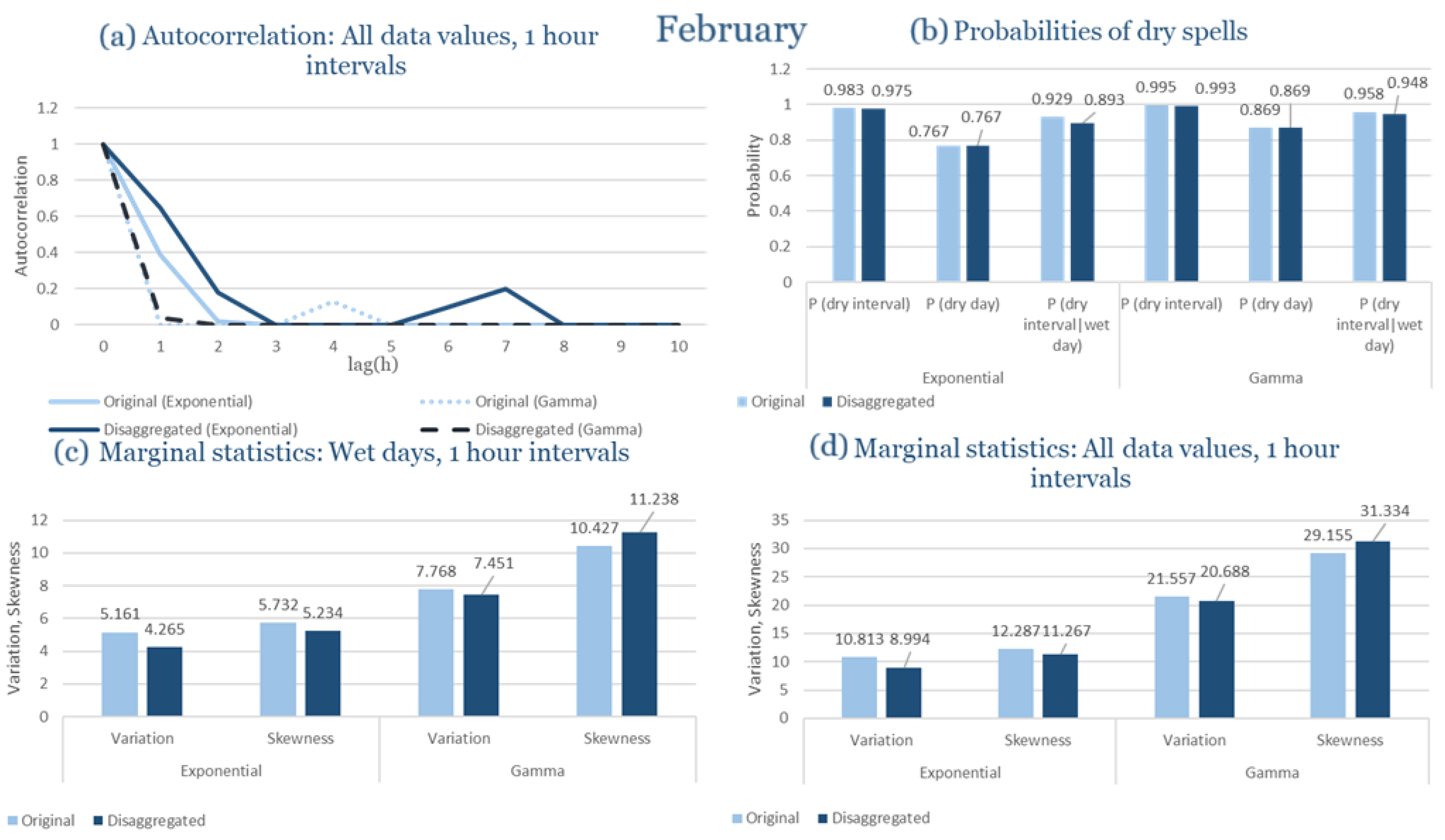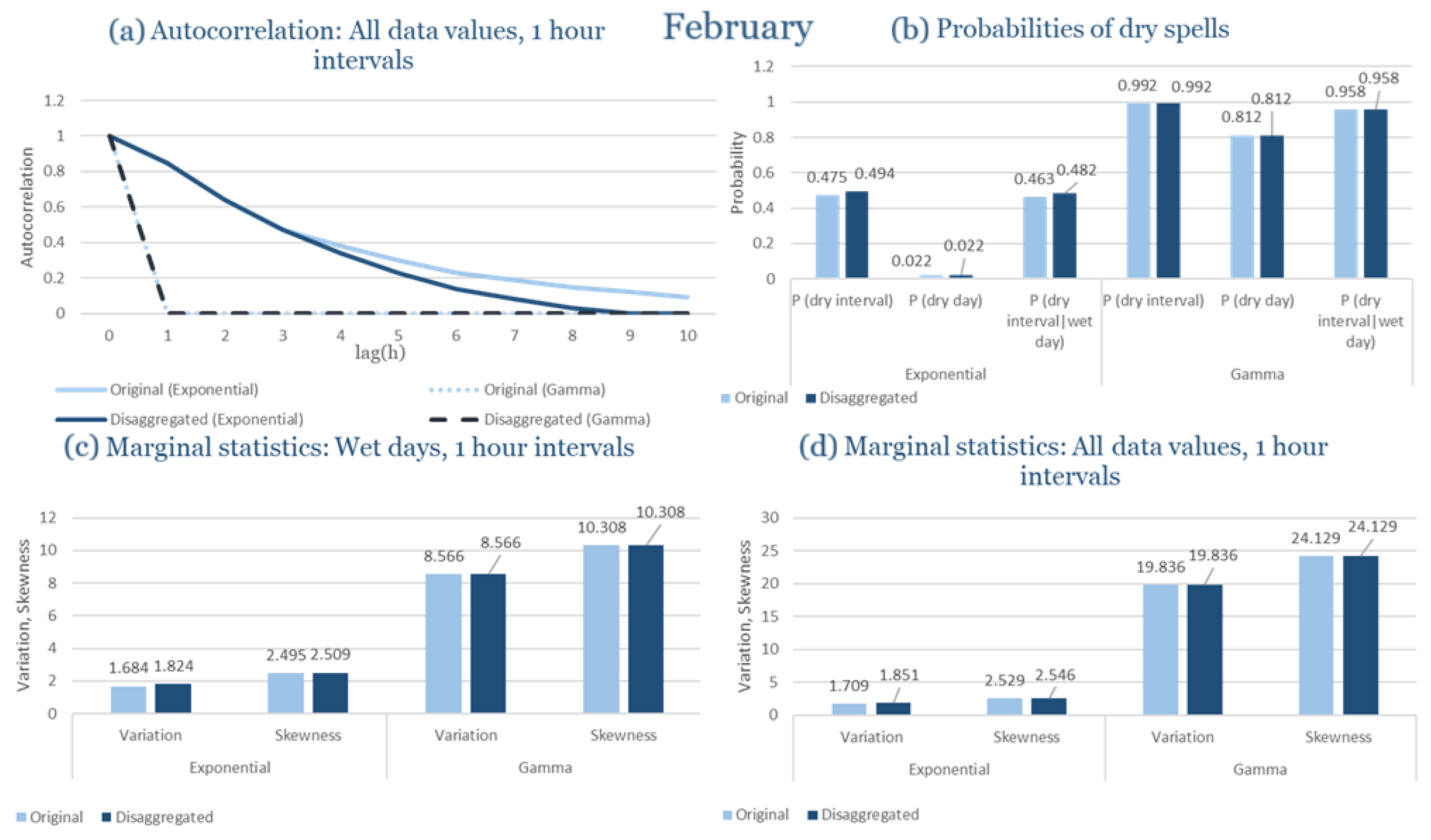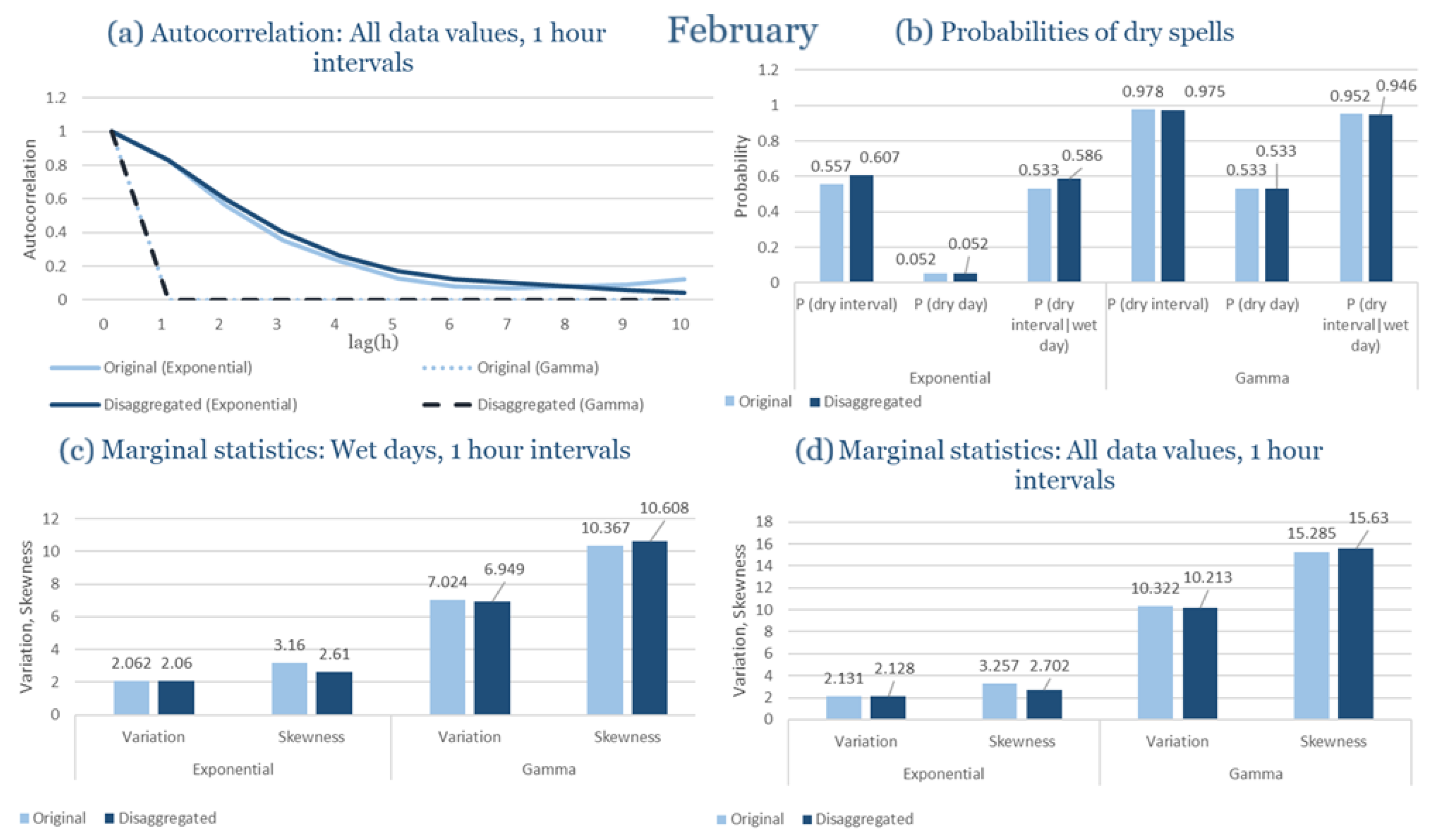 Statistical Characteristics of Alexandroupolis for February, with the intensity of the pulses following both distributions, where: (a) the diagram of the autocorrelation coefficient, (b) the diagrams of the probability of dry during a dry hour, a dry day and a dry hour||rainy day respectively, (c) the plots for the coefficient of variation and the coefficient of skewness of rainy days and (d) the plots for the coefficient of variation and the coefficient skewness for all data of the respective disagreggated time series.
