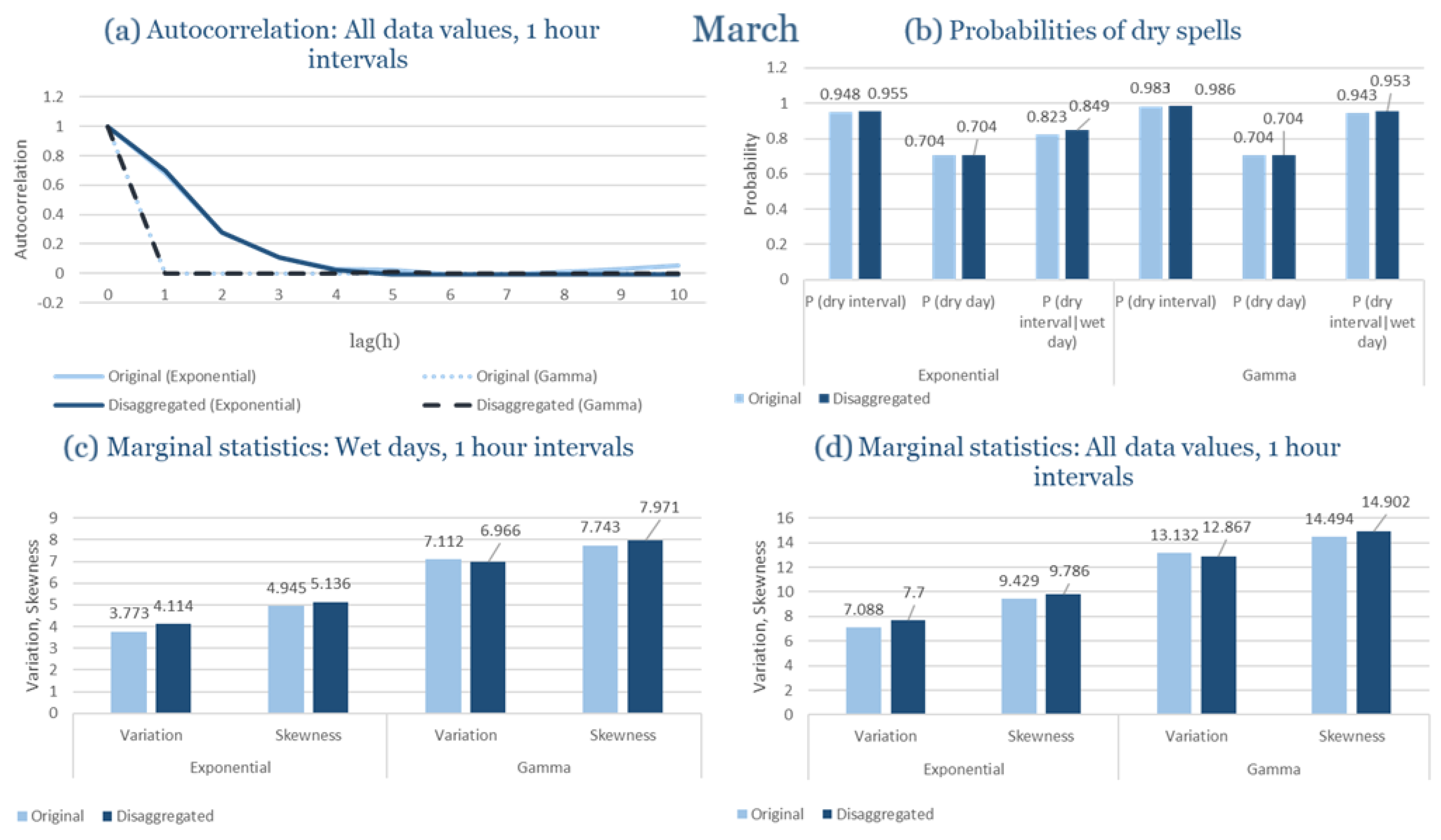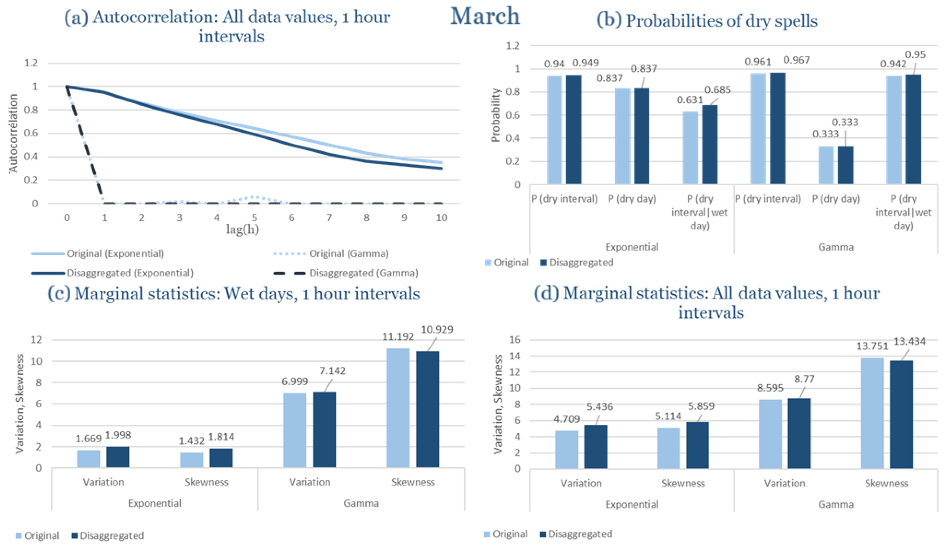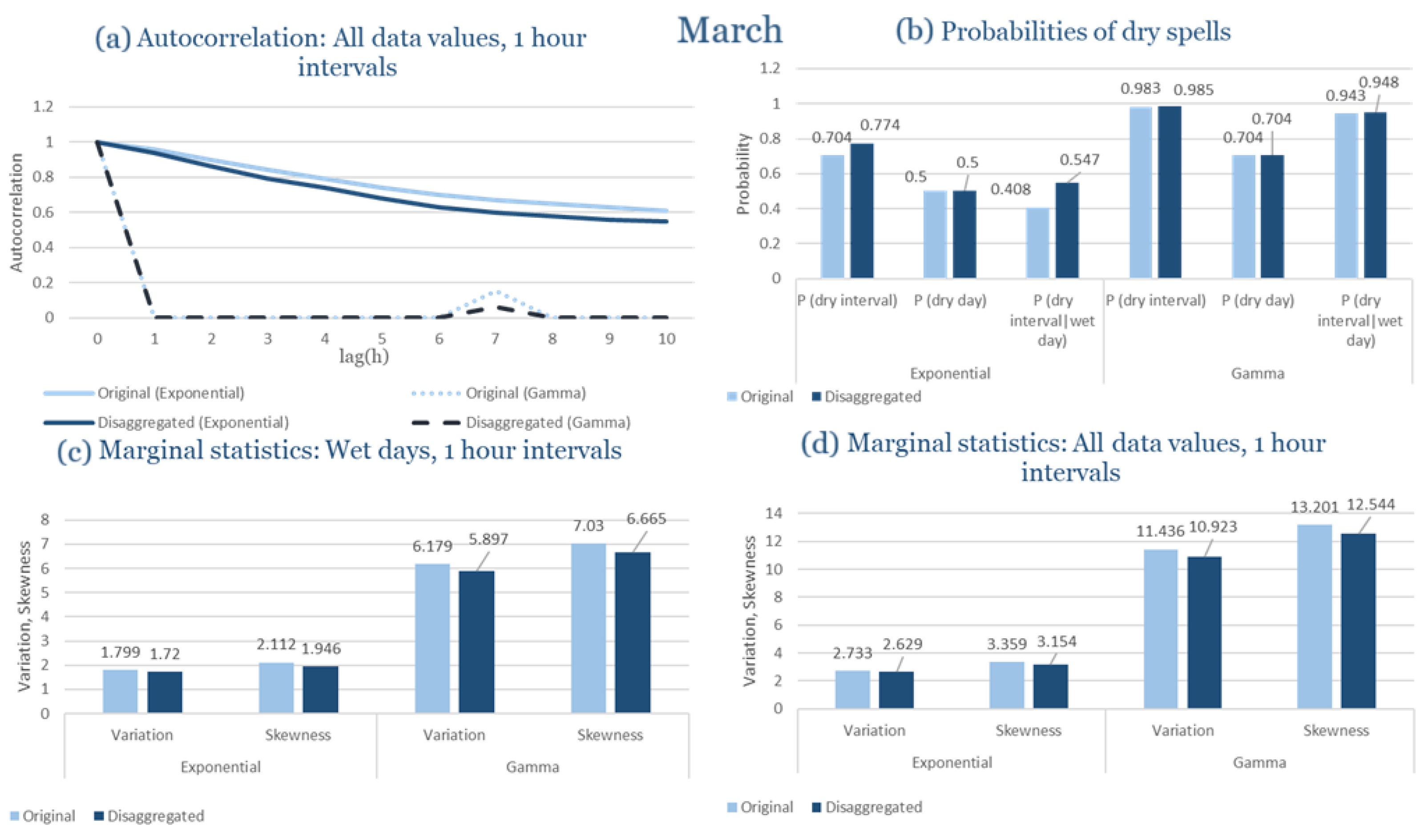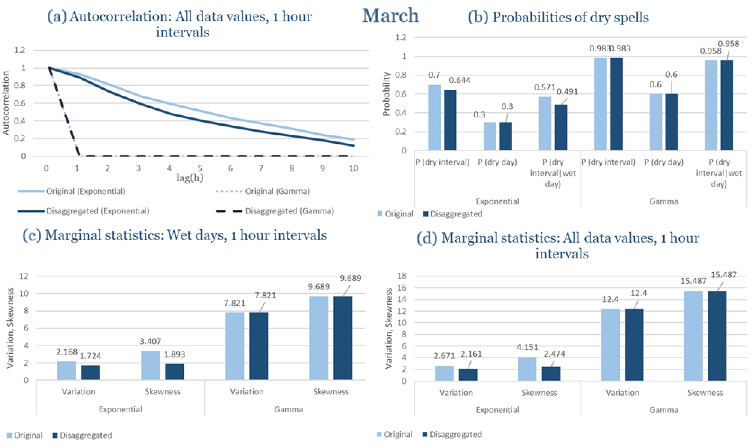 Statistical Characteristics of Alexandroupolis for March, with the intensity of the pulses following both distributions, where: (a) the diagram of the autocorrelation coefficient, (b) the diagrams of the probability of dry during a dry hour, a dry day and a dry hour||rainy day respectively, (c) the plots for the coefficient of variation and the coefficient of skewness of rainy days and (d) the plots for the coefficient of variation and the coefficient skewness for all data of the respective disagreggated time series.
