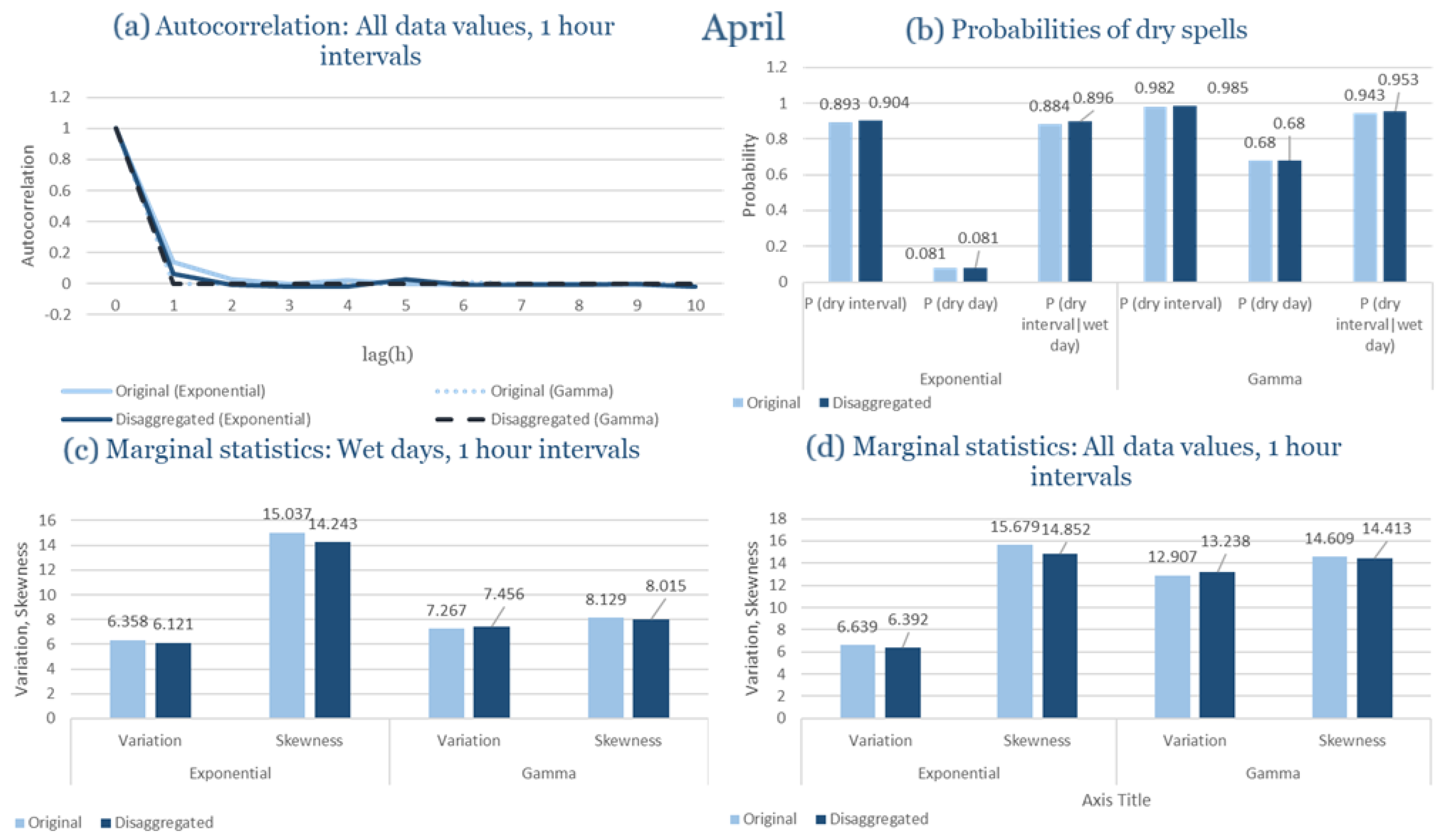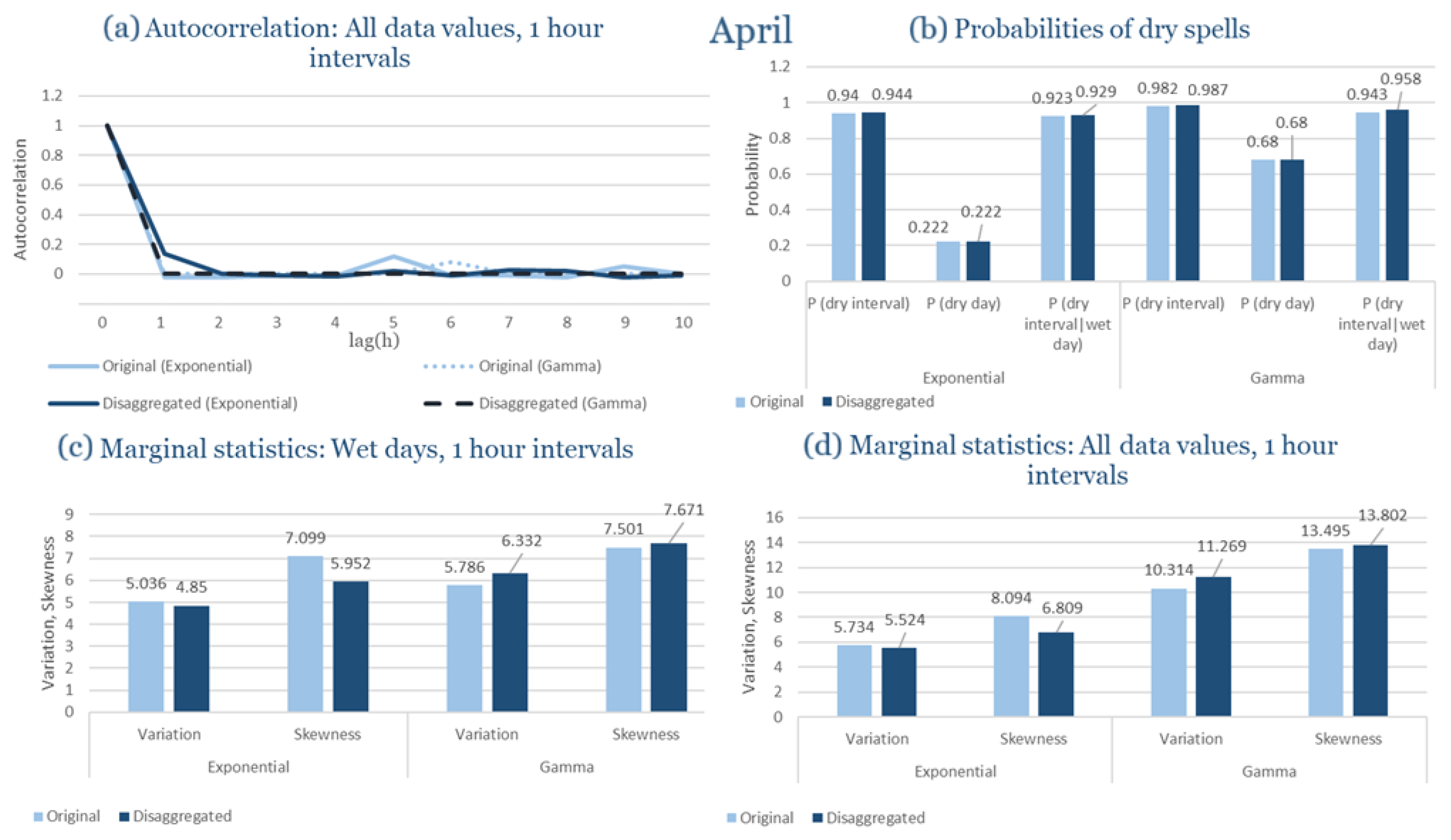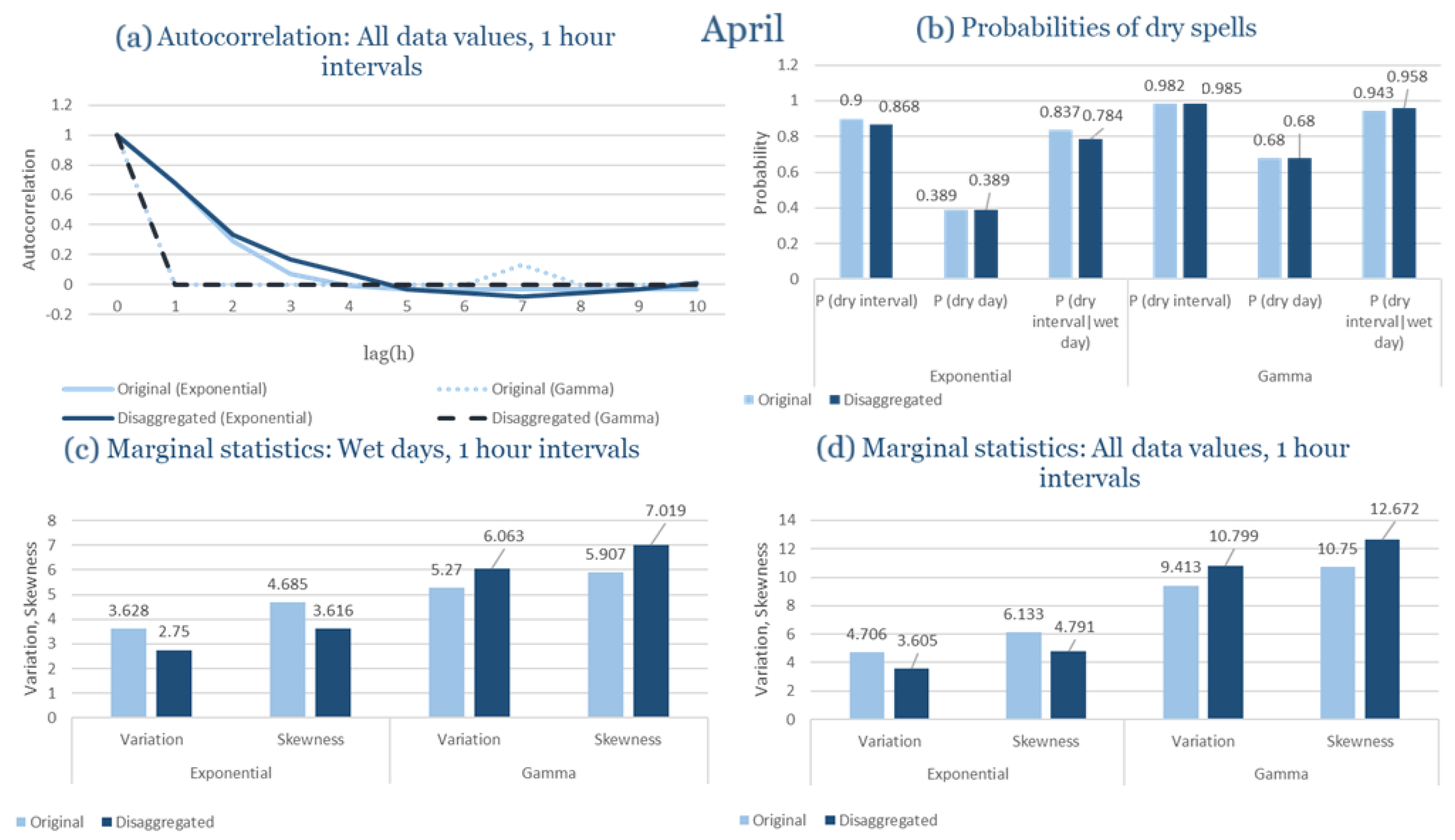 Statistical Characteristics of Alexandroupolis for April, with the intensity of the pulses following both distributions, where: (a) the diagram of the autocorrelation coefficient, (b) the diagrams of the probability of dry during a dry hour, a dry day and a dry hour||rainy day respectively, (c) the plots for the coefficient of variation and the coefficient of skewness of rainy days and (d) the plots for the coefficient of variation and the coefficient skewness for all data of the respective disagreggated time series.