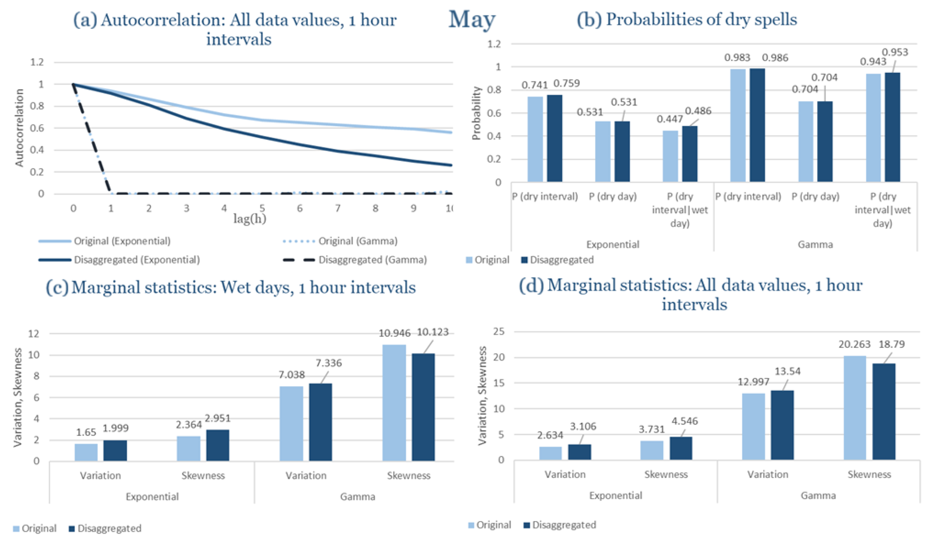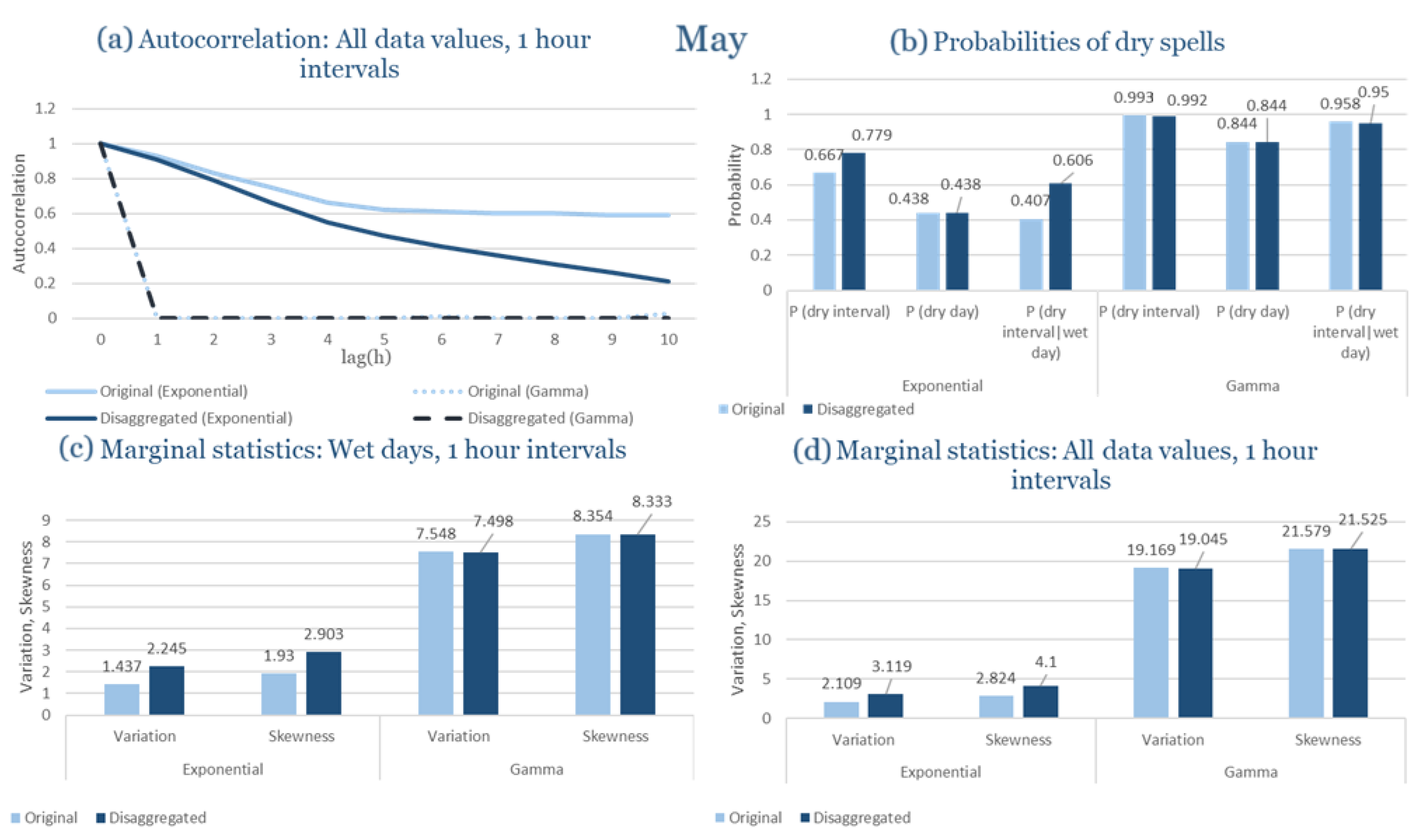 Statistical Characteristics of Alexandroupolis for May, with the intensity of the pulses following both distributions, where: (a) the diagram of the autocorrelation coefficient, (b) the diagrams of the probability of dry during a dry hour, a dry day and a dry hour||rainy day respectively, (c) the plots for the coefficient of variation and the coefficient of skewness of rainy days and (d) the plots for the coefficient of variation and the coefficient skewness for all data of the respective disagreggated time series.
