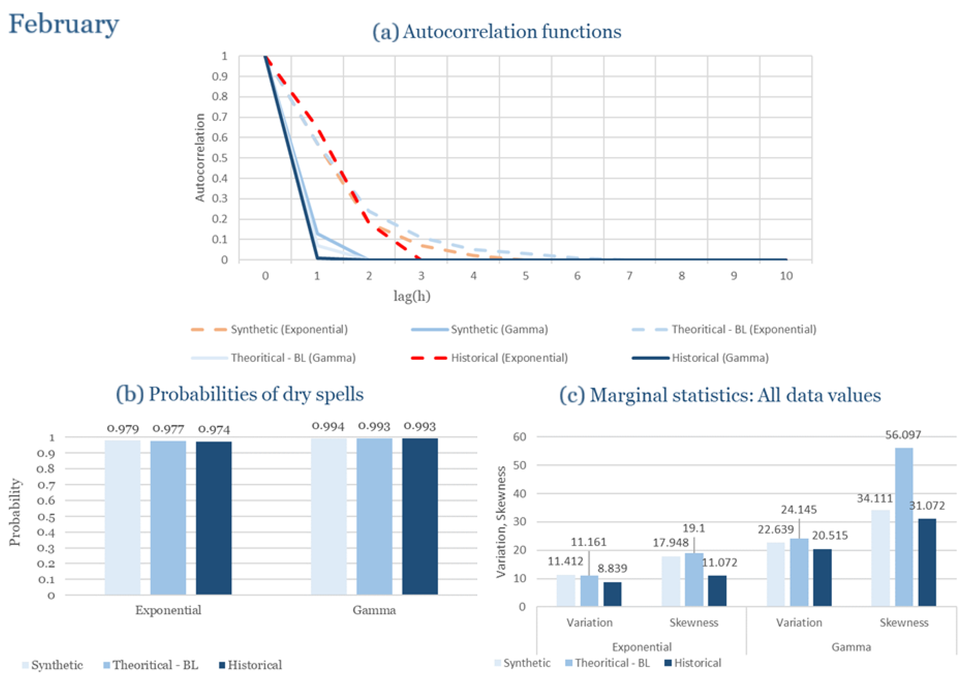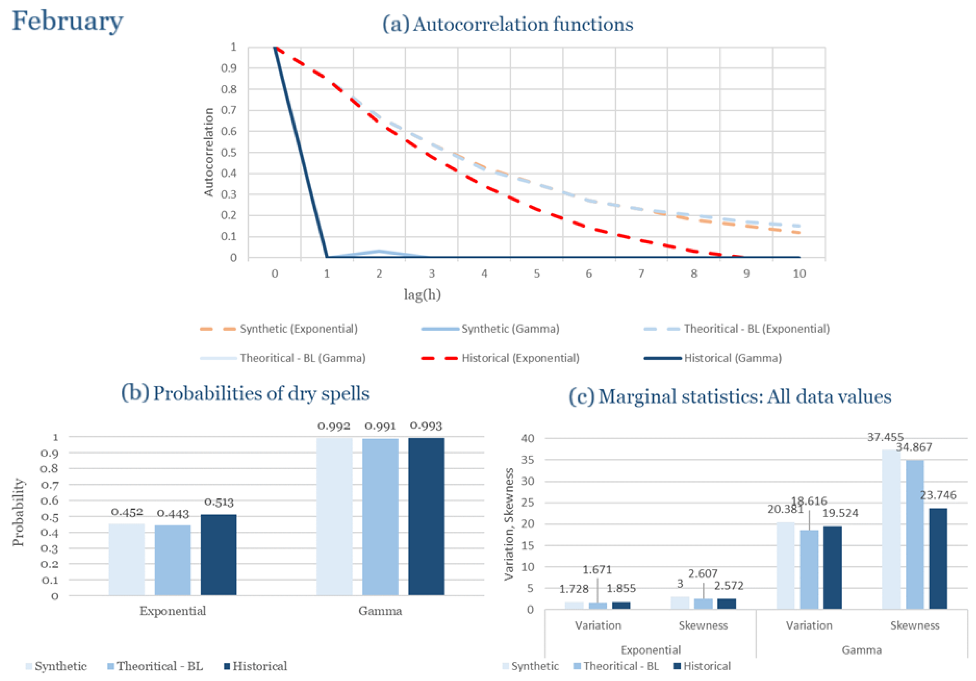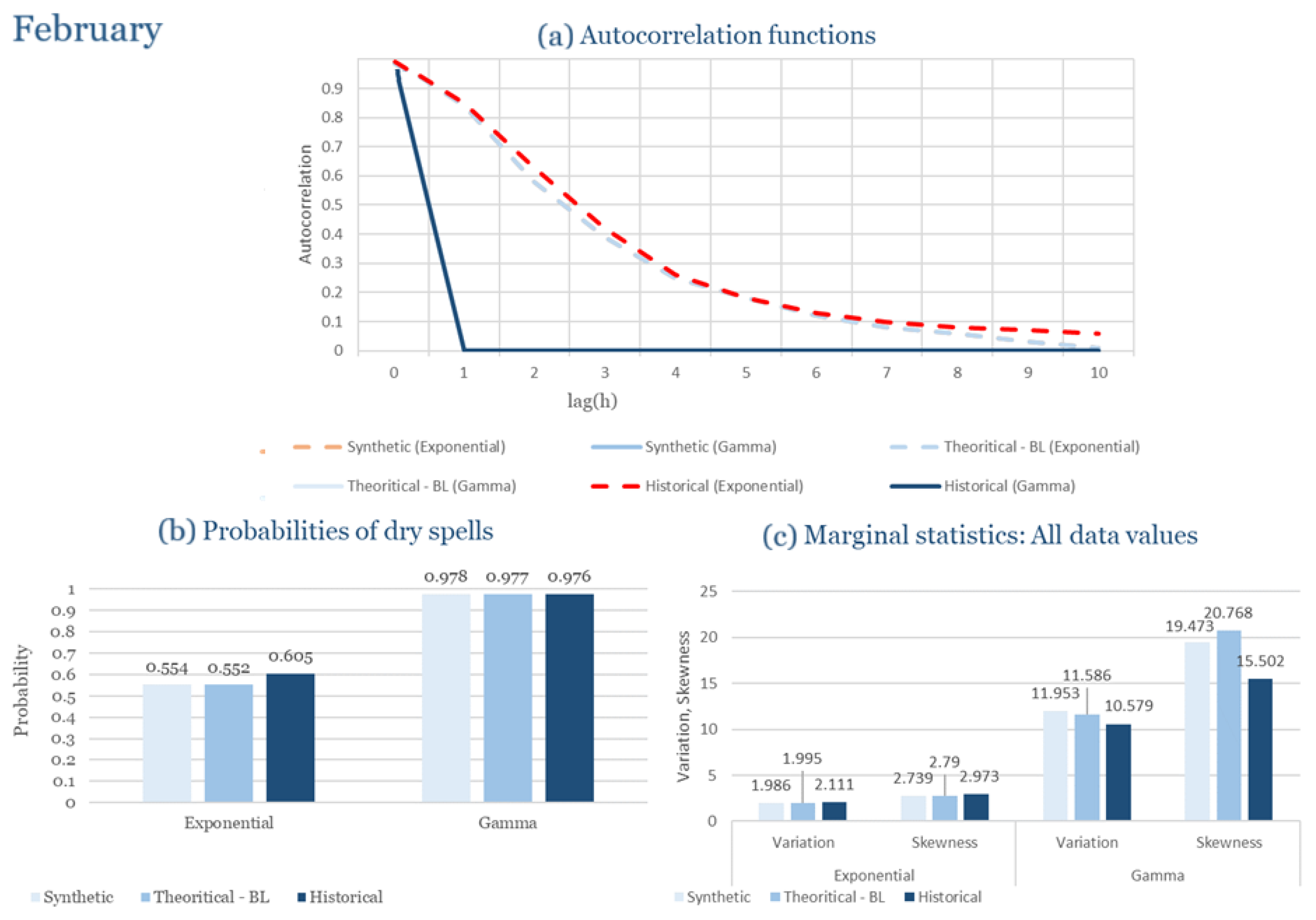 Statistical Characteristics of Alexandroupolis for February, with the intensity of the pulses following both distributions, where: (a) the diagram of the autocorrelation coefficient, (b) the diagram of the probability of dry and (c) the diagrams for the coefficient of variation and skewness of the historical and synthetic timeseries.