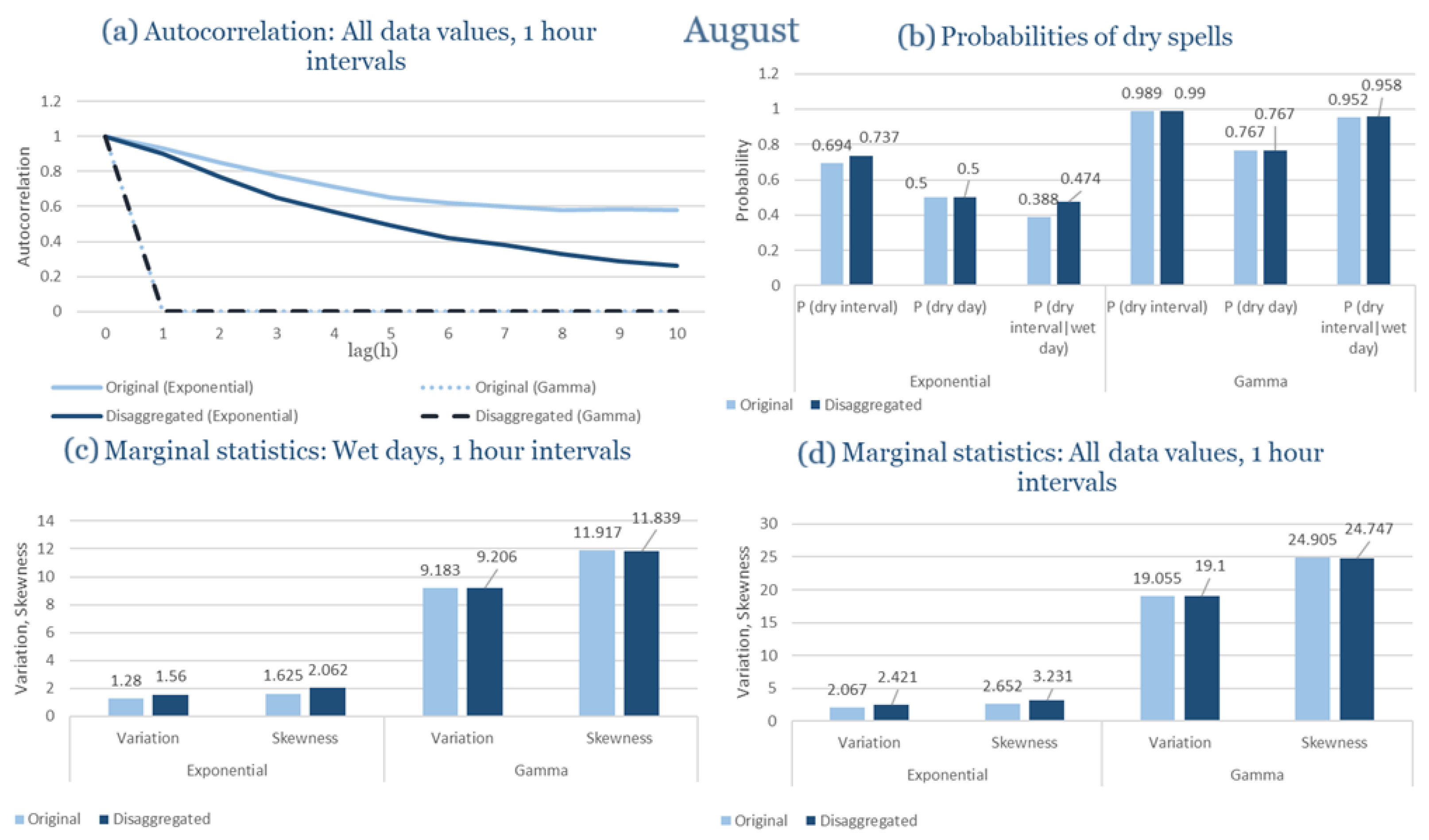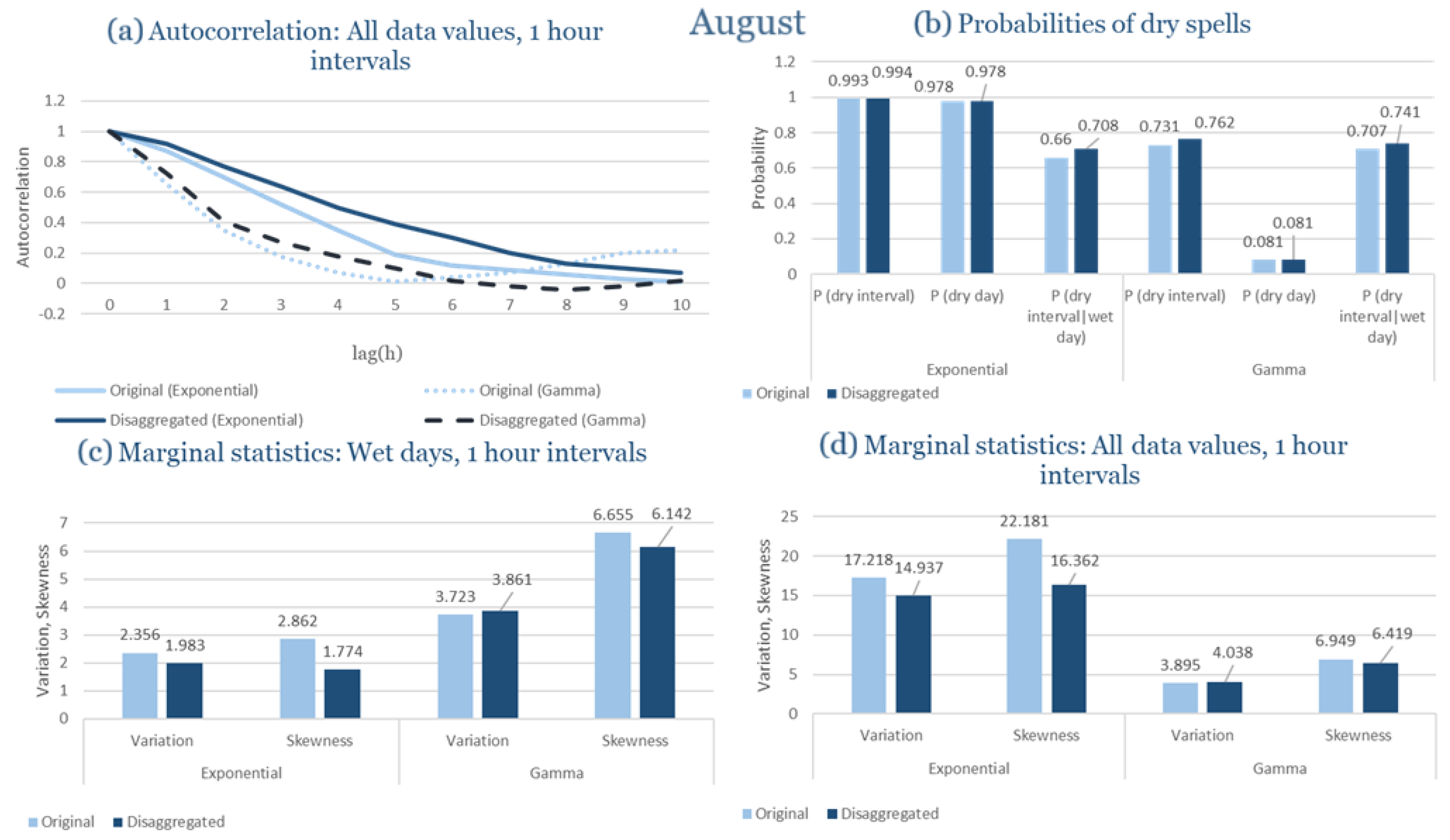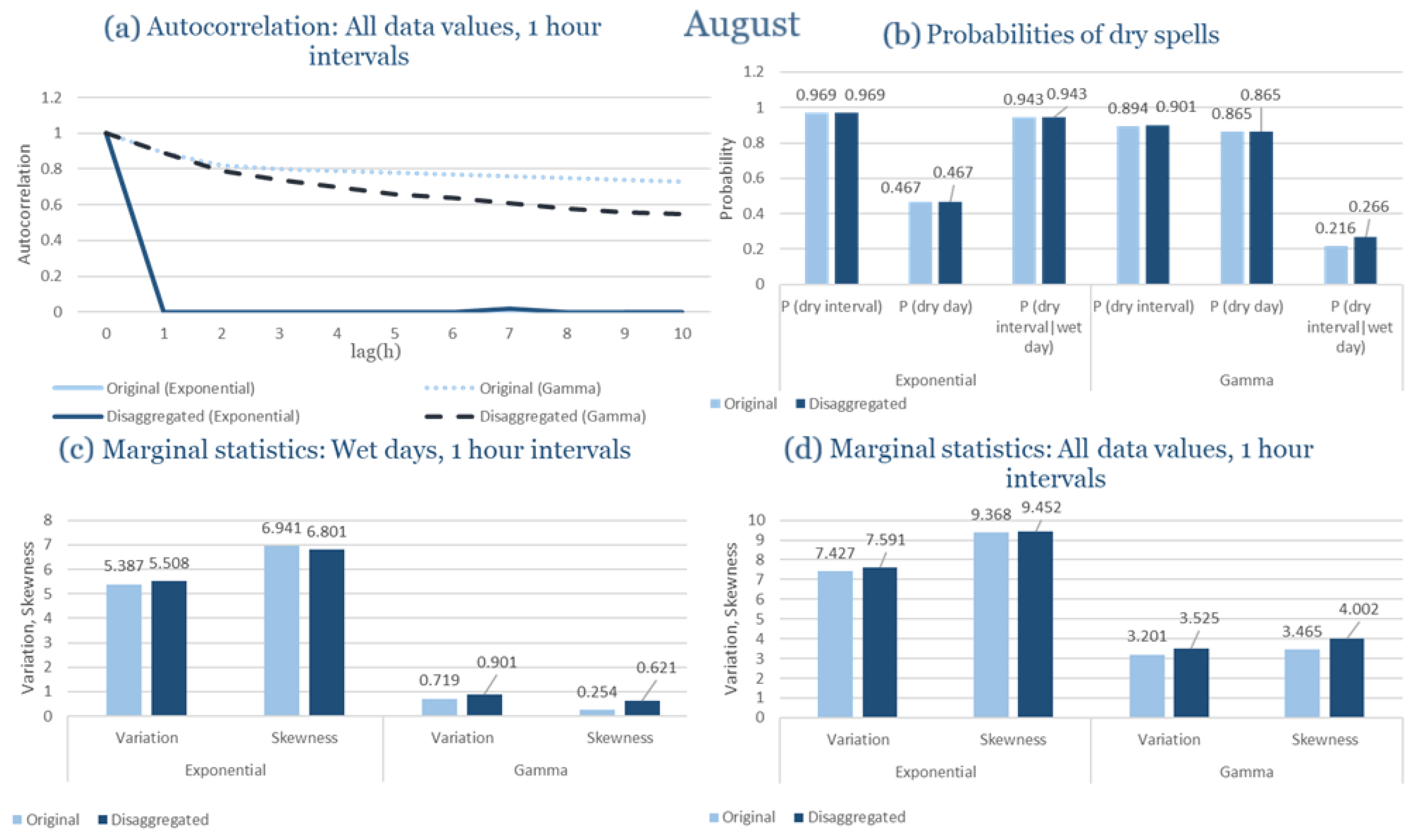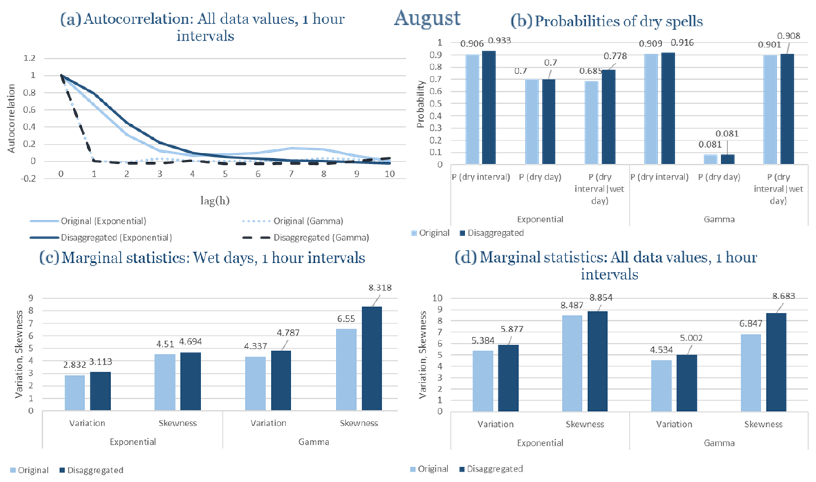 Statistical Characteristics of Alexandroupolis for August, with the intensity of the pulses following both distributions, where: (a) the diagram of the autocorrelation coefficient, (b) the diagrams of the probability of dry during a dry hour, a dry day and a dry hour||rainy day respectively, (c) the plots for the coefficient of variation and the coefficient of skewness of rainy days and (d) the plots for the coefficient of variation and the coefficient skewness for all data of the respective disagreggated time series.