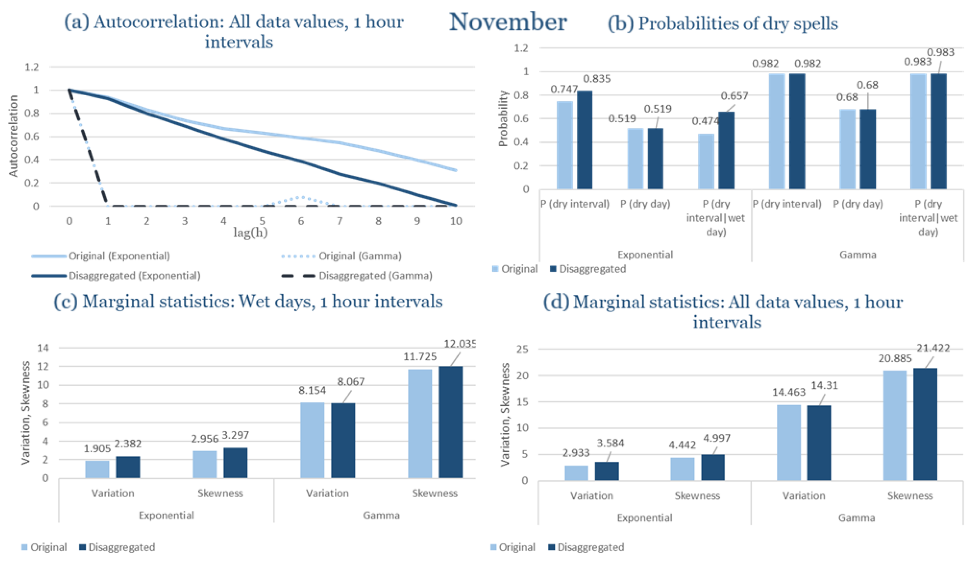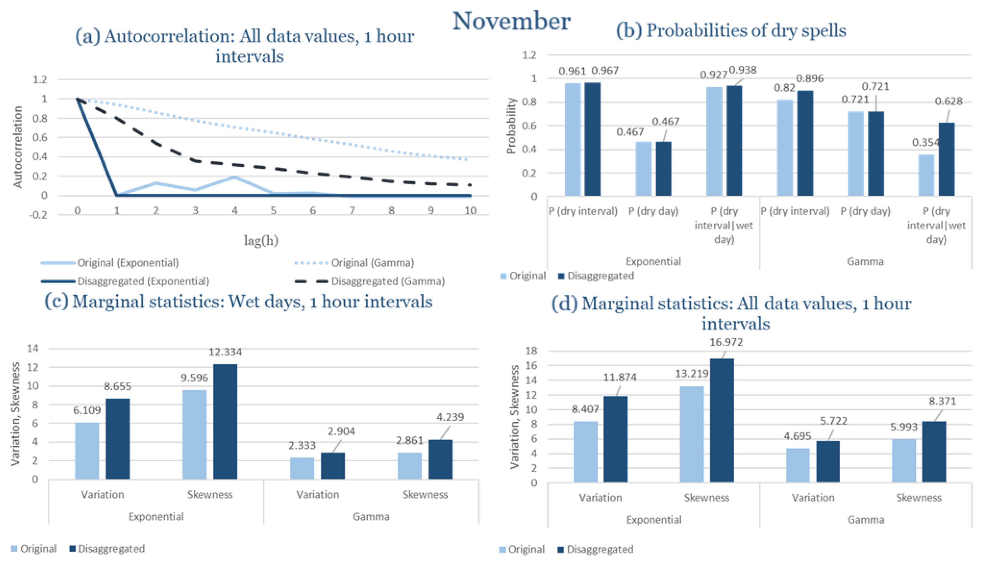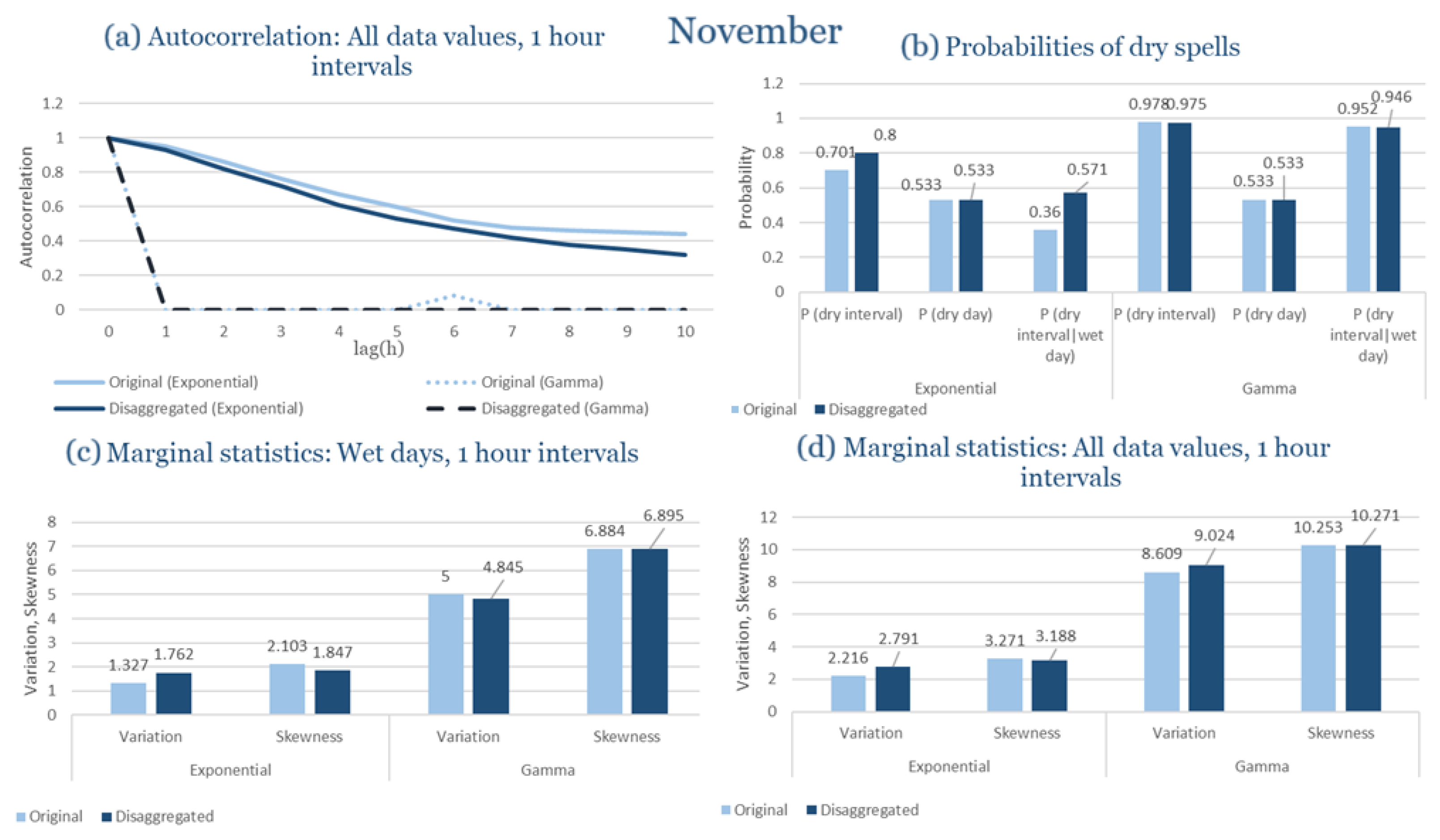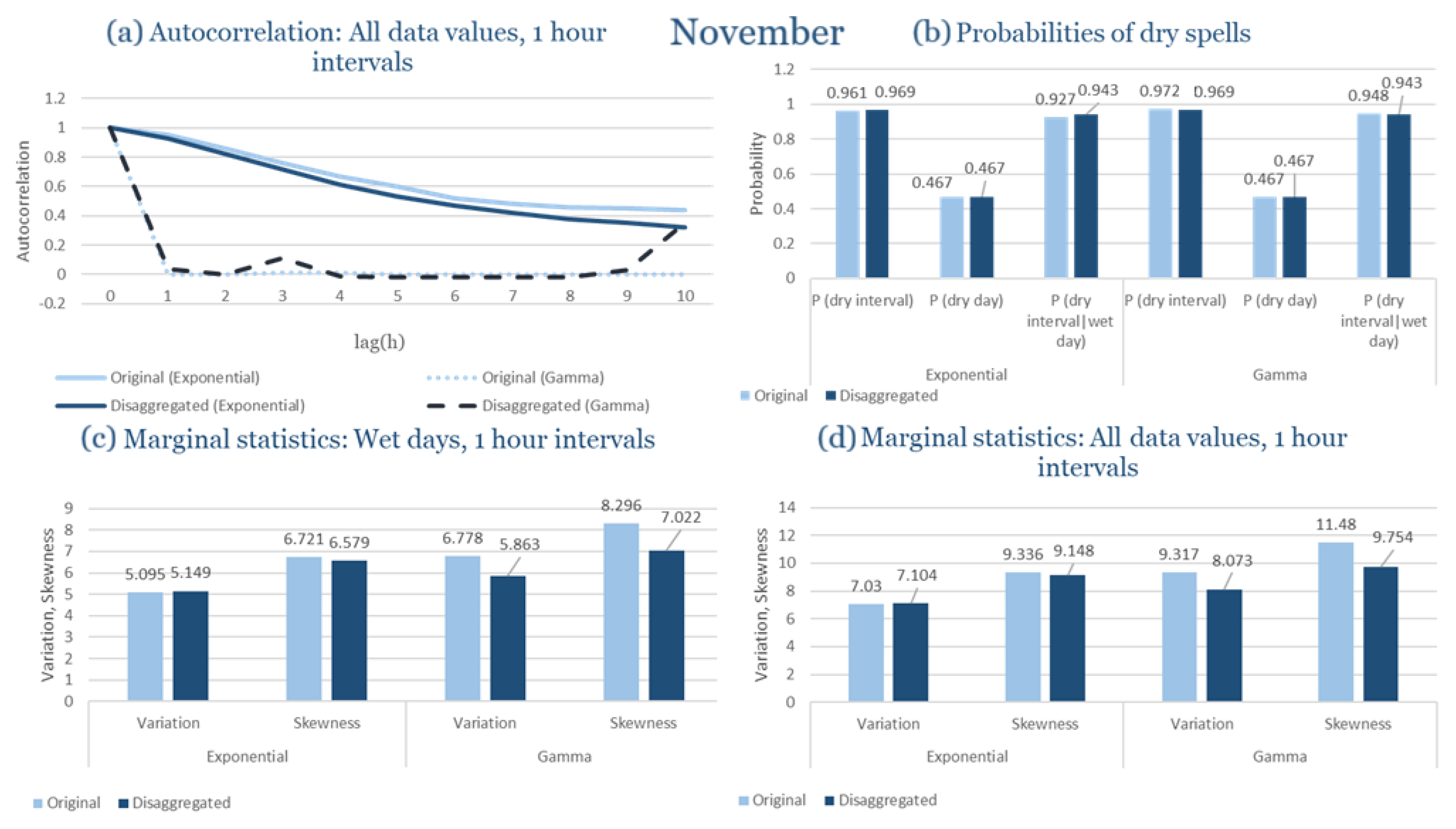 Statistical Characteristics of Alexandroupolis for November, with the intensity of the pulses following both distributions, where: (a) the diagram of the autocorrelation coefficient, (b) the diagrams of the probability of dry during a dry hour, a dry day and a dry hour||rainy day respectively, (c) the plots for the coefficient of variation and the coefficient of skewness of rainy days and (d) the plots for the coefficient of variation and the coefficient skewness for all data of the respective disagreggated time series.