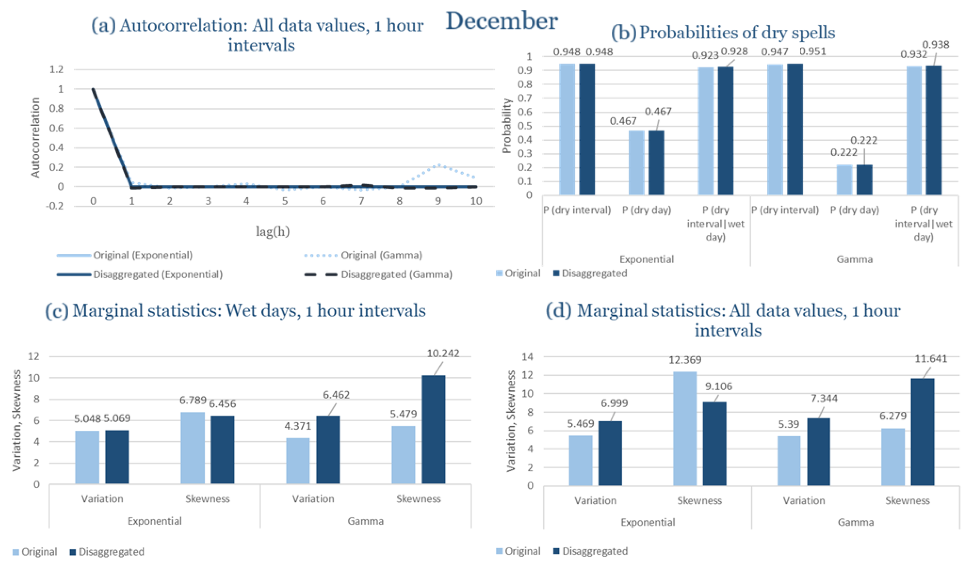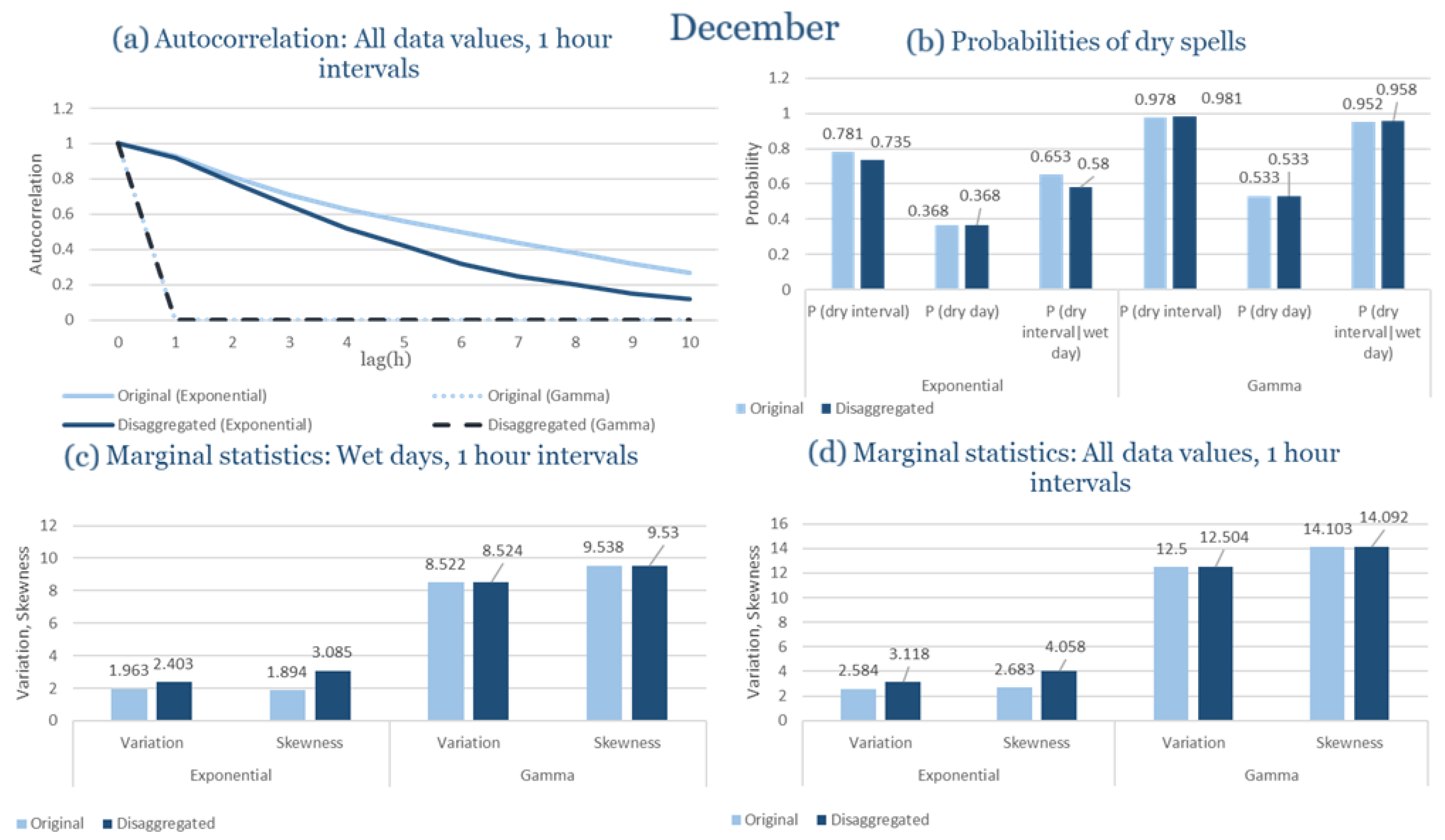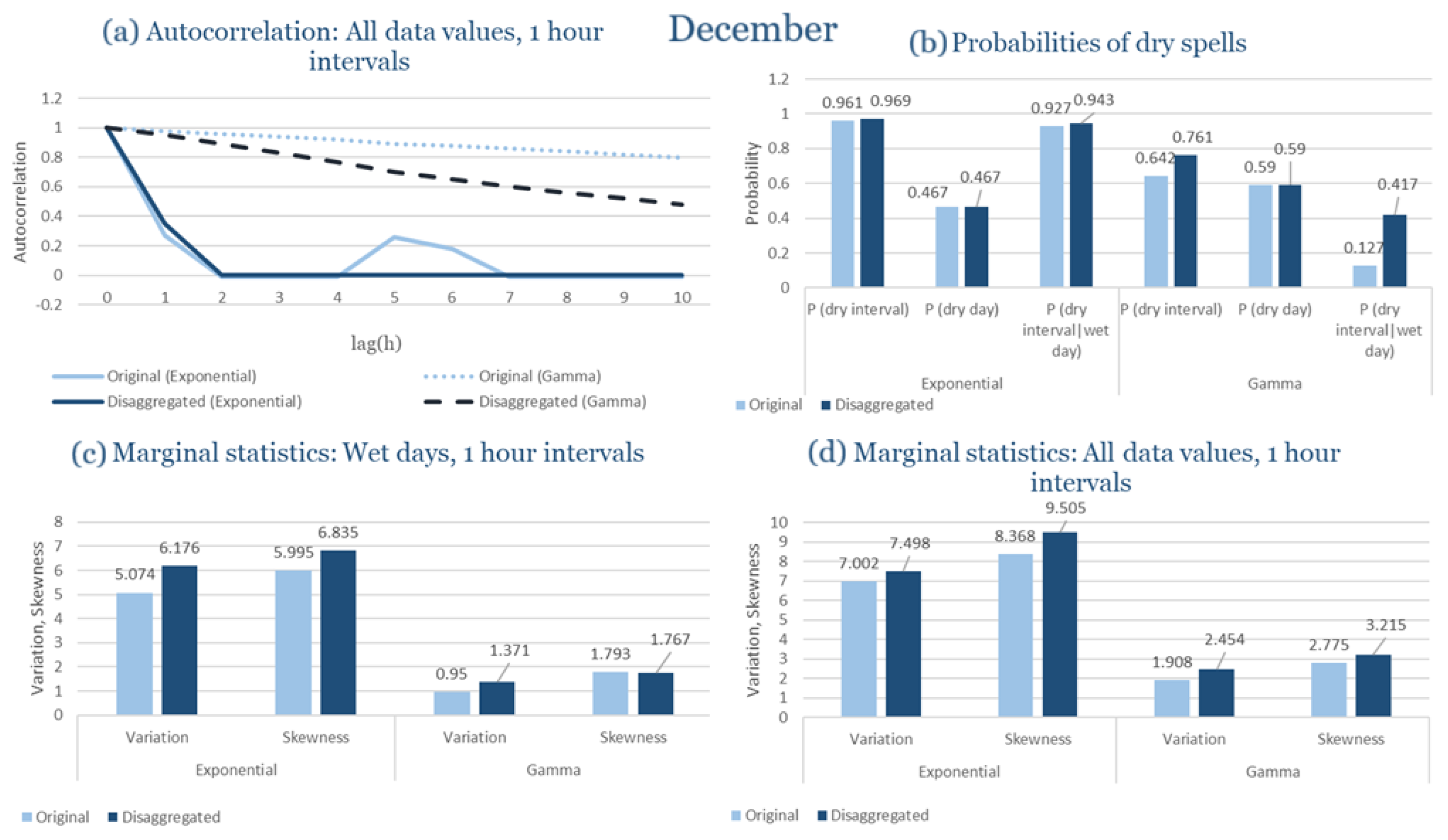 Statistical Characteristics of Alexandroupolis for December, with the intensity of the pulses following both distributions, where: (a) the diagram of the autocorrelation coefficient, (b) the diagrams of the probability of dry during a dry hour, a dry day and a dry hour||rainy day respectively, (c) the plots for the coefficient of variation and the coefficient of skewness of rainy days and (d) the plots for the coefficient of variation and the coefficient skewness for all data of the respective disagreggated time series.