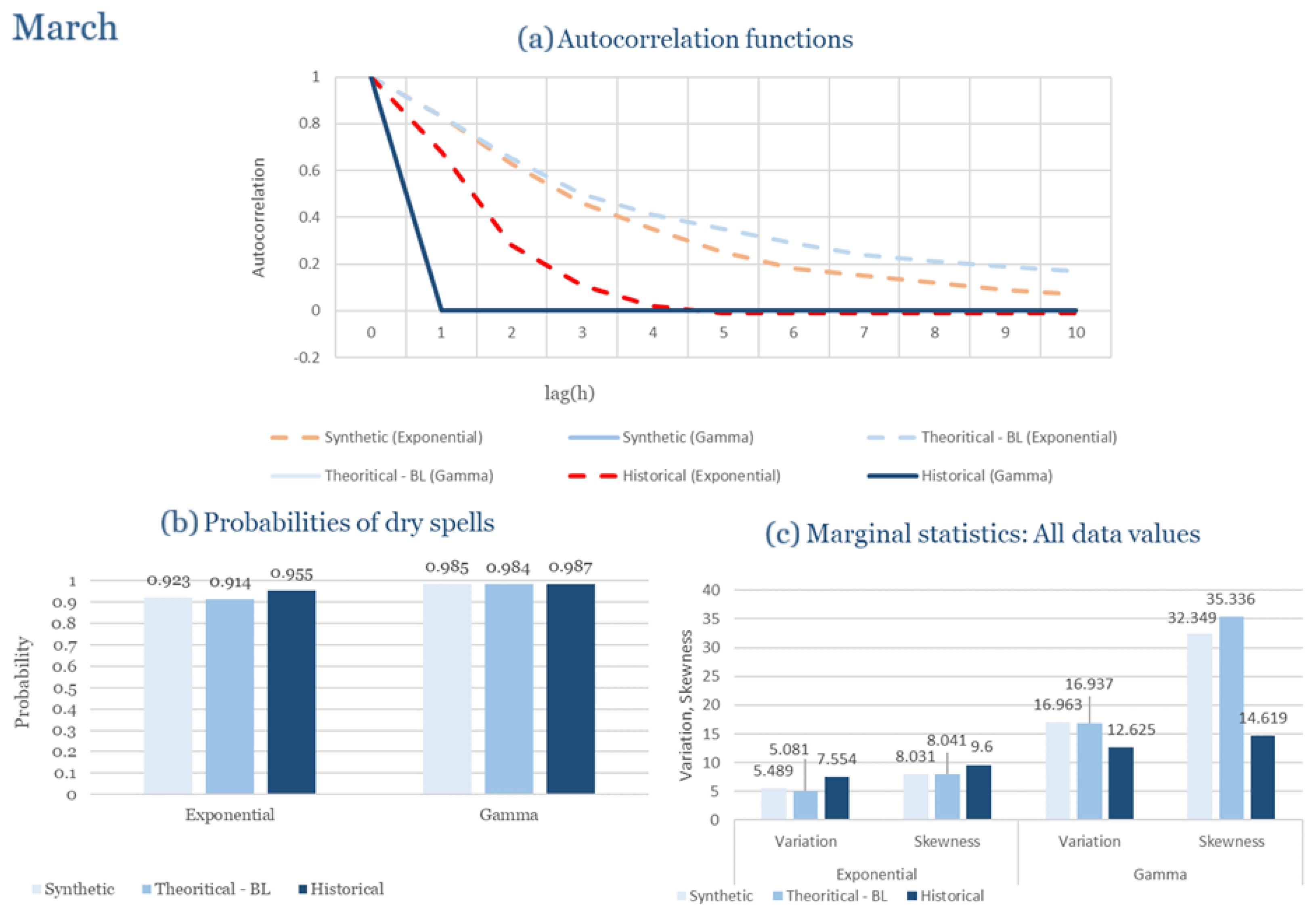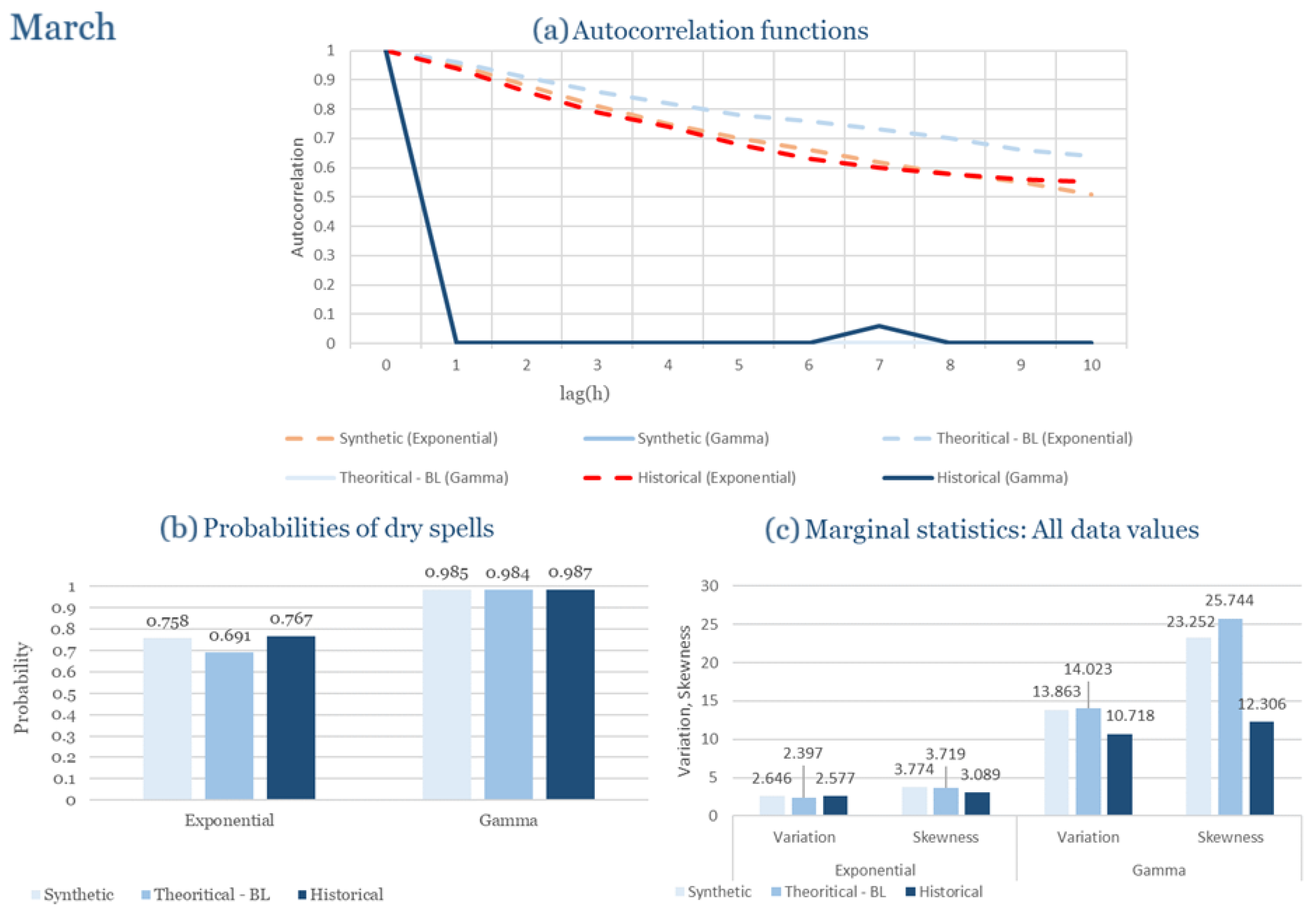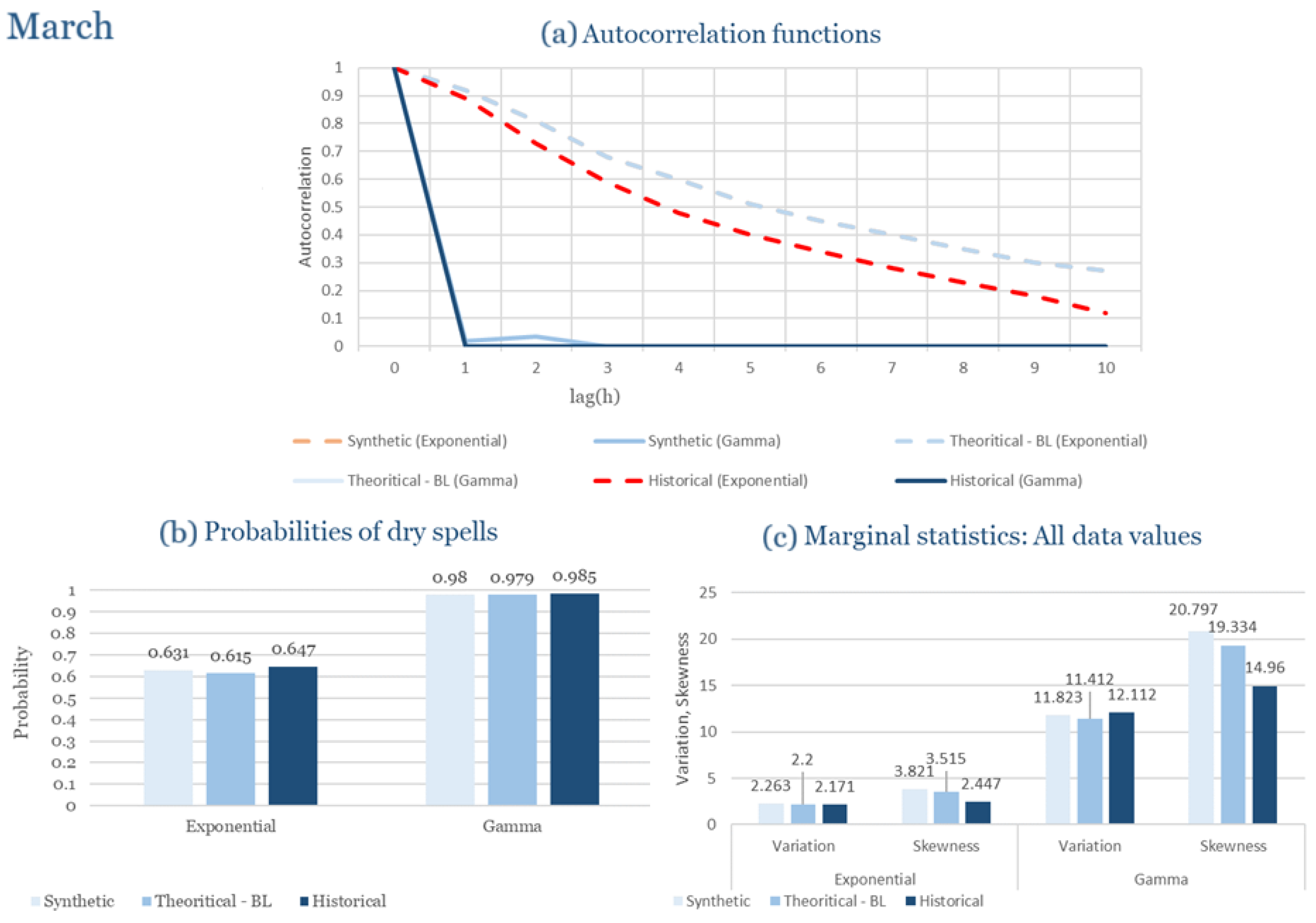Statistical Characteristics of Alexandroupolis for March, with the intensity of the pulses following both distributions, where: (a) the diagram of the autocorrelation coefficient, (b) the diagram of the probability of dry and (c) the diagrams for the coefficient of variation and skewness of the historical and synthetic timeseries.