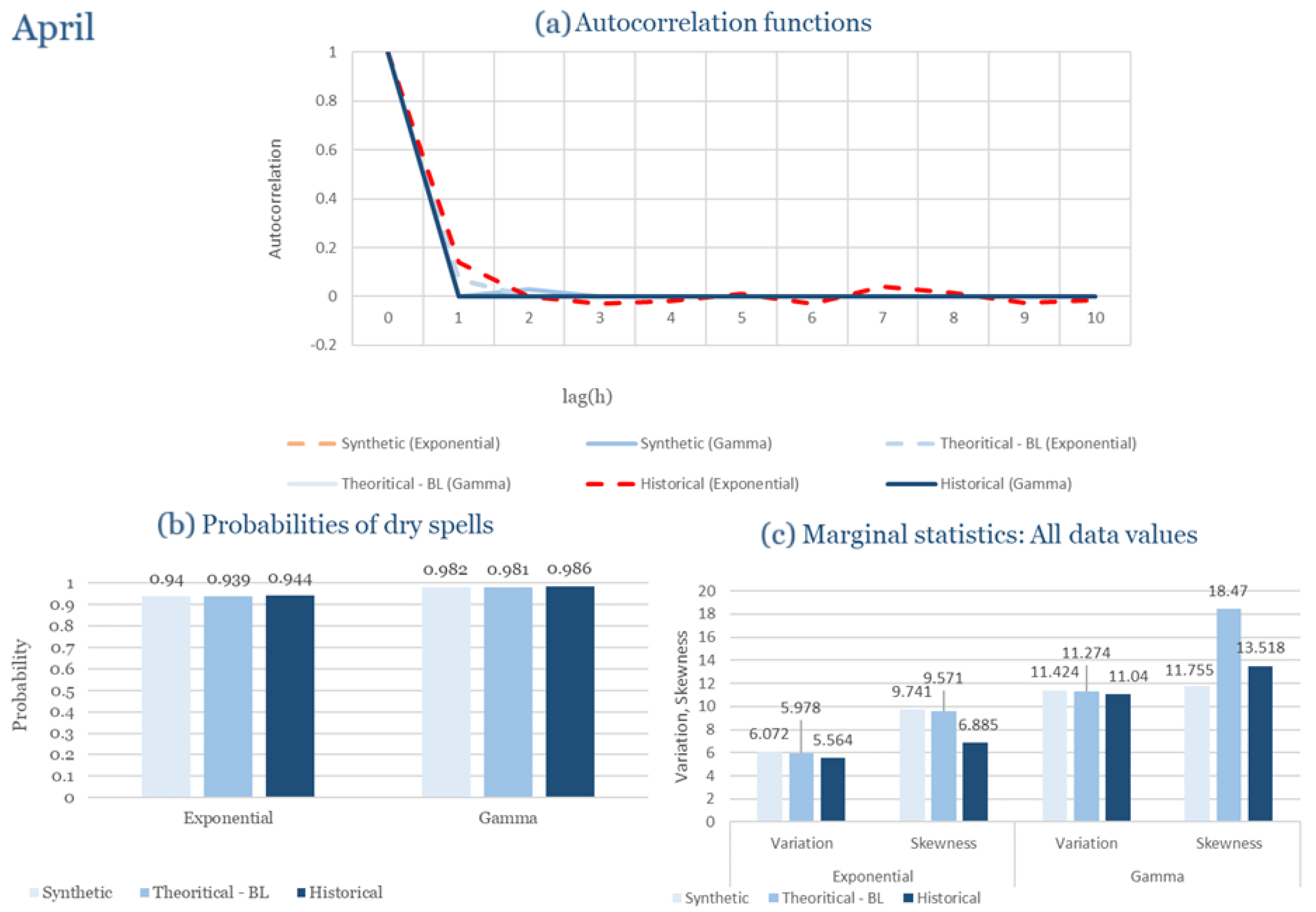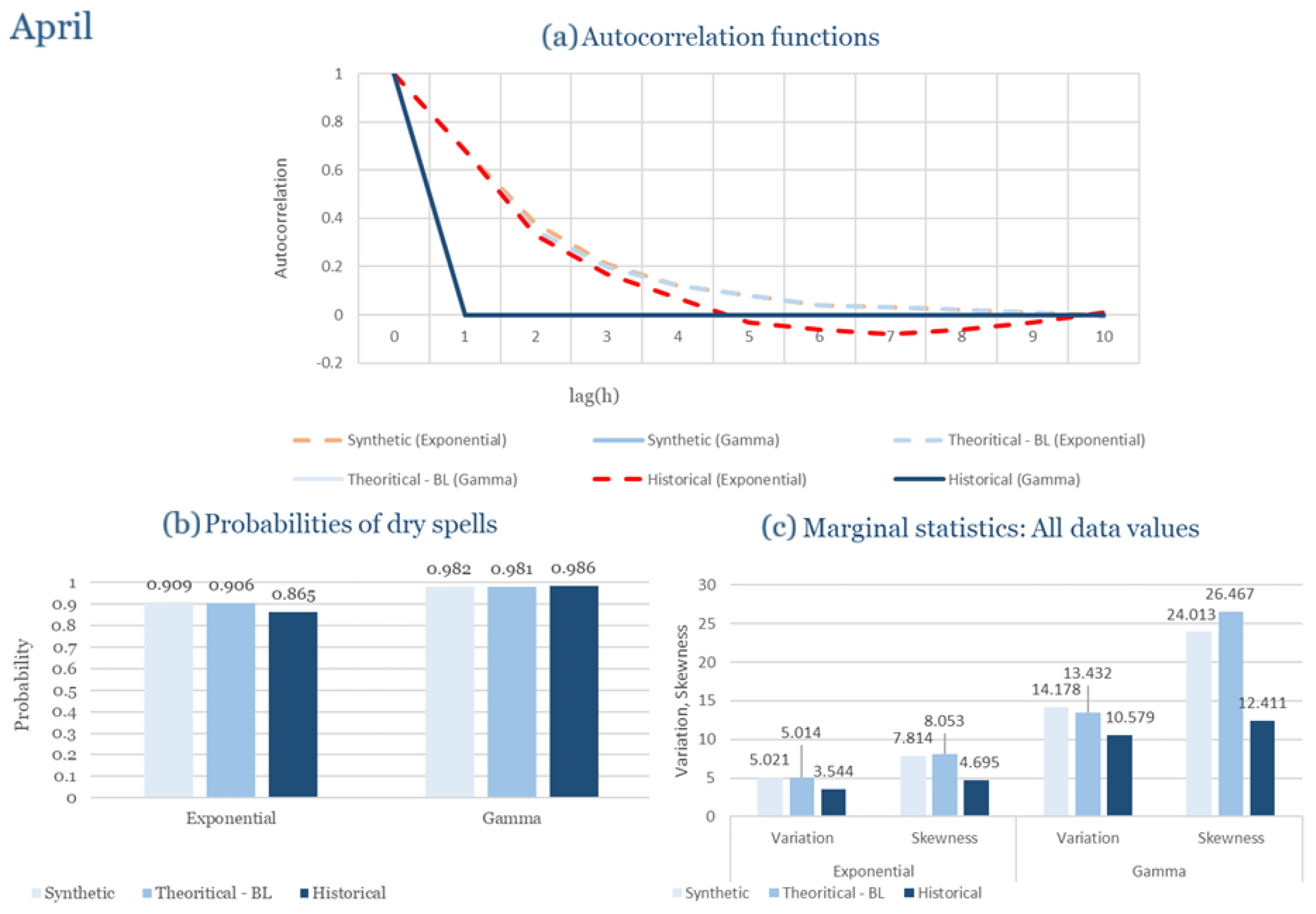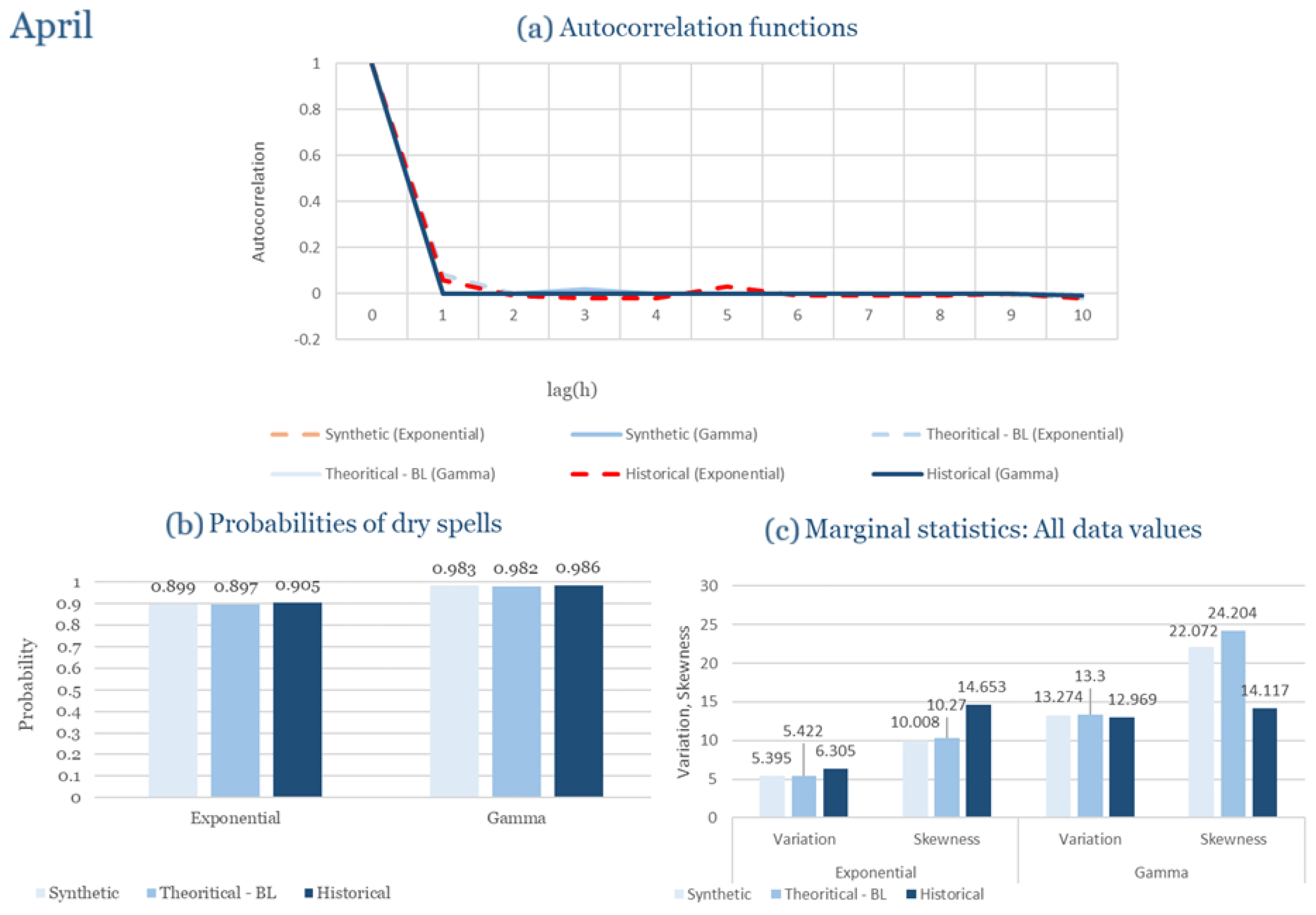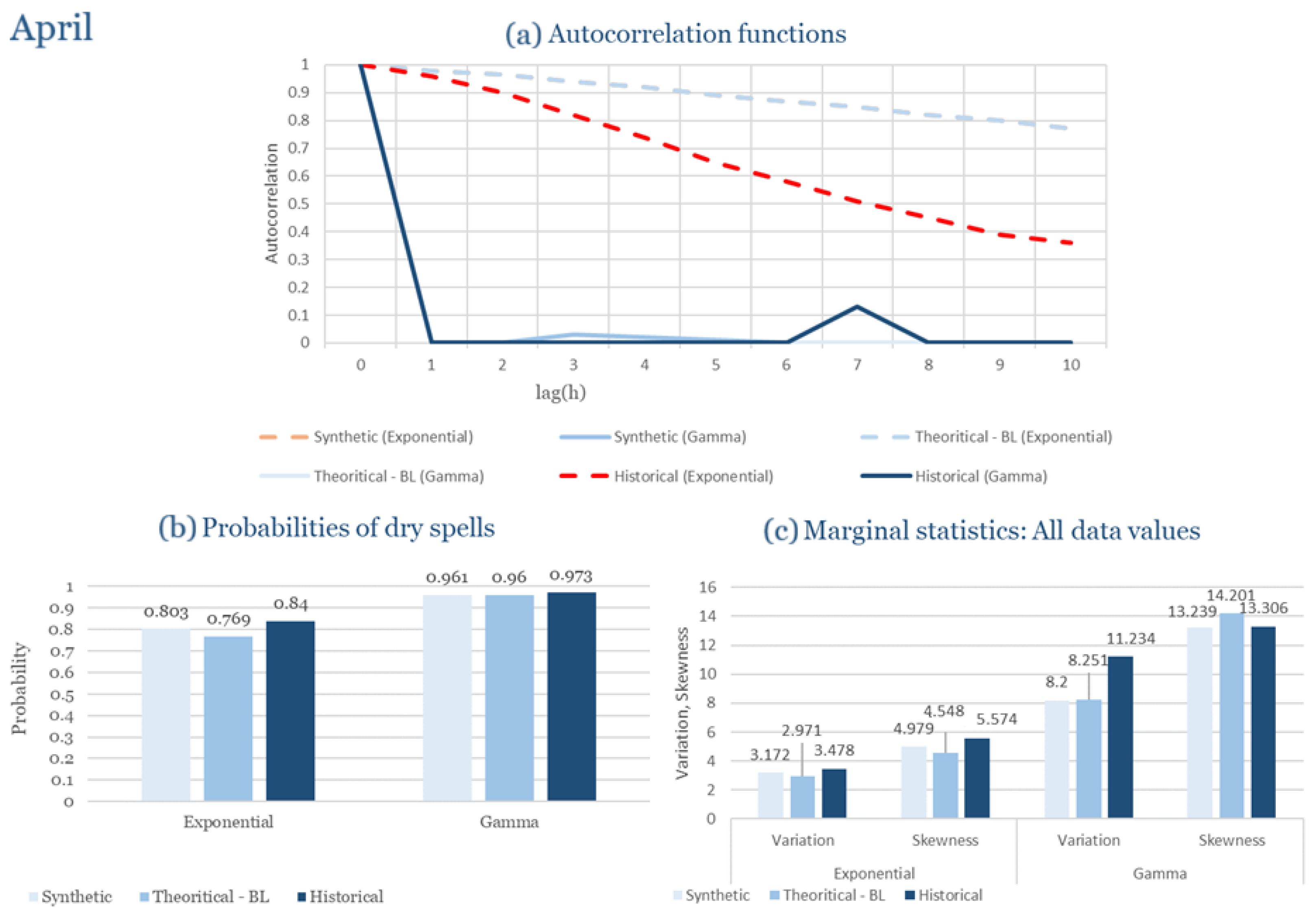 Statistical Characteristics of Alexandroupolis for April, with the intensity of the pulses following both distributions, where: (a) the diagram of the autocorrelation coefficient, (b) the diagram of the probability of dry and (c) the diagrams for the coefficient of variation and skewness of the historical and synthetic timeseries.