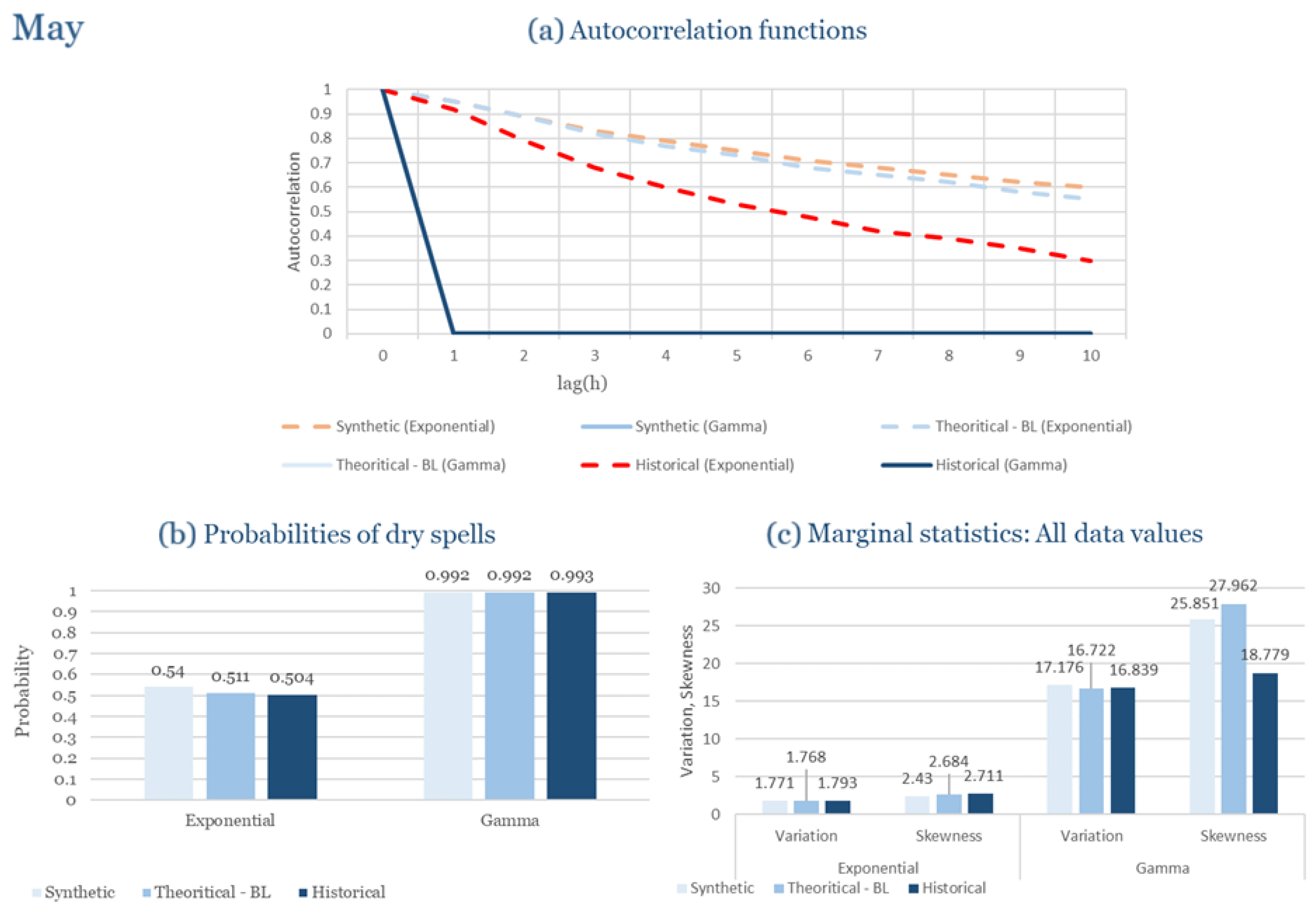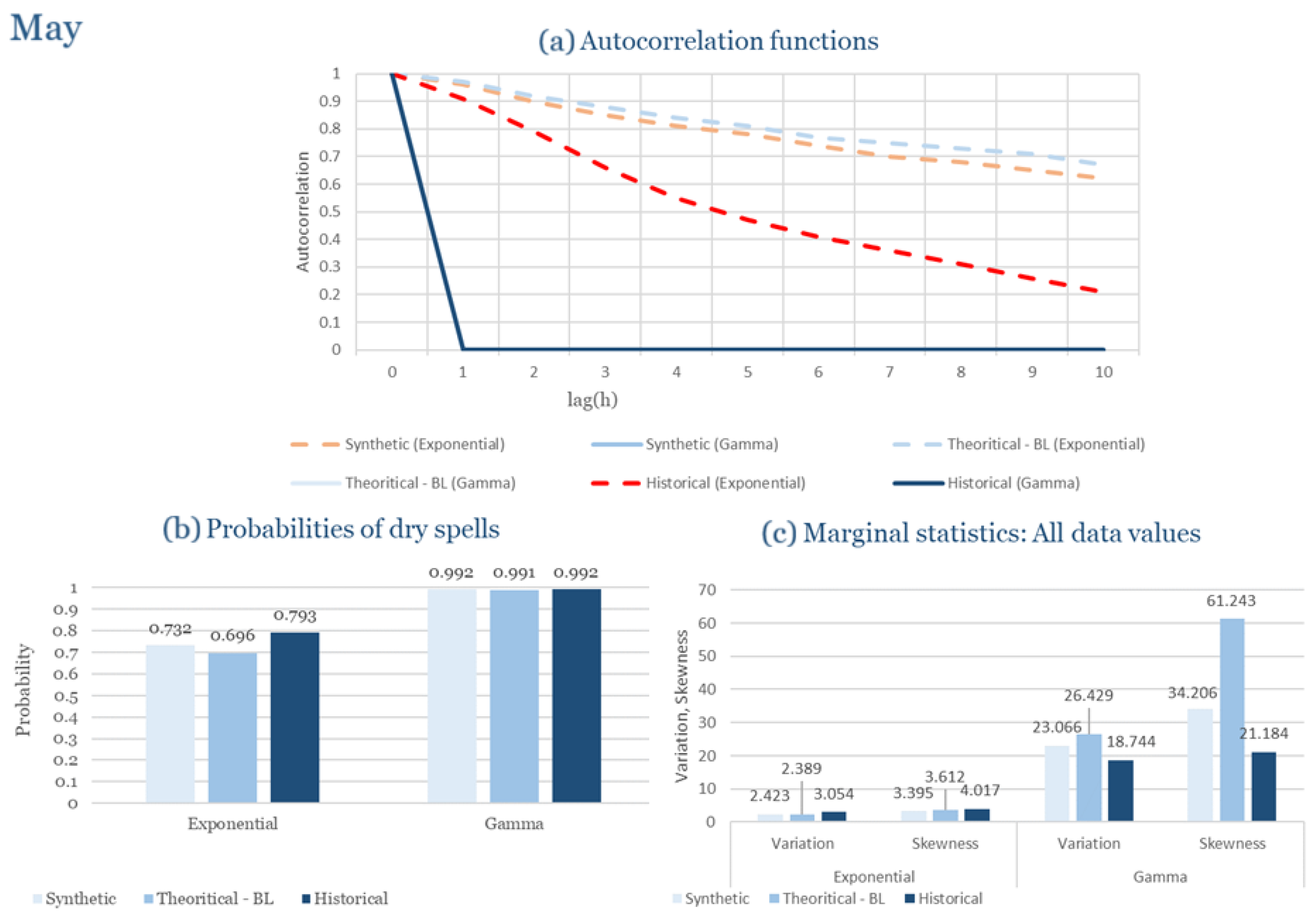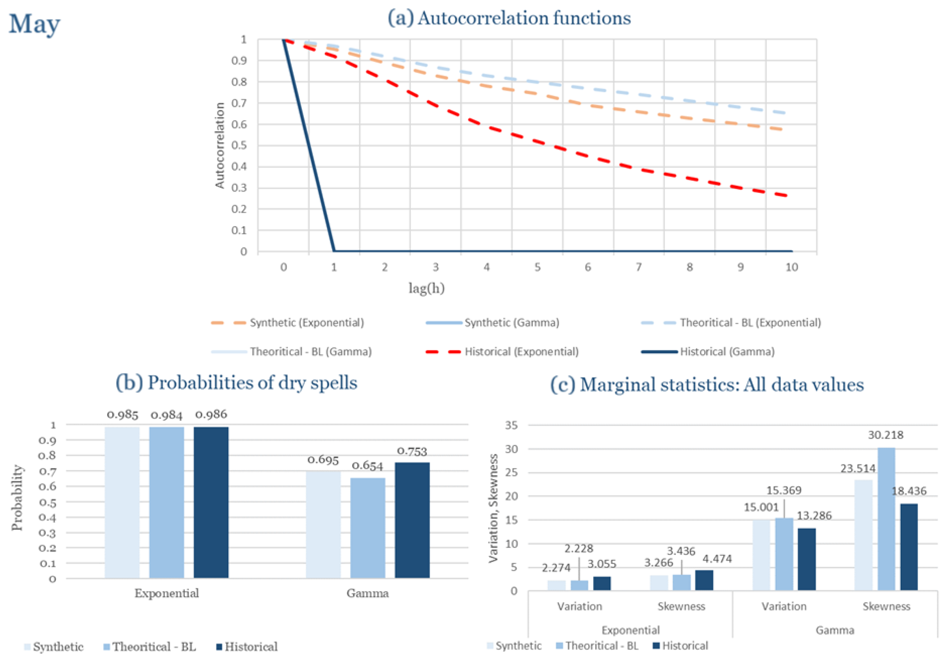 Statistical Characteristics of Rhodes for May, with the intensity of the pulses following both distributions, where: (a) the diagram of the autocorrelation coefficient, (b) the diagram of the probability of dry and (c) the diagrams for the coefficient of variation and skewness of the historical and synthetic timeseries.