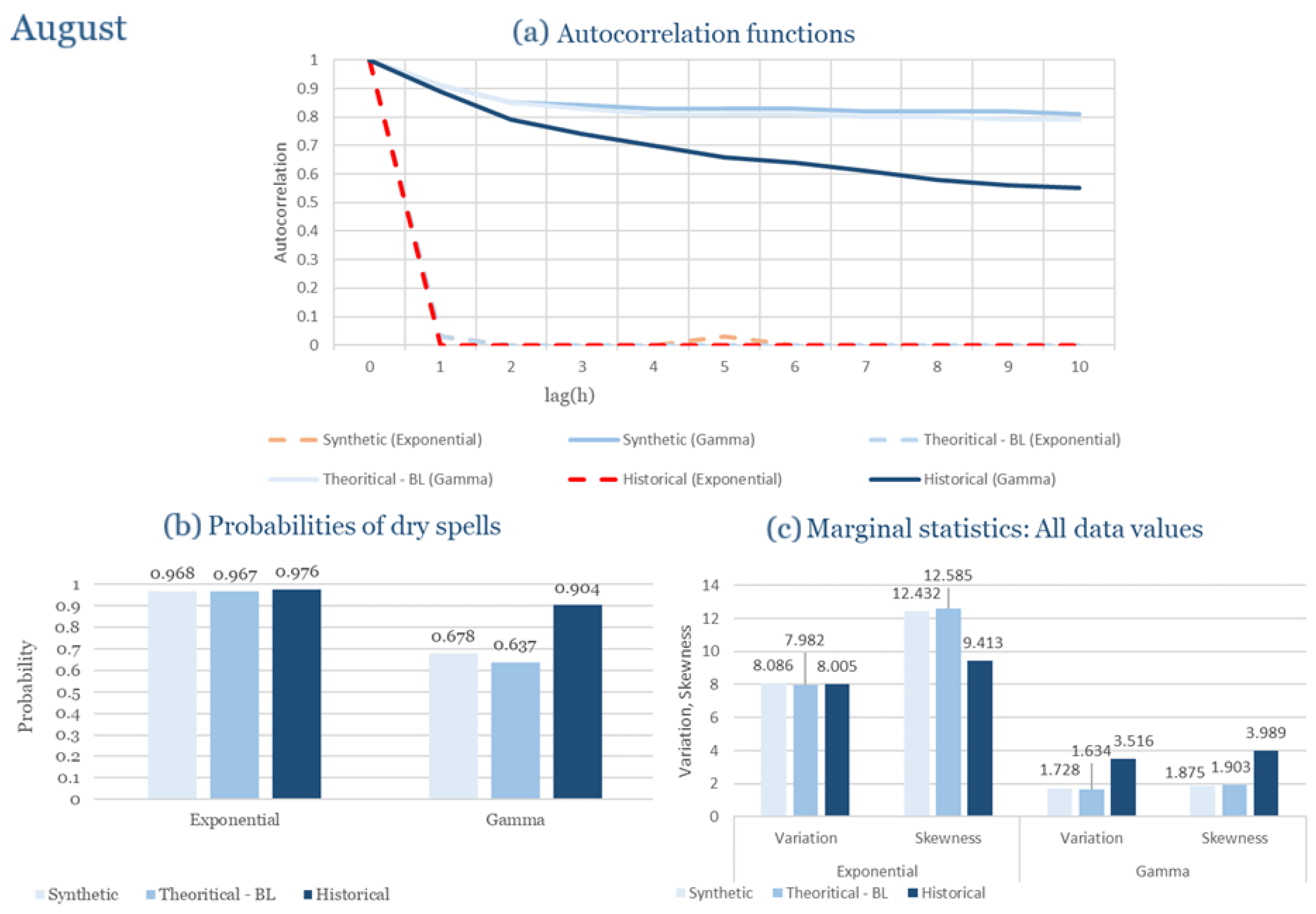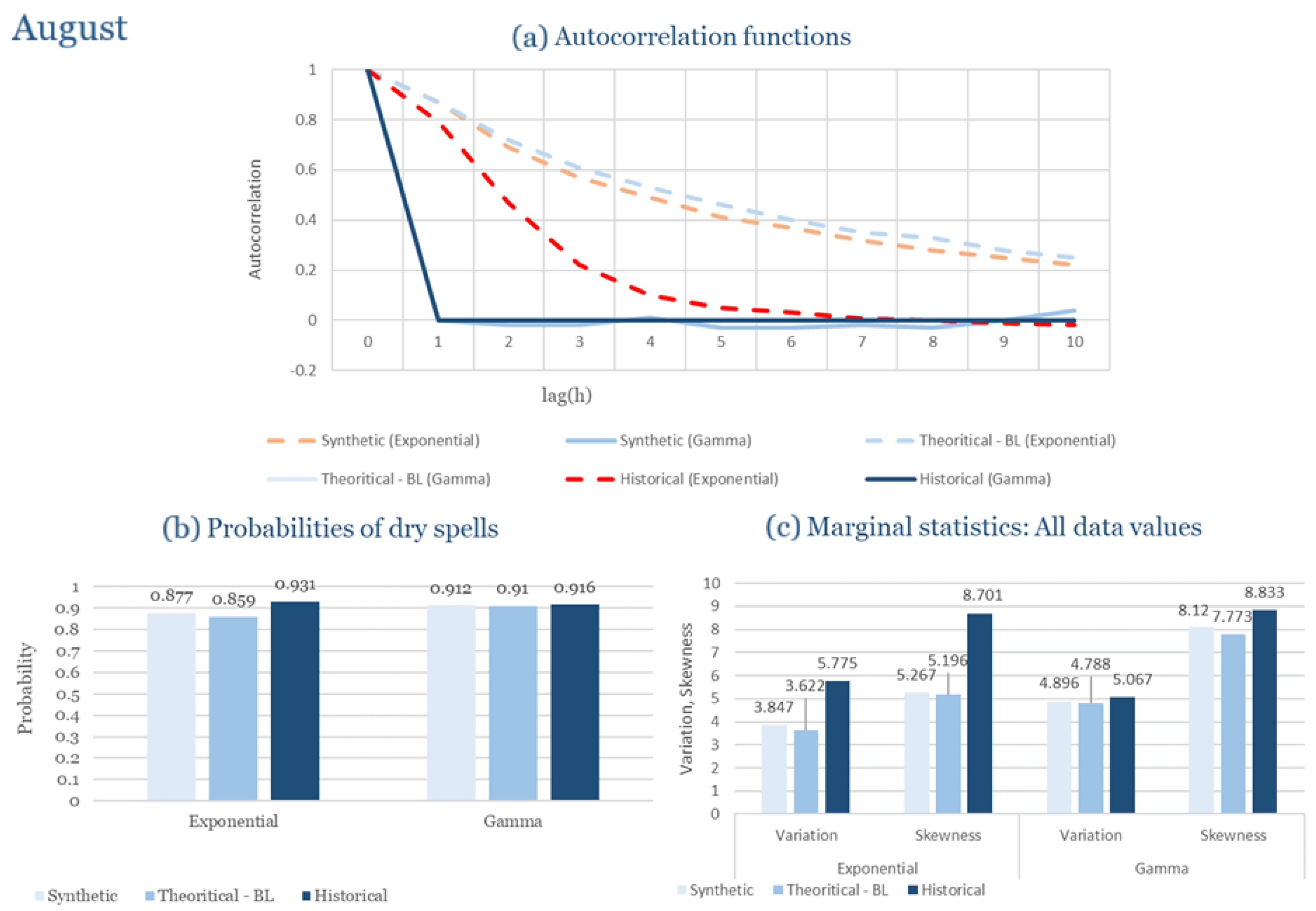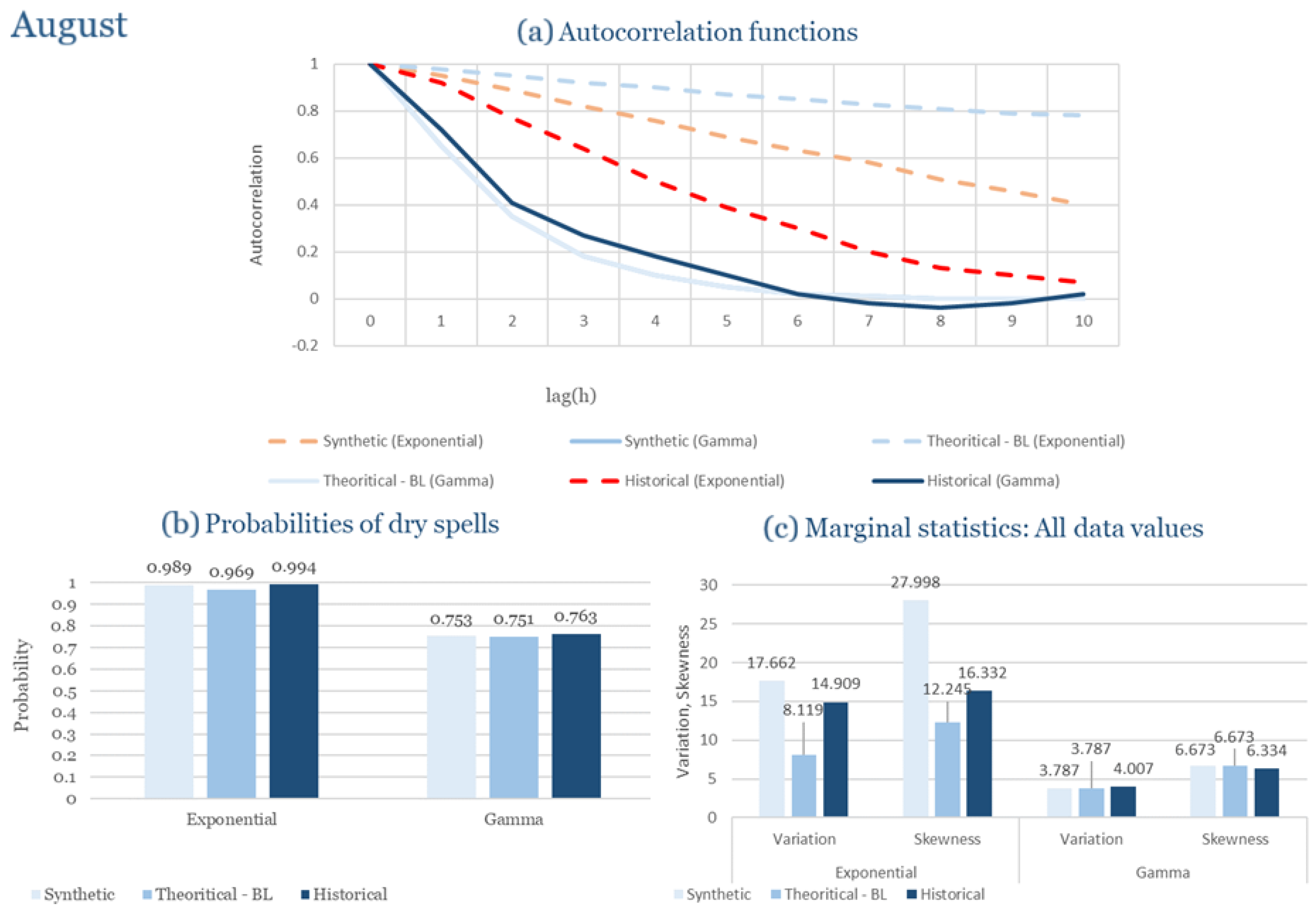 Statistical Characteristics of Alexandroupolis for August, with the intensity of the pulses following both distributions, where: (a) the diagram of the autocorrelation coefficient, (b) the diagram of the probability of dry and (c) the diagrams for the coefficient of variation and skewness of the historical and synthetic timeseries.
