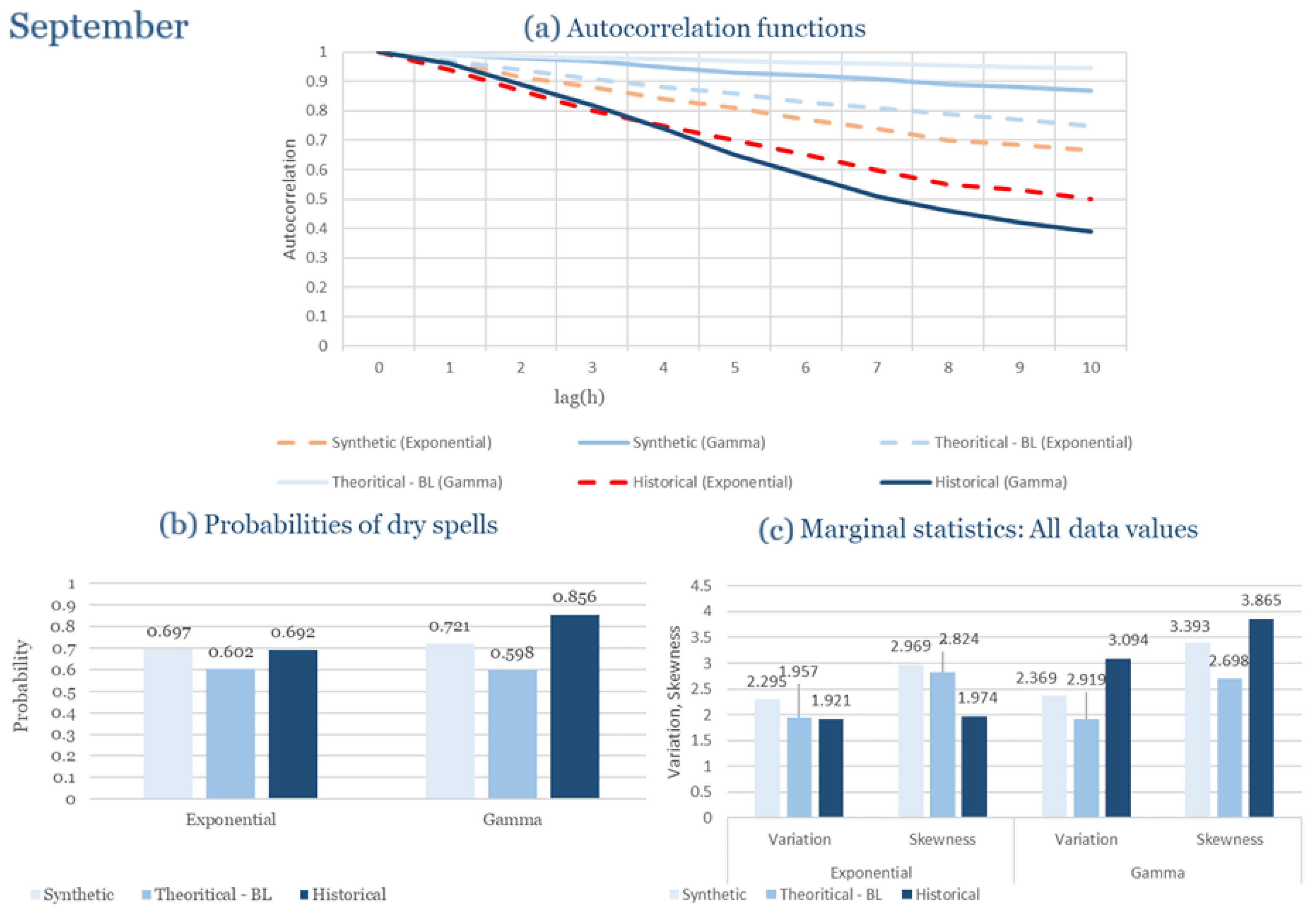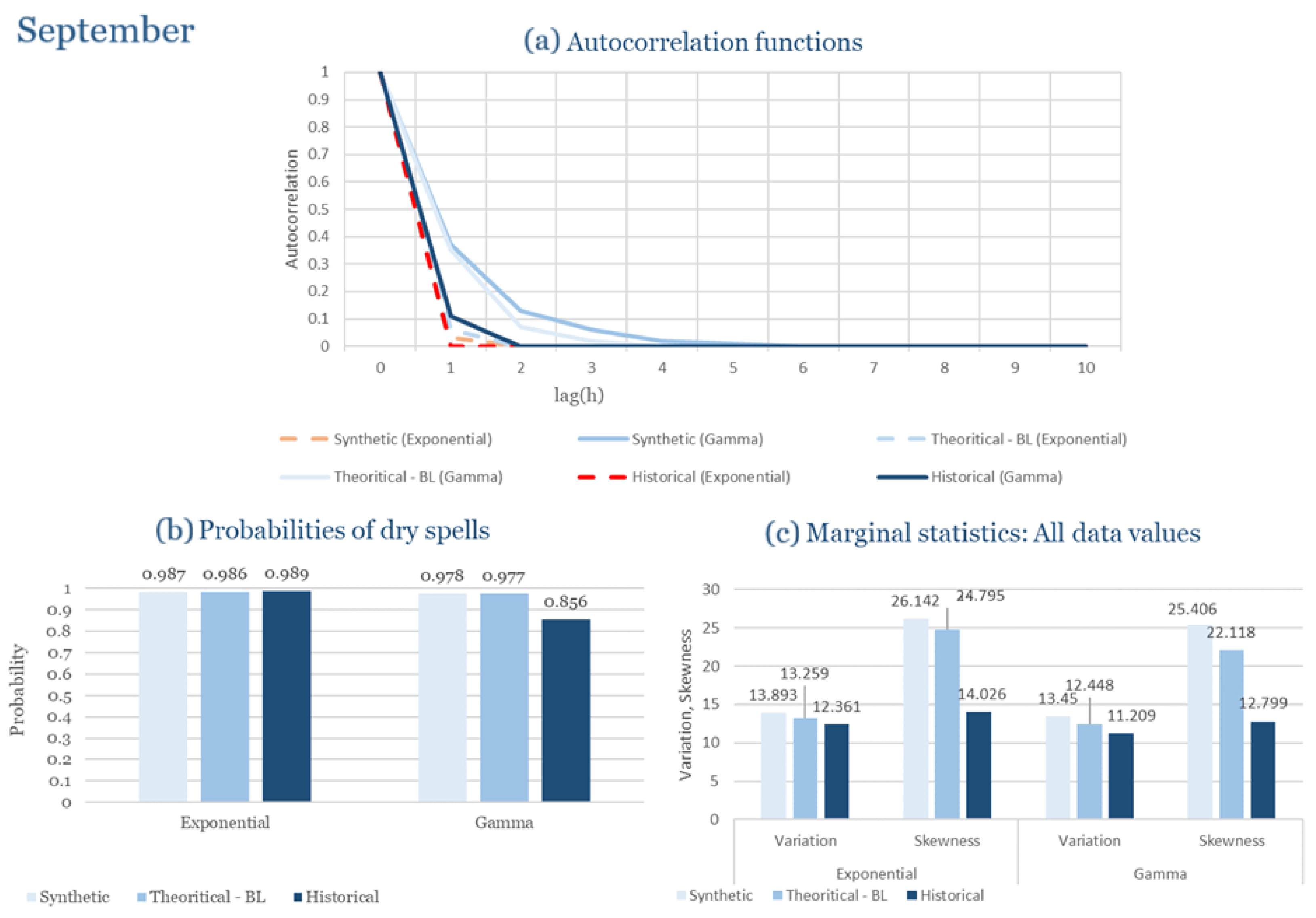 Statistical Characteristics of Alexandroupolis for September, with the intensity of the pulses following both distributions, where: (a) the diagram of the autocorrelation coefficient, (b) the diagram of the probability of dry and (c) the diagrams for the coefficient of variation and skewness of the historical and synthetic timeseries.