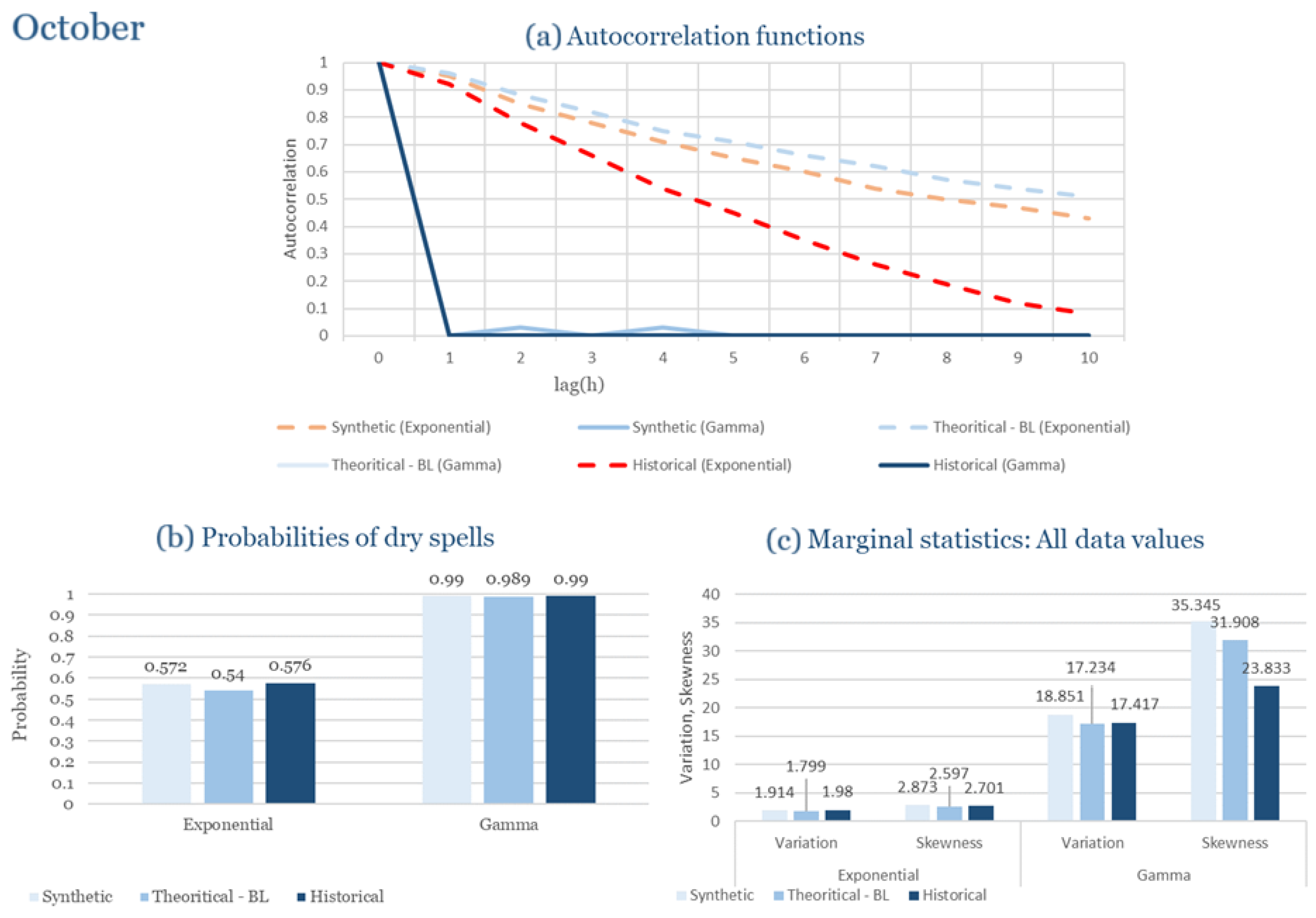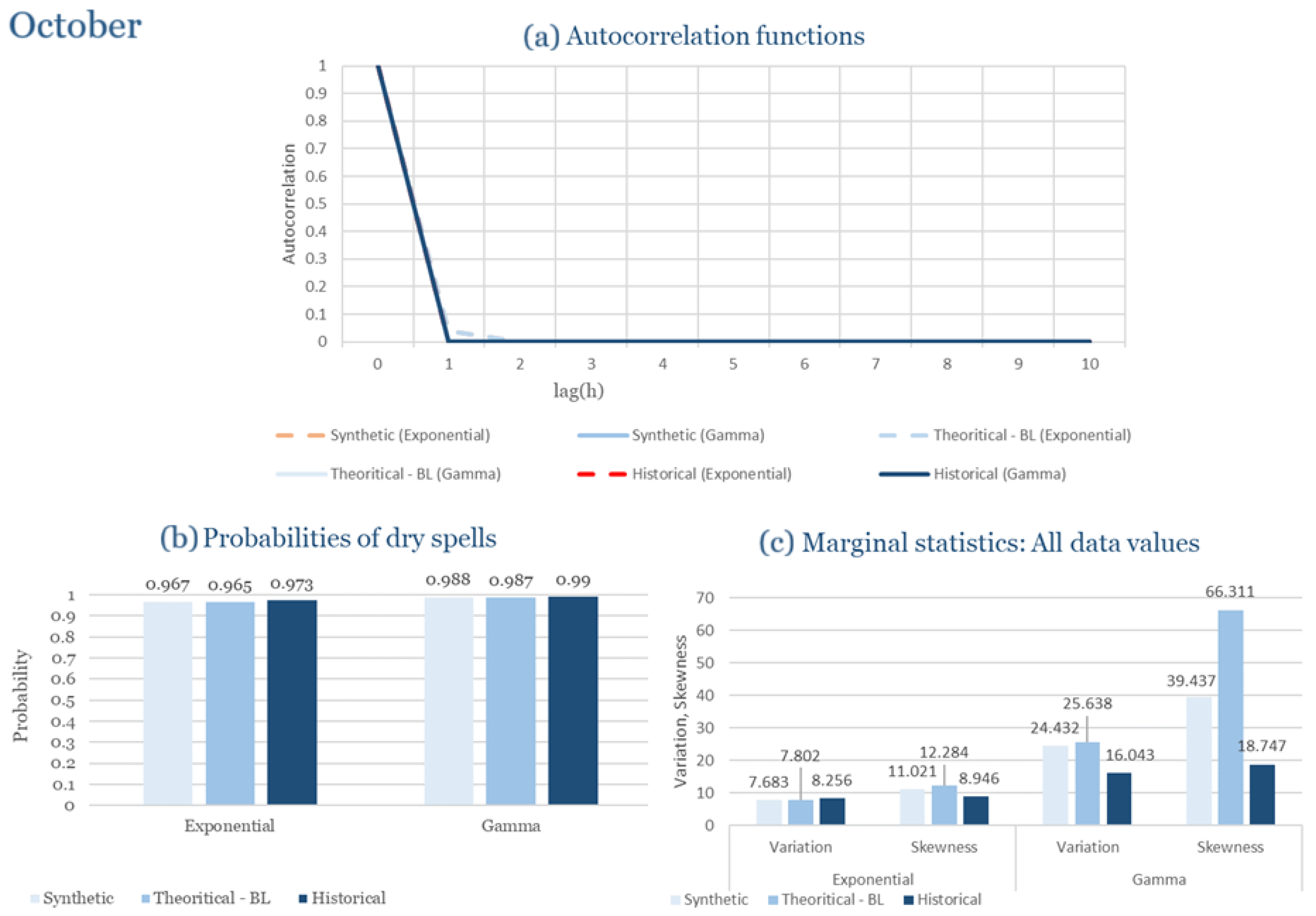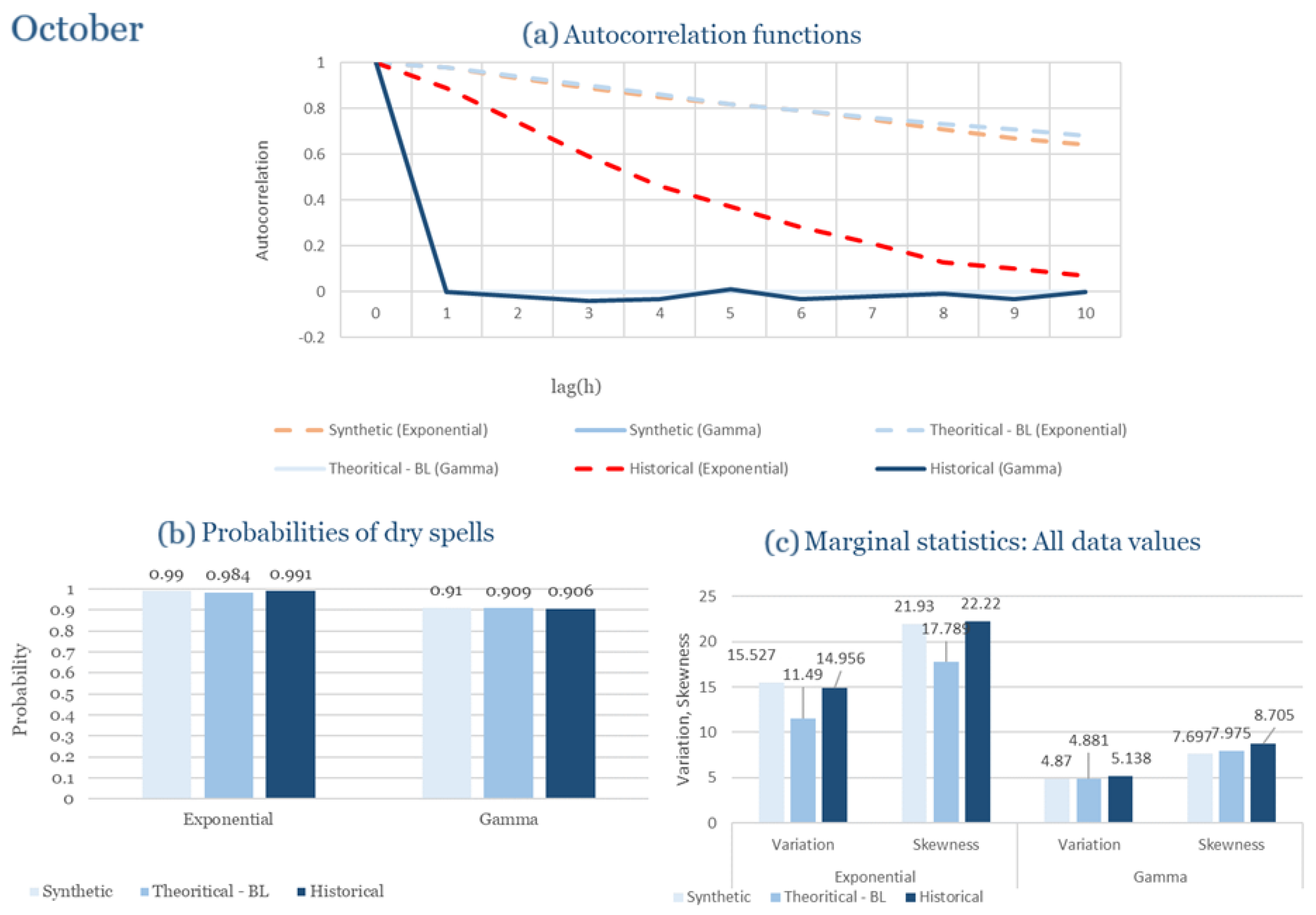 Statistical Characteristics of Alexandroupolis for October, with the intensity of the pulses following both distributions, where: (a) the diagram of the autocorrelation coefficient, (b) the diagram of the probability of dry and (c) the diagrams for the coefficient of variation and skewness of the historical and synthetic timeseries.
