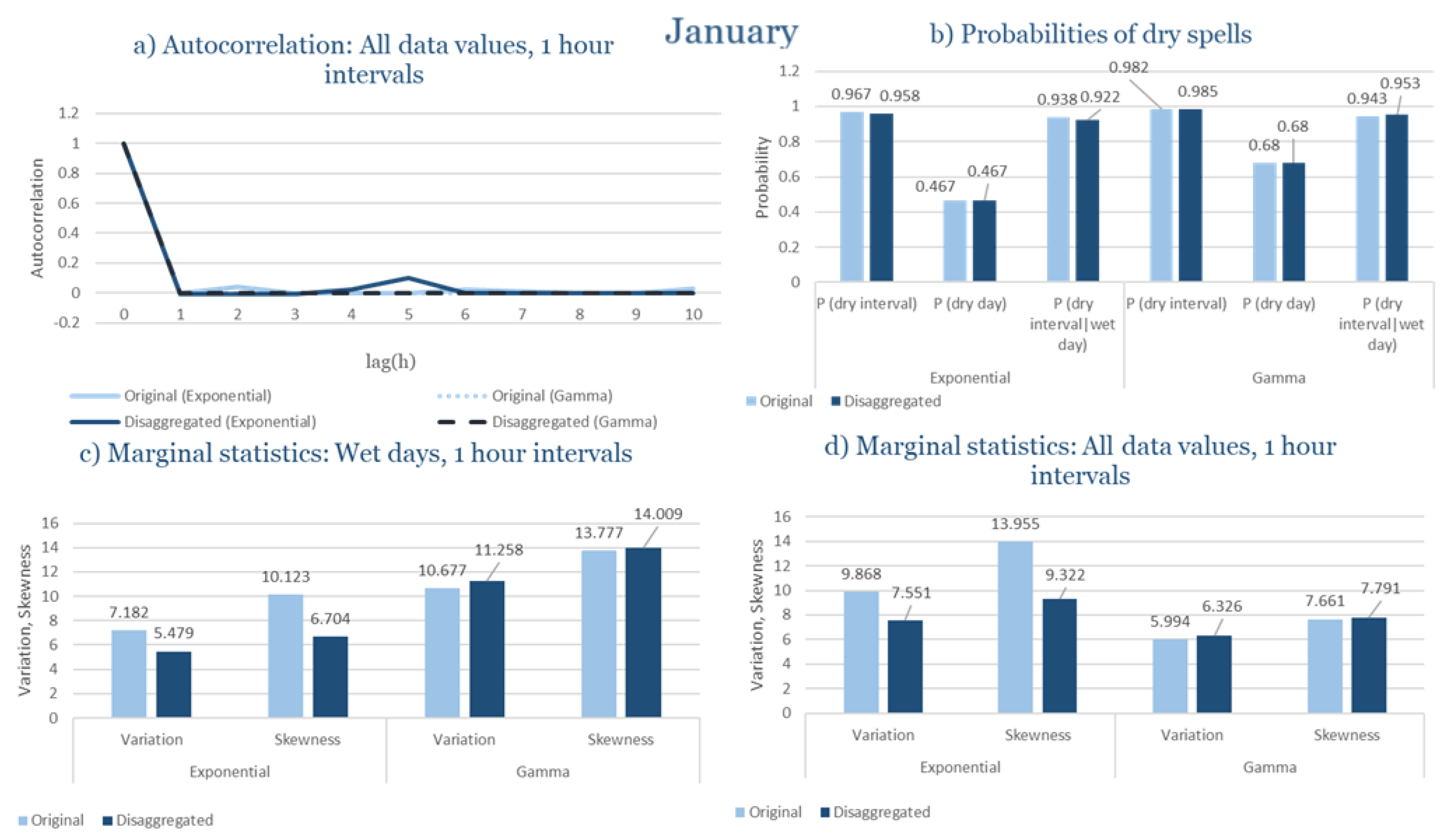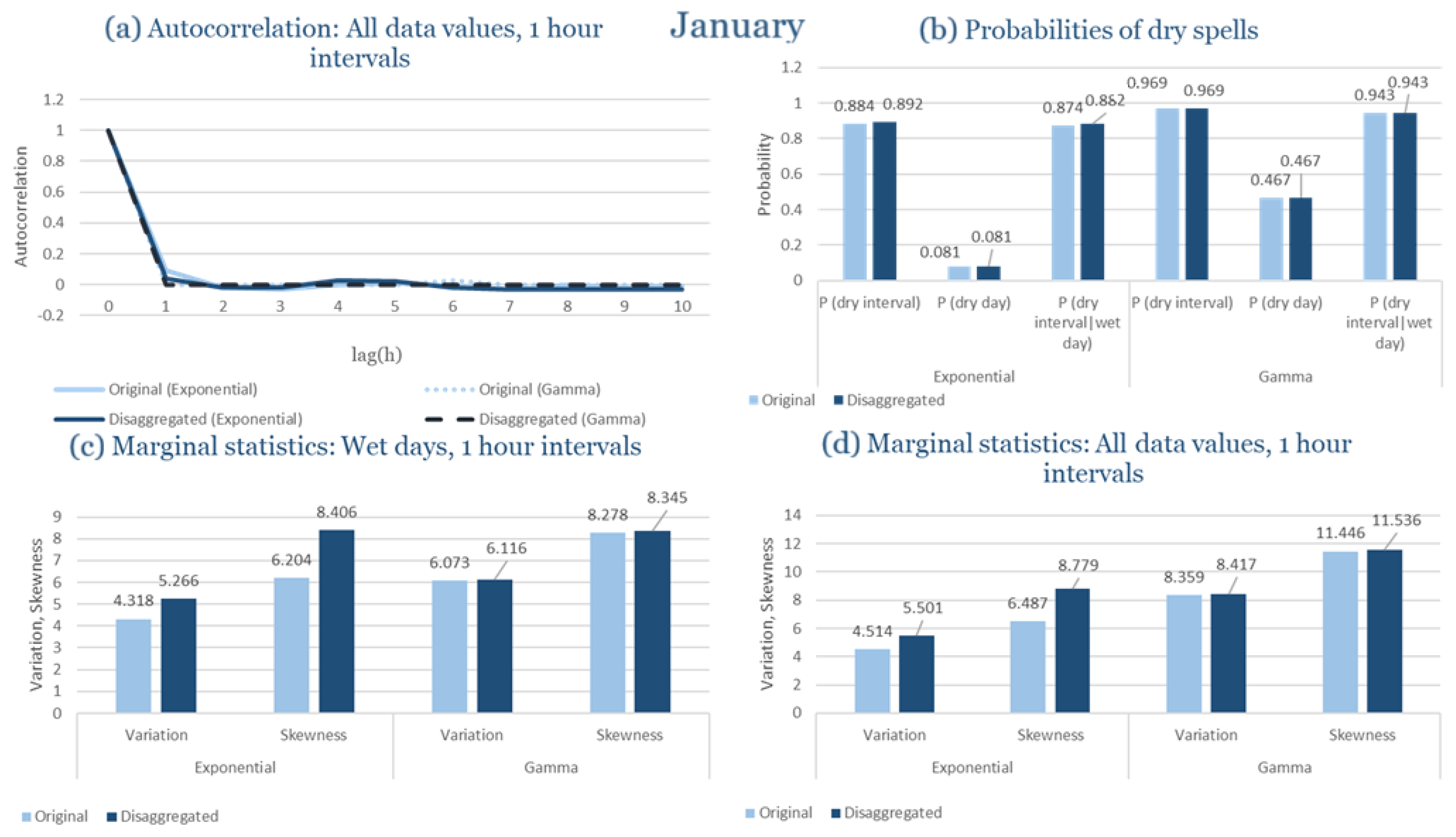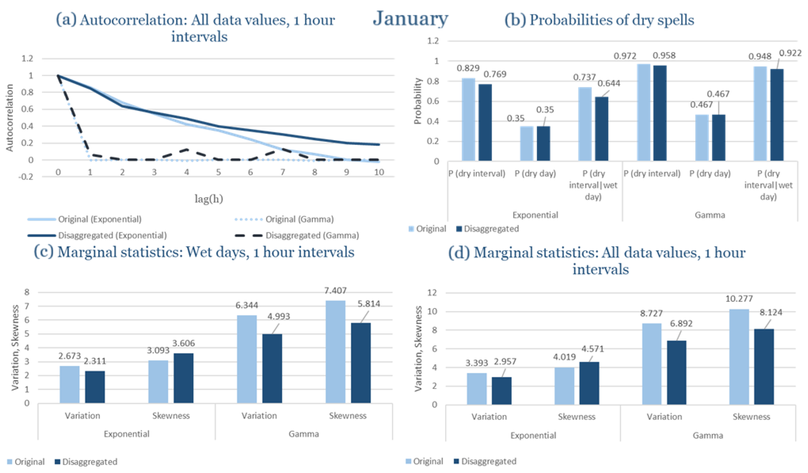 Statistical Characteristics of Alexandroupolis for January, with the intensity of the pulses following both distributions, where: (a) the diagram of the autocorrelation coefficient, (b) the diagrams of the probability of dry during a dry hour, a dry day and a dry hour||rainy day respectively, (c) the plots for the coefficient of variation and the coefficient of skewness of rainy days and (d) the plots for the coefficient of variation and the coefficient skewness for all data of the respective disagreggated time series.