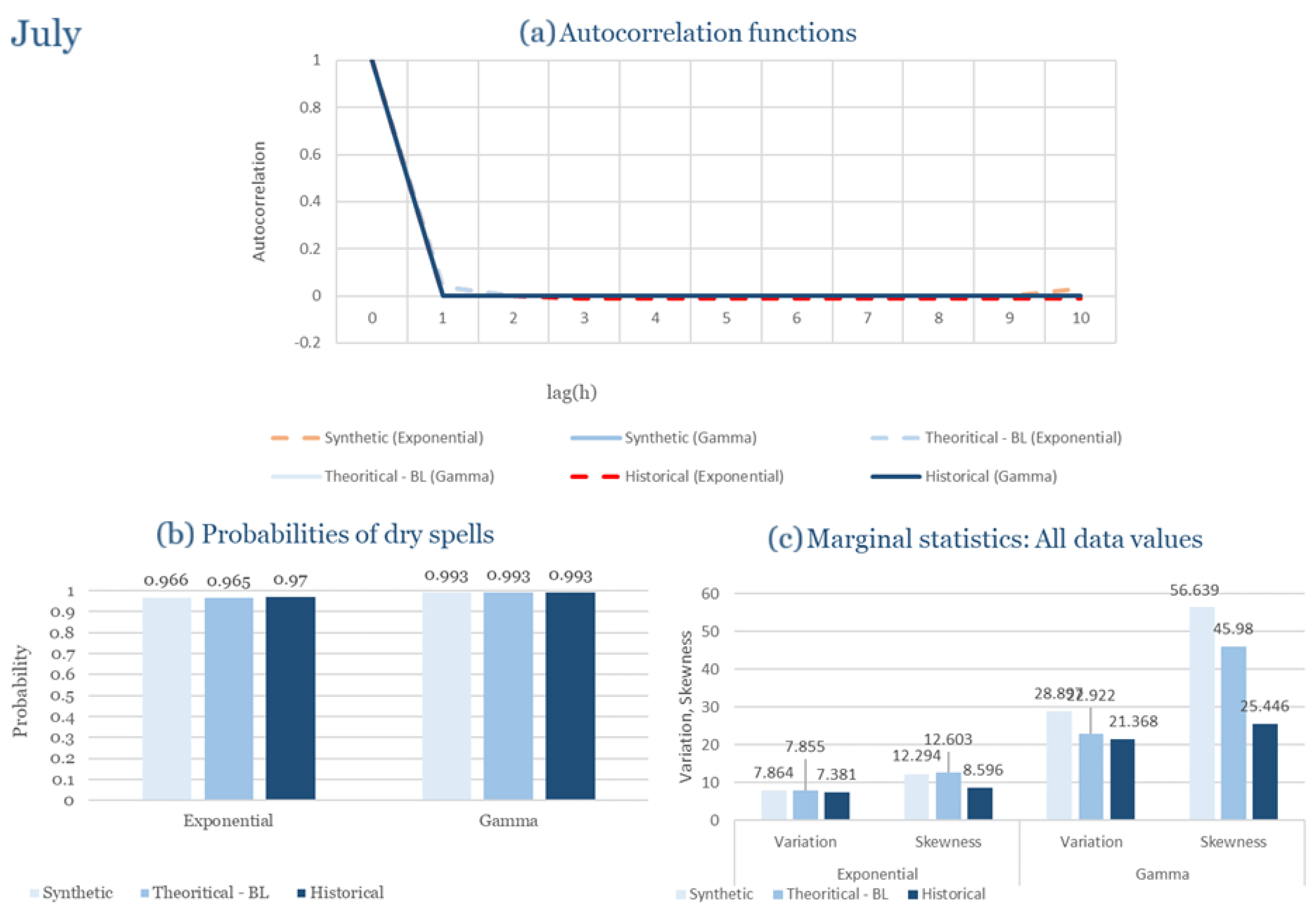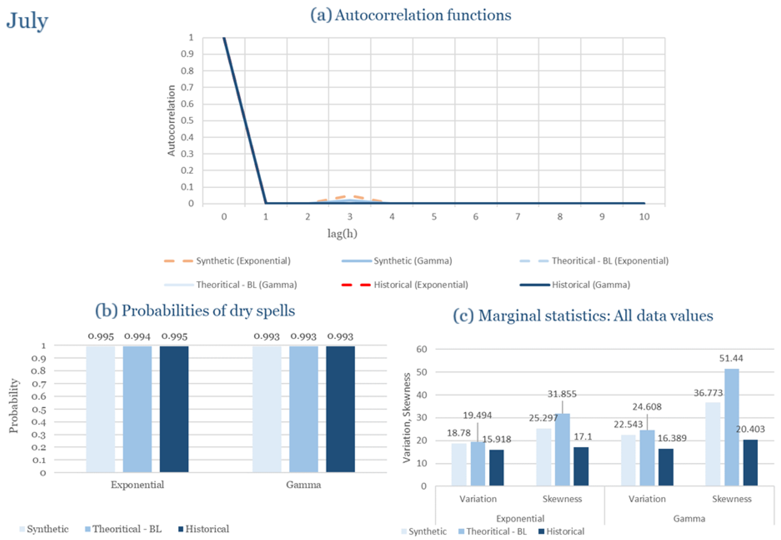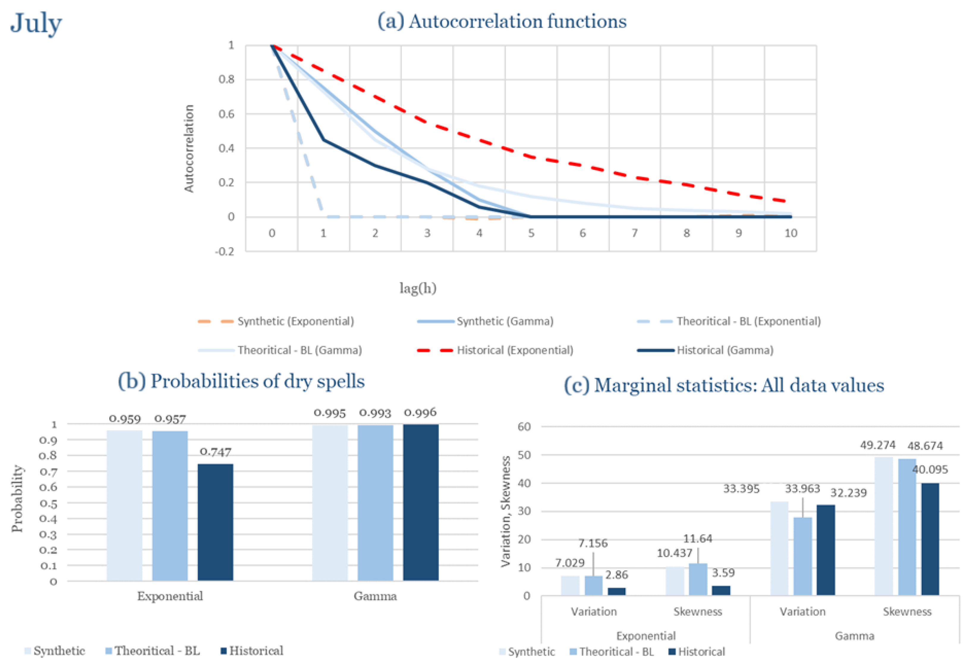 Statistical Characteristics of Alexandroupolis for July, with the intensity of the pulses following both distributions, where: (a) the diagram of the autocorrelation coefficient, (b) the diagram of the probability of dry and (c) the diagrams for the coefficient of variation and skewness of the historical and synthetic timeseries.