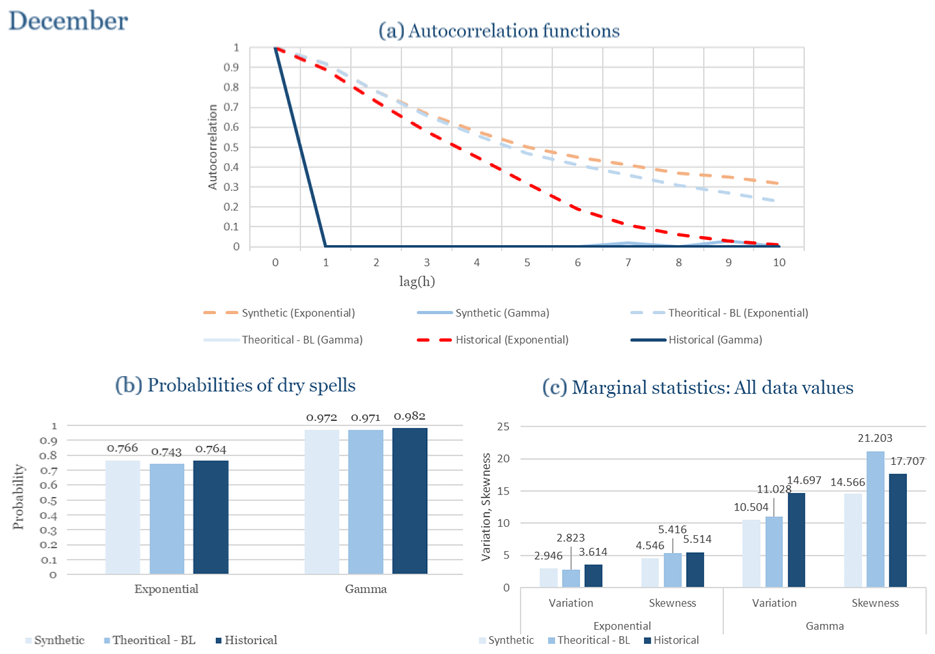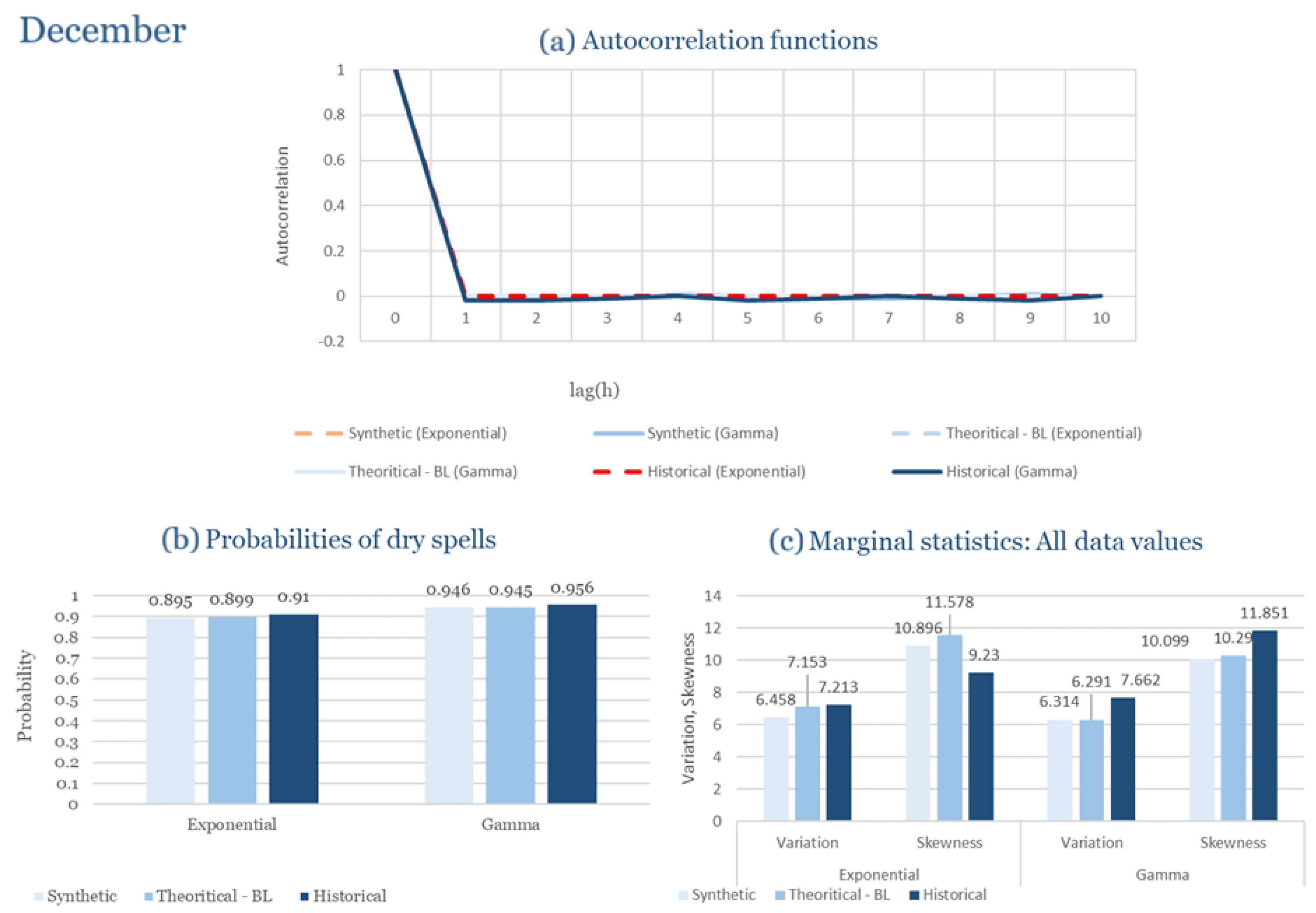 Statistical Characteristics of Alexandroupolis for December, with the intensity of the pulses following both distributions, where: (a) the diagram of the autocorrelation coefficient, (b) the diagram of the probability of dry and (c) the diagrams for the coefficient of variation and skewness of the historical and synthetic timeseries.