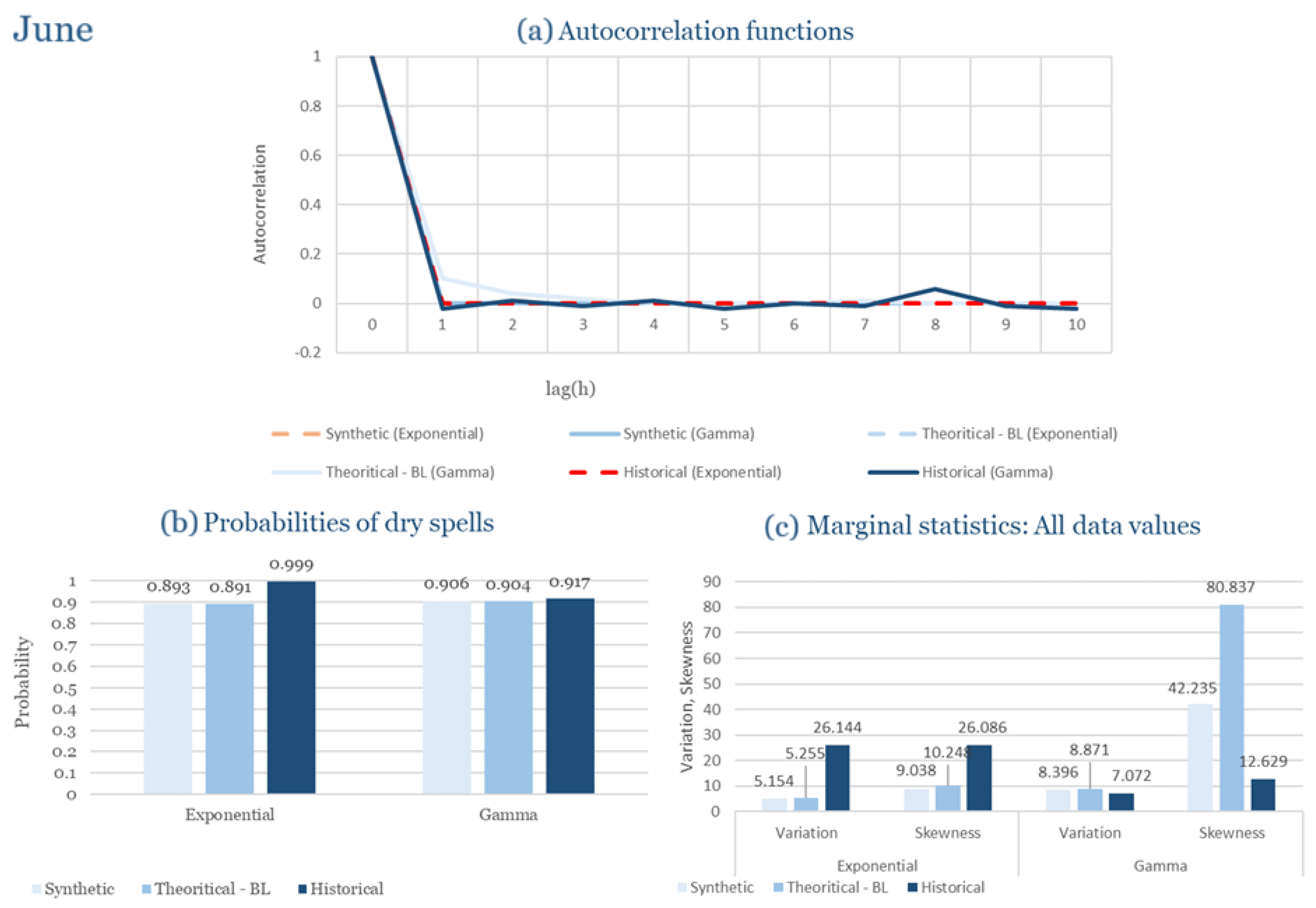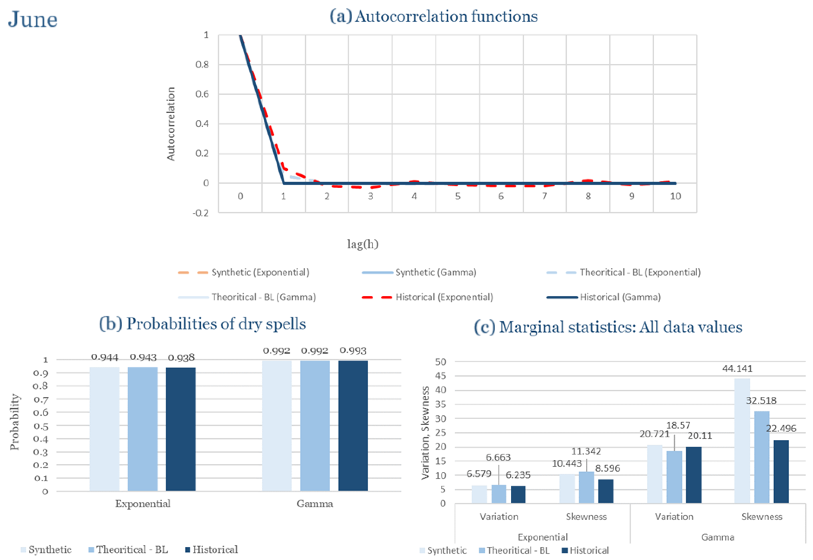 Statistical Characteristics of Alexandroupolis for June, with the intensity of the pulses following both distributions, where: (a) the diagram of the autocorrelation coefficient, (b) the diagram of the probability of dry and (c) the diagrams for the coefficient of variation and skewness of the historical and synthetic timeseries.