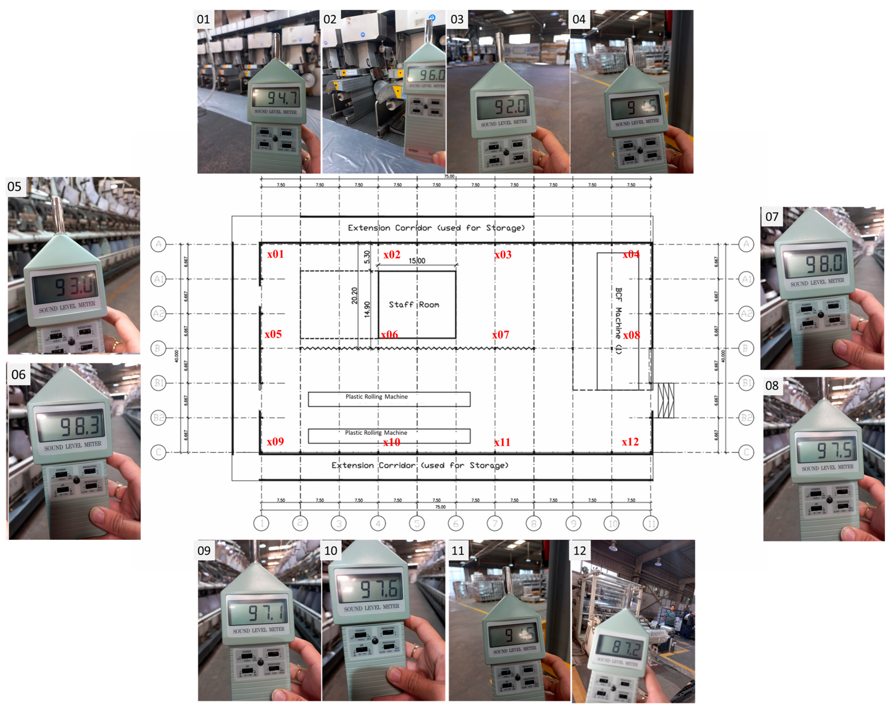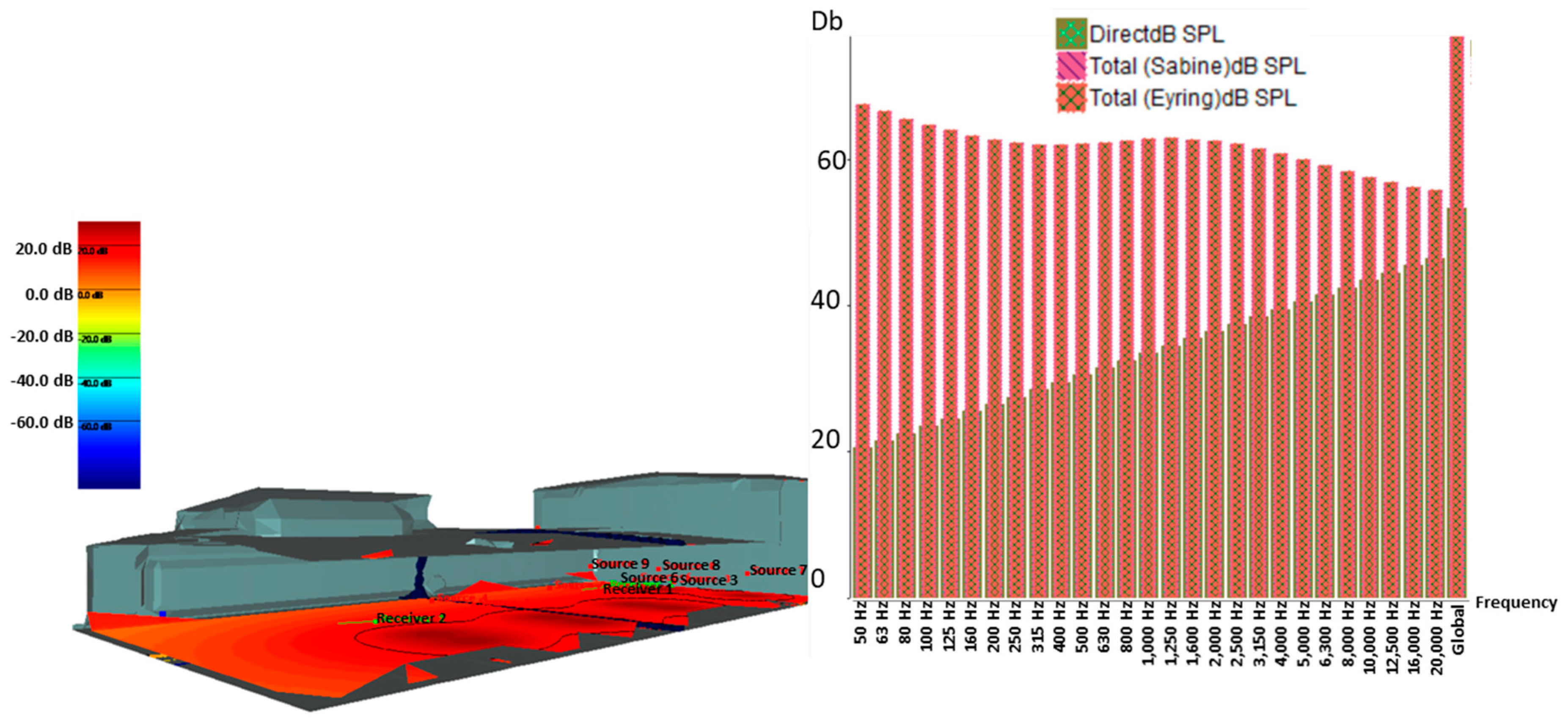 To investigate sound levels, three sound sources were placed for each machine (start–middle–end) at a height of 4 m (approx. half the machine height). Concrete sound absorption was set at 30%, and metal cladding sound absorption was set at 0%. Using I-Simpa version V1.5.4, an acoustic analysis, sound level distribution was scrutinized for the building and its surroundings to investigate the outdoor–indoor sound propagation effect. The sound level recordings are shown in