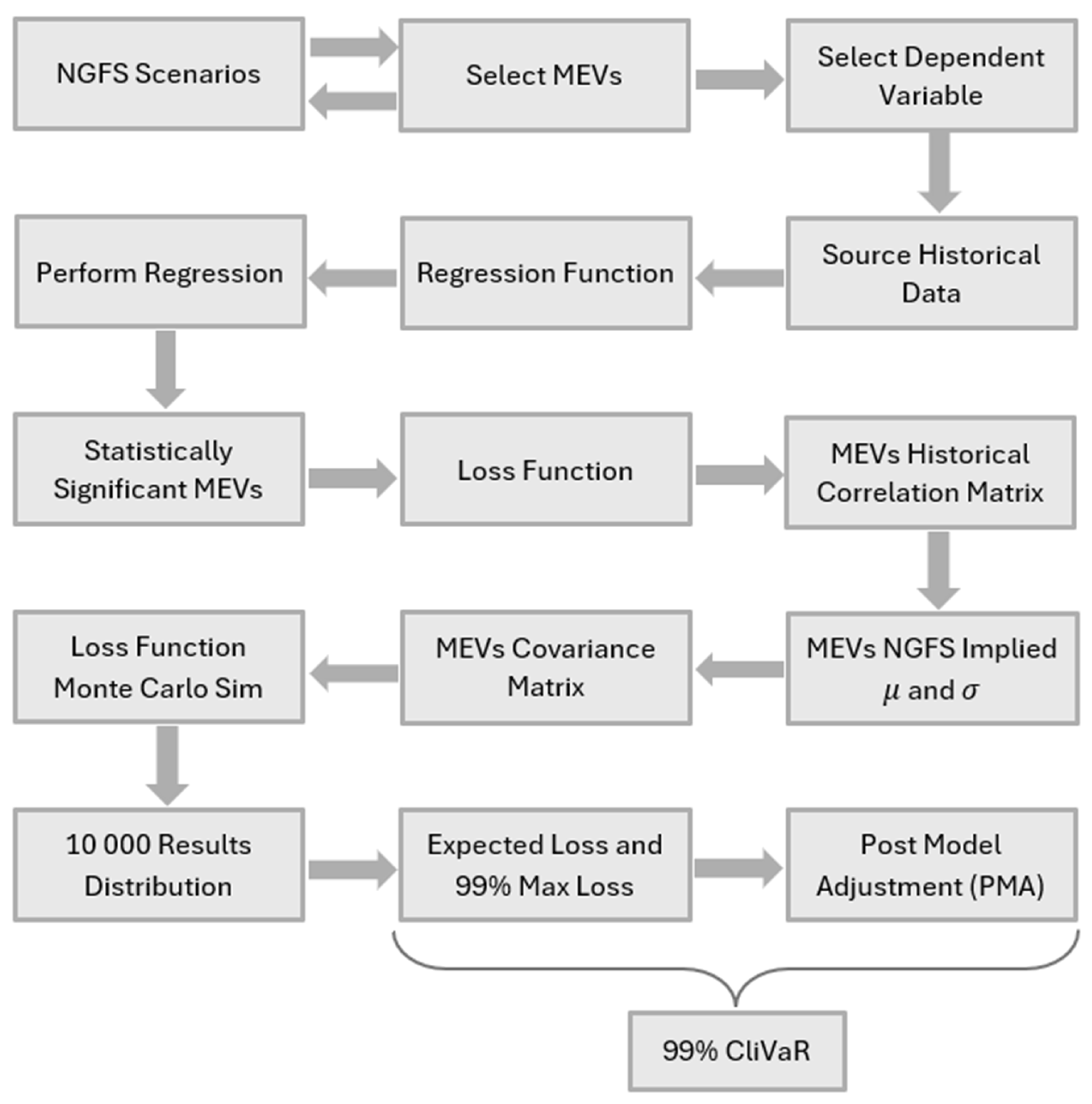 - The regression can also be improved by selecting more or different independent variables. Although this study used MEVs, that is not a requirement of the methodology. The only requirements are that the independent variables should be proxies for transmitters of climate risk to bank balance sheets and they should have associated NGFS, or alternative, forward-looking climate-specific scenarios.