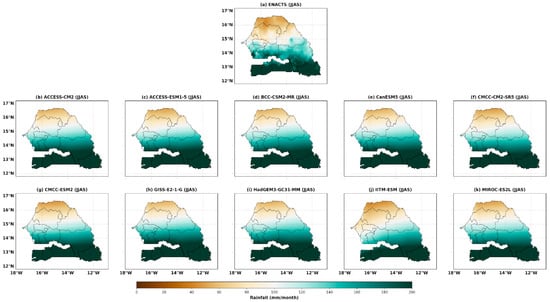 Mean June–September (JJAS) rainfall (in mm/month) over Senegal for the historical period 1985–2013. (a) shows observations from the ENACTS dataset, while panels (b–k) display simulations from 15 individual CMIP6 models.