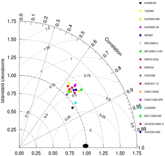 Figure 5 presents a Taylor diagram comparing the bias-corrected outputs of 15 CMIP6 models with ENACTS climate reference data. The diagram simultaneously displays three precipitation statistics: centered root mean square error (RMSE), correlation coefficient (r), and normalized standard deviation (STD), providing a concise visual summary of model performance [27].