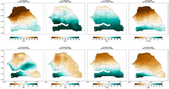The CDD index (Figure 6a) highlights a pronounced north–south gradient, with longer dry spells in the northern regions (Saint-Louis, Louga, and Matam) and shorter dry periods in the southern regions (Ziguinchor, Kolda, and Sedhiou). This gradient reflects the influence of the West African Monsoon and the contrasting arid conditions in the Sahelian north.