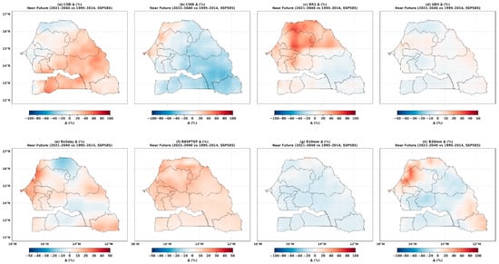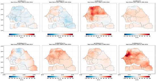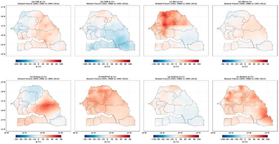 In Figure 11 related to the near-future period (2021–2040), several indices exhibit significant changes in their spatial patterns. As presented in Figure 9, the maximum number of consecutive wet days (CWDs; Figure 9b), mean daily rainfall intensity (SDII; Figure 9d), maximum 5-day precipitation accumulation (Rx5day; Figure 9e), and the frequency of heavy rainfall events (R10mm and R20mm; Figure 9g,h) demonstrate decreasing trends across large portions of northern Senegal. For example, SDII is projected to decline by approximately 15%, while CWDs may decrease by up to 50% in certain northern areas.