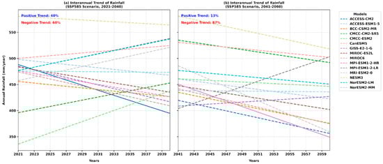 Inter-annual trends in annual rainfall over Senegal under the CMIP6 SSP585 scenario for (a) the near future (2021–2040) and (b) the distant future (2041–2060). Each colored line represents a linear trend from an individual climate model, with dashed lines indicating trends that are not statistically significant (p ≥ 0.05) and solid lines indicating significant trends (p < 0.05) based on a two-sided t-test. In Figure (a), 40% of the models project an increase in rainfall, while 60% show a decrease. In Figure (b), only 13% of models project an increase, while 87% project a decrease, highlighting a broad consensus toward drying conditions in future projections.