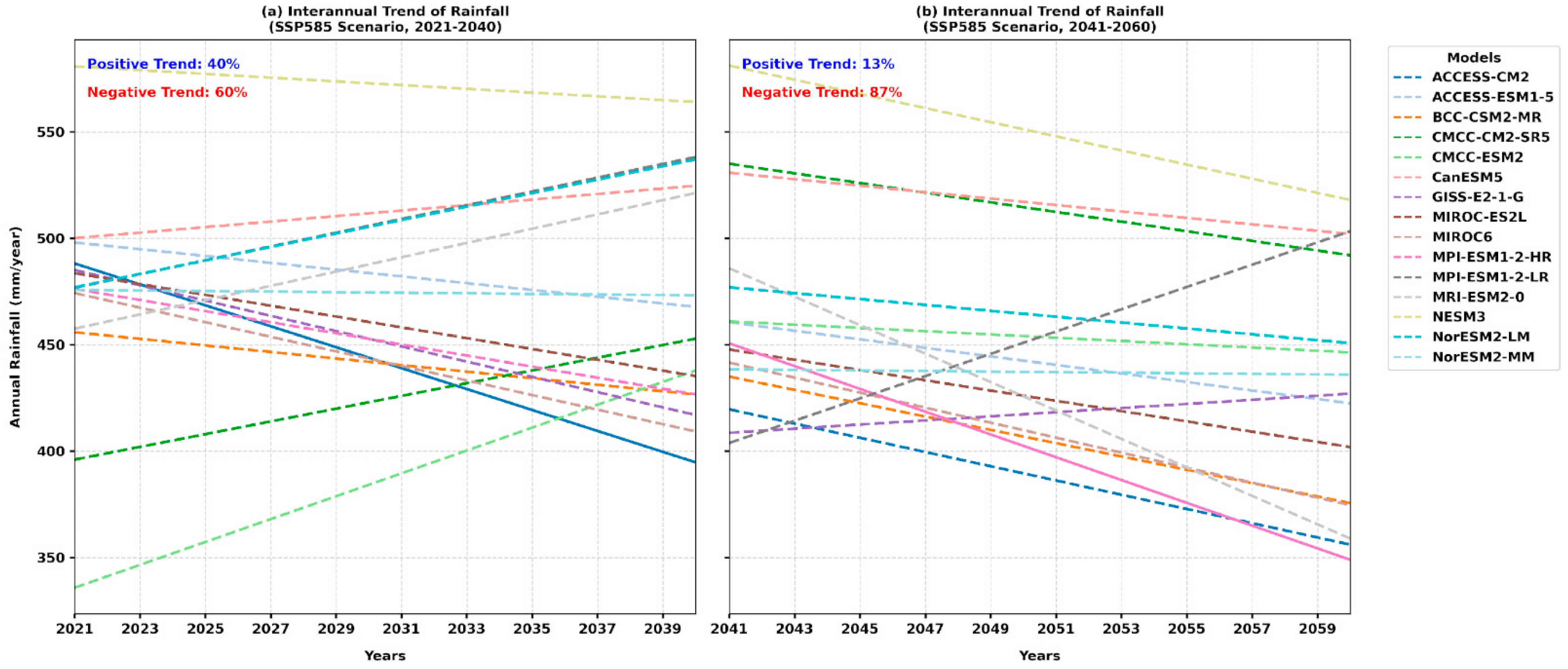 3.5. Temporal Trends in Rainfall Indices Under SSP585 Scenario