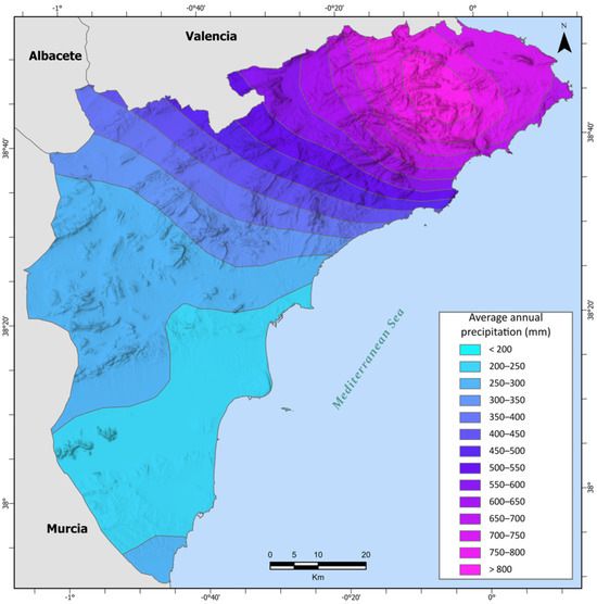 Map of average annual precipitation in the province of Alicante (1991–2020). Source: Peral García et al. [51].