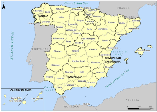 - Martín Vide, J.; Olcina Cantos, J. (Eds.) Climas y Tiempos de España; Alianza Editorial, S.A.: Madrid, Spain, 2001; ISBN 8420657778. [Google Scholar]