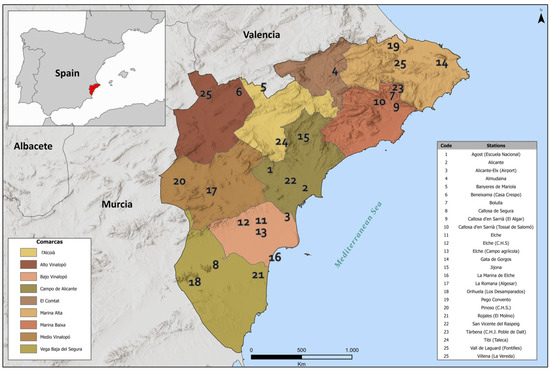 Location of the study area and the meteorological stations used in the province of Alicante.