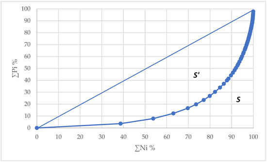 The area S′ compressed between the curve and the equidistribution line is the difference between 5000 (area of the triangle below the equidistribution line) and the value of S, to find the area between the curve, the equidistribution line, and ordinate 100 (S′). With this value, the CI is defined as: