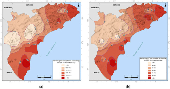 (a) Percentage of precipitation representing 25% of the rainiest days in the province of Alicante (1981–2020); (b) percentage of precipitation representing 10% of the rainiest days in the province of Alicante (1981–2020).