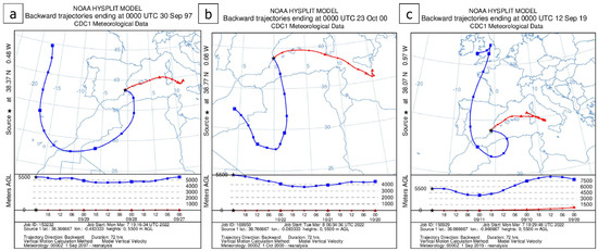 Retro-trajectories of North African origin at altitude (500 hPa) and Mediterranean origin on the surface. (a) 30 September 1997 (Alicante—Ciudad Jardín); (b) 23 October 2000 (Vall de Laguard); (c) 12 September 2019 (Orihuela (Los Desamparados)). Source: [61].