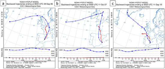 Northern back trajectories at altitude (500 hPa) and on the surface. (a) 29 September 1986 (Tárbena); (b) 11 October 2007 (Vall de Laguard); (c) 11 September 2019 (Vall de Laguard). Source: [61].