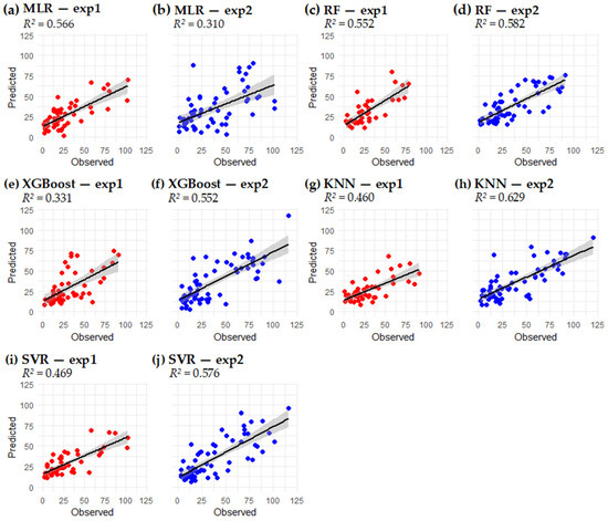 Scatter plots of observed versus predicted data from MLR (a,b), RF (c,d), XGBoost (e,f), KNN (g,h), and SVR (i,j) models. Data from exp1 in red and exp2 in blue.