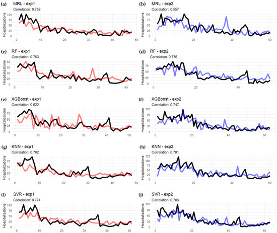 Figure 2 shows the comparison between the observed and predicted time series for the different models in two experiments: exp1 (left column in red) and exp2 (right column in blue). As explained previously, each machine learning model was fitted with a different 80–20 split of the data, which resulted in variations in the training and validation sets for each one. For this reason, the figures showing the observed and predicted data time series show X and Y axes with different lengths. It is possible to observe the actual hospitalizations (black line) and the model predictions (colored line) for the analysis period of each model, with the correlation between the observed and predicted values indicated in each graph. In MLR, it is observed that the performance in exp1 (Figure 2a) is superior to that of exp2 (Figure 2b) (0.752 versus 0.557). This result indicates that the MLR model fits better when there is a smaller set of variables including air pollution. The prediction in exp2 presents larger oscillations and a less accurate fit to the fluctuations observed in the hospitalization predictions. The RF model (Figure 2b,c) presents high correlations in both experiments (0.763 in exp1 and 0.776 in exp2). Although both experiments demonstrate good adherence to the behavior of the observed time series, it is noted that the RF model in exp2 presents a slightly better and more consistent fit, suggesting that the RF benefits from the longer time series of exp2. The XGBoost model (Figure 2e,f) presents moderate performance in exp1 (correlation 0.622), improving significantly in exp2 (correlation 0.747). This result indicates that XGBoost also benefits from a longer time series. However, there are still deviations in some peaks of hospitalizations, suggesting that XGBoost has some difficulty in capturing some more abrupt fluctuations. KNN (Figure 2g,h) shows an improvement in correlation from 0.702 in exp1 (Figure 2g) to 0.781 in exp2 (Figure 2h). This result suggests that KNN is favored by the larger amount of temporal data in experiment 2, allowing a more robust fit to hospitalization patterns. SVR presents a high correlation in both exp1 (0.774 in Figure 2i) and exp2 (0.786 in Figure 2j), with a slight increase in the second experiment. SVR is the model that presents greater stability between the two experiments, with predictions that closely follow the observed series. The high correlation in both experiments suggests that SVR is effective in capturing time series trends, regardless of the number of variables or the length of the time series. Overall, the time series plots in Figure 2 highlight that the RF, KNN, and SVR models show greater fitting ability in exp2, benefiting from the longer time series and better capturing hospitalization patterns over time. Among the models, SVR stands out for its consistency across both experiments, while XGBoost and MLR show more limited performance, especially in exp1. These observations indicate that for time series with hospitalization data and atmospheric variables, models such as RF, KNN, and SVR may be better suited to capture temporal variations when a longer time series is available.