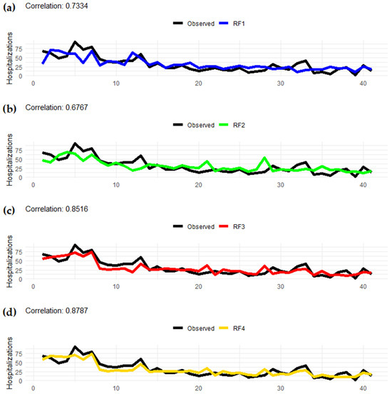 Figure 3 shows a comparison between the observed values of asthma hospitalizations (black line) and the values predicted by the four RF models: RF1 (without lagged variables), RF2 (with lagged climate and pollution variables, but without the variable hospitalization with lag 1), RF3 (with lagged climate and pollution variables, in addition to the variable hospitalization with lag 1), and RF4 (including both lagged and non-lagged variables, including hospitalization with lag 1). Each figure (Figure 3a–d) shows the correspondence between the models’ predictions and the observed time series, and also indicates the correlation between the predicted and observed values.