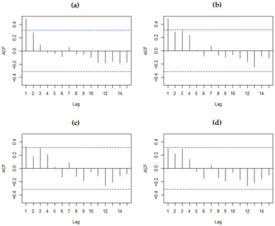 Autocorrelation of the residuals from random forest models 1 (RF1—(a)), 2 (RF2—(b)) 3 (RF3—(c)), and 4 (RF4—(d)).