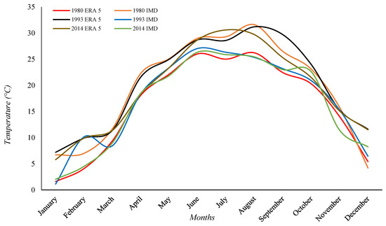 Comparison of monthly temperatures from ERA5 reanalysis data and IMD observations for 1980, 1993, and 2014.