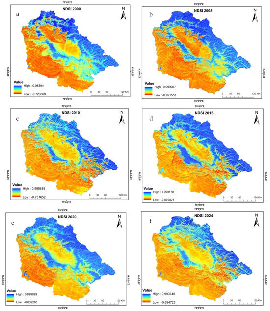 (a–f) These maps capture the evolving intensity and spatial dynamics of snow cover. The declining NDSI values post-2010 highlight the cumulative effects of rising temperatures, while the localized peaks in 2015 and 2020 hint at potential short-term climatic anomalies.