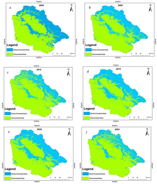 (a–f) The contrast between snow-covered and uncovered areas over time reveals the encroachment of barren zones into previously snow-dense regions. The persistence of high-altitude snowpacks amidst broader declines highlights their critical role as natural water reservoirs.